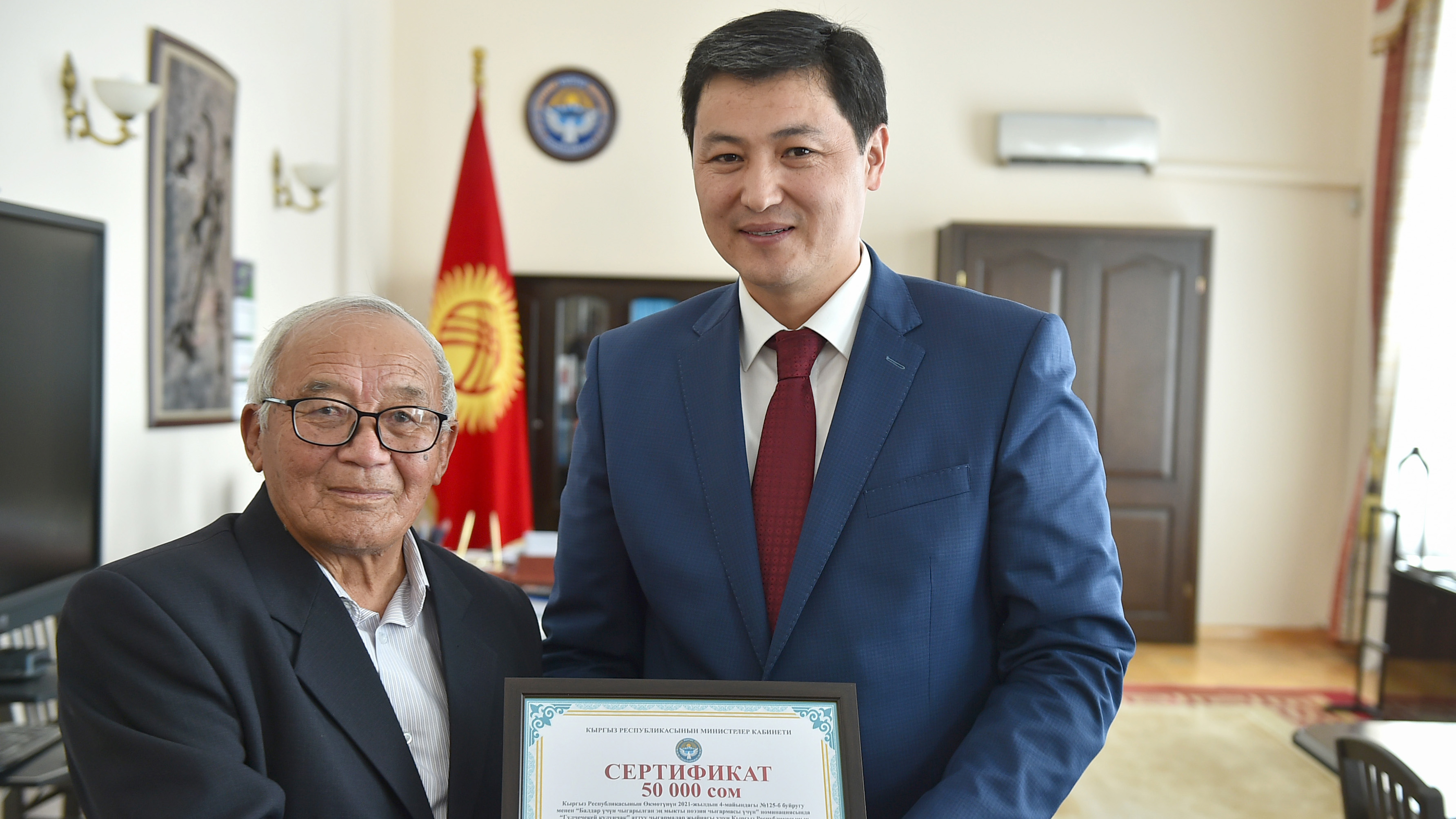 Министрлер Кабинетинин башчысы жазуучуларды татыктуу сыйлыгы менен куттуктап, кыргыз балдар адабиятынын өнүгүүсүнө кошкон өзгөчө салымын белгиледи.