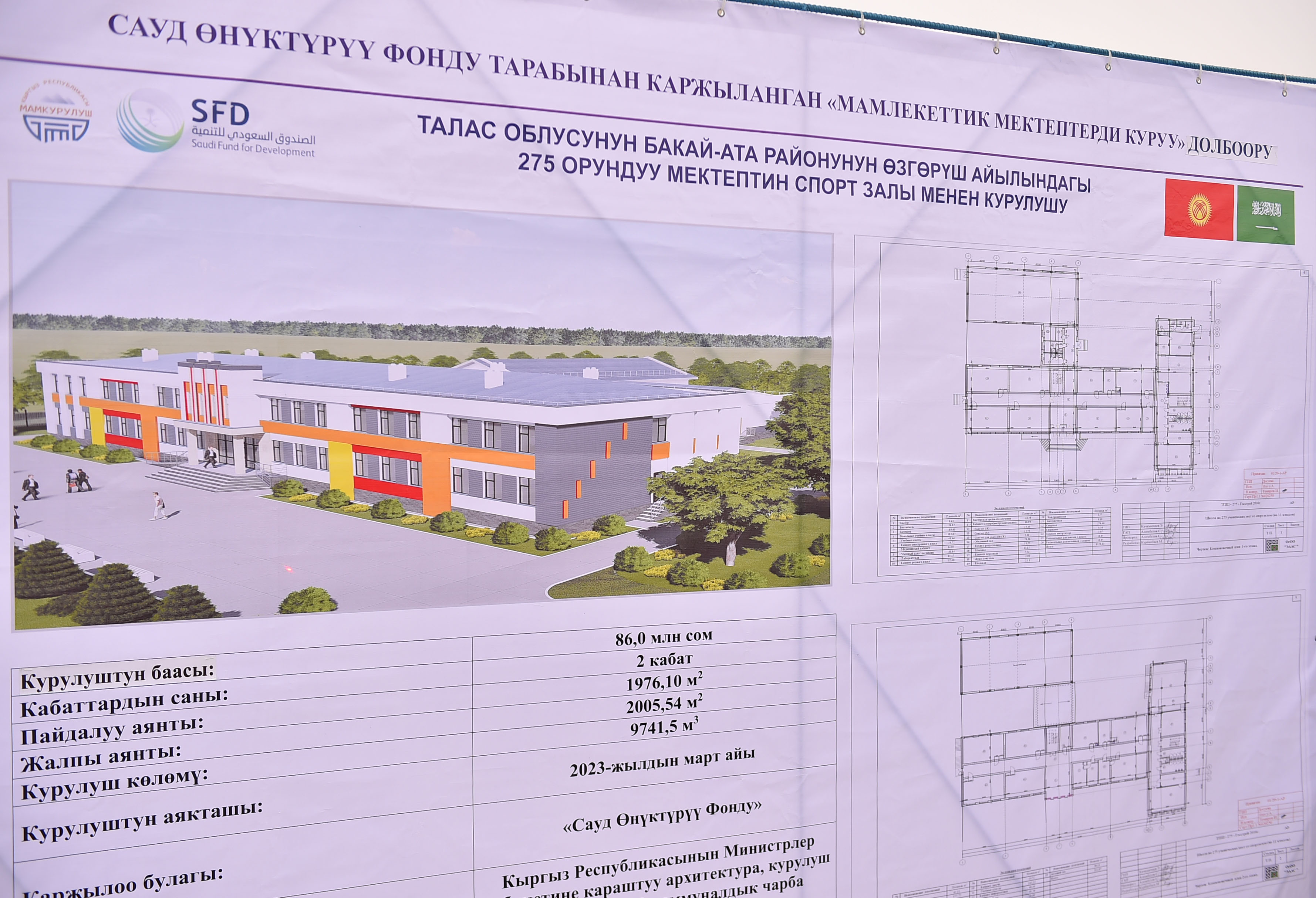 Долбоордук документация боюнча жалпы наркы 86 млн сомдук долбоор 18 айда бүткөрүлмөкчү, анда спорт аянтчасы, өзүнчө отказан жана ашкана курулат. Долбоор Сауд өнүктүрүү фонду тарабынан каржыланат.