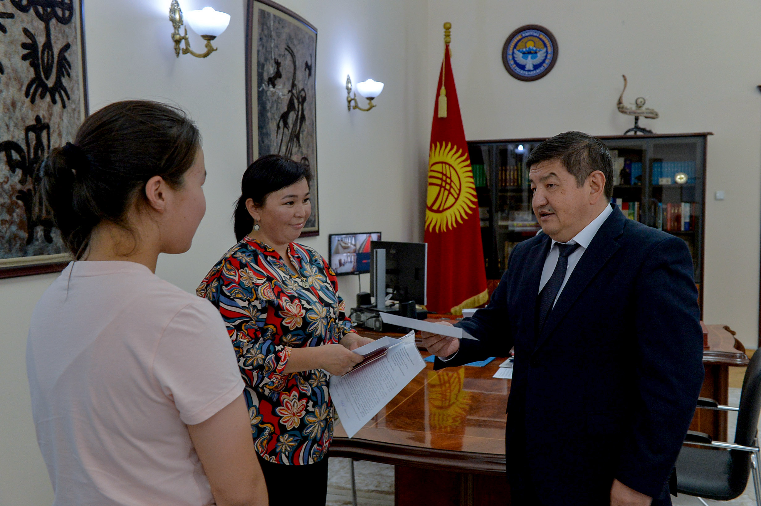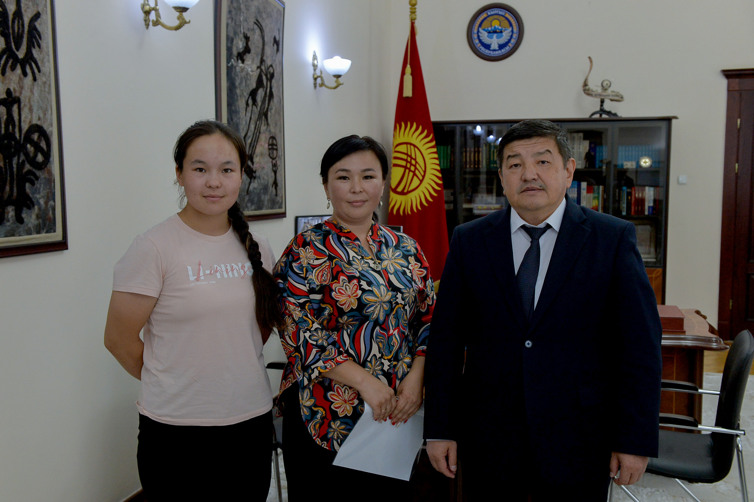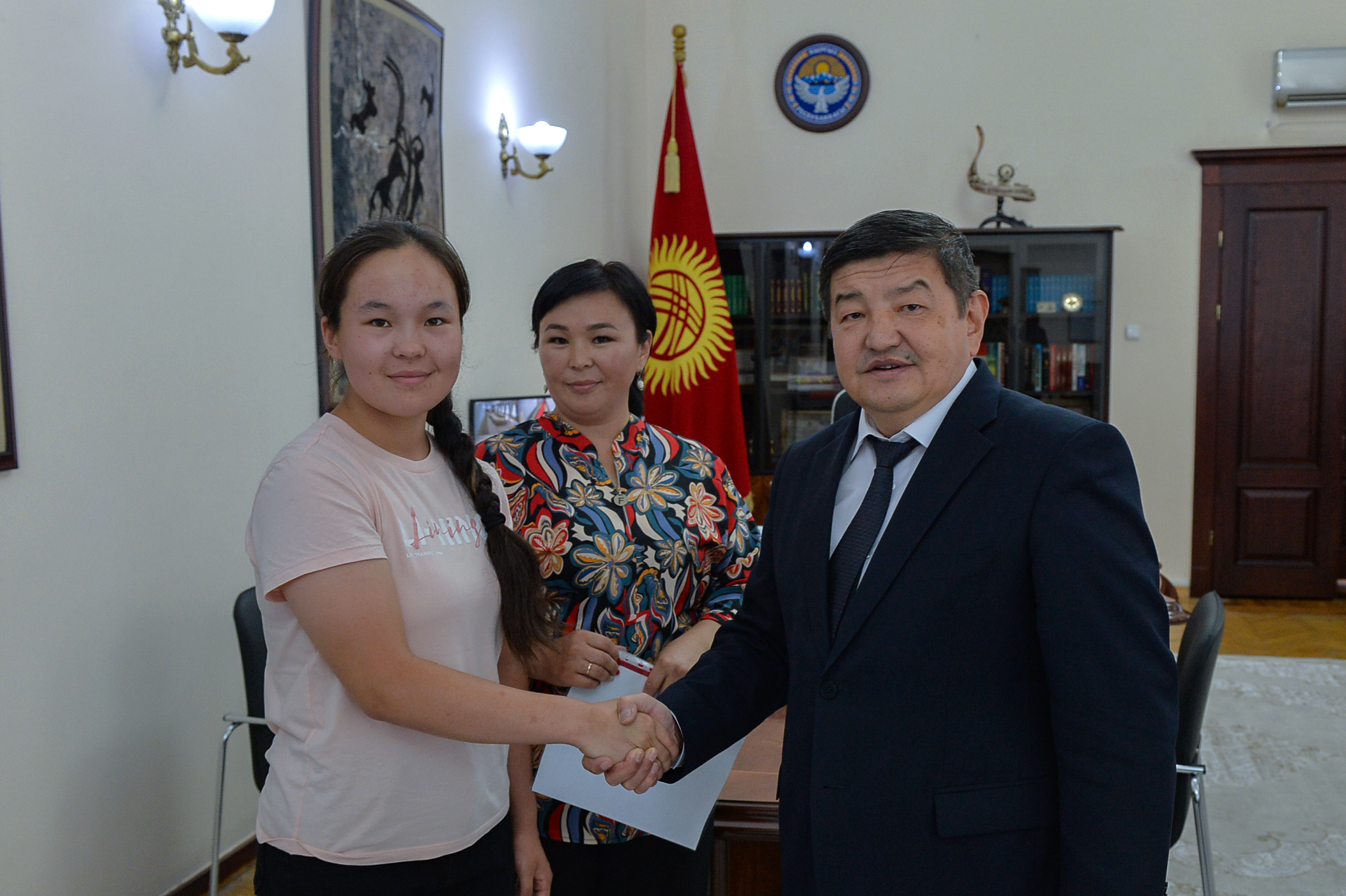 Кыргыз Республикасынын Министрлер Кабинетинин Төрагасы Акылбек Жапаров эркин күрөш боюнча Кыргыз Республикасынын чемпиону, орто мектептин 9-классынын окуучусу Элина Бакытова менен жолугушту.