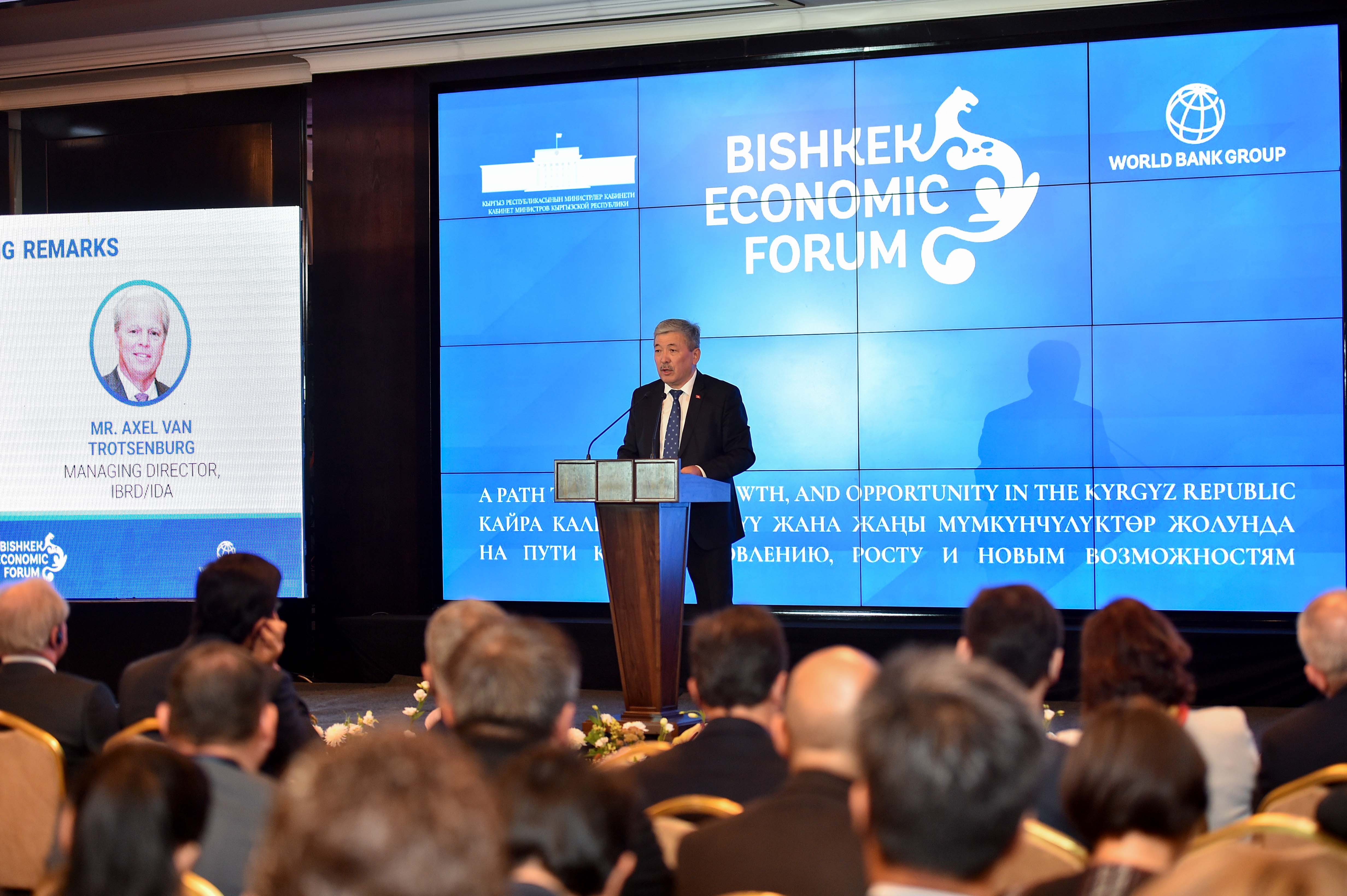 Кыргыз Республикасынын Министрлер Кабинетинин Төрагасынын биринчи орун басары Адылбек Касымалиев Дүхйнөлүк банктын колдоосунда уюштурулган «Калыбына келтирүү, өсүү жана жаңы мүмкүнчүлүктөргө карай жол» аталышындагы Бишкек экономикалык форумунун ачылышына катышты.