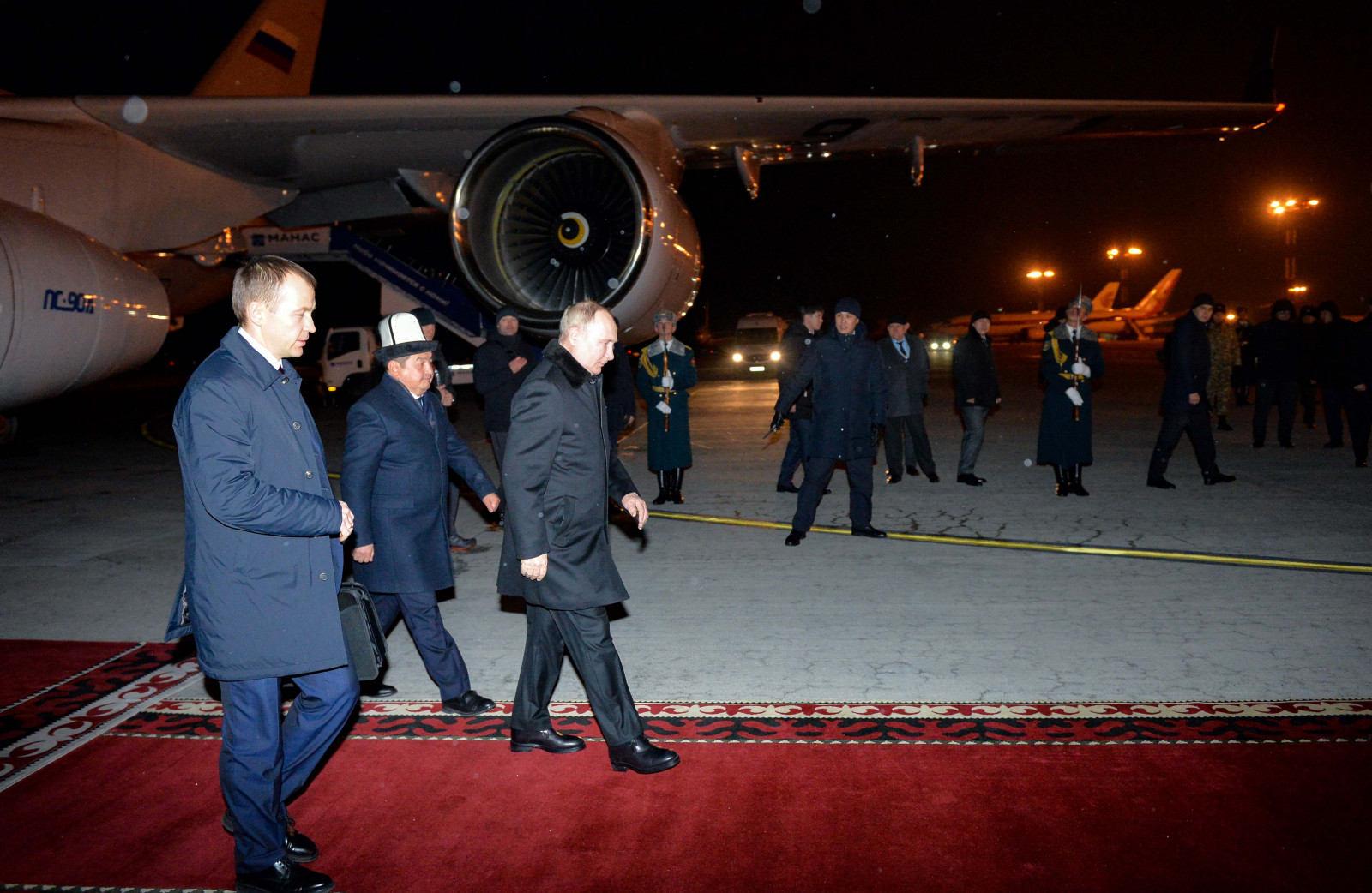 «Манас» Эл аралык аэропортунда Россия Федерациясынын Президенти Владимир Путинди Кыргыз Республикасынын Министрлер Кабинетинин Төрагасы — Кыргыз Республикасынын Президентинин Администрациясынын Жетекчиси Акылбек Жапаров тосуп алды.