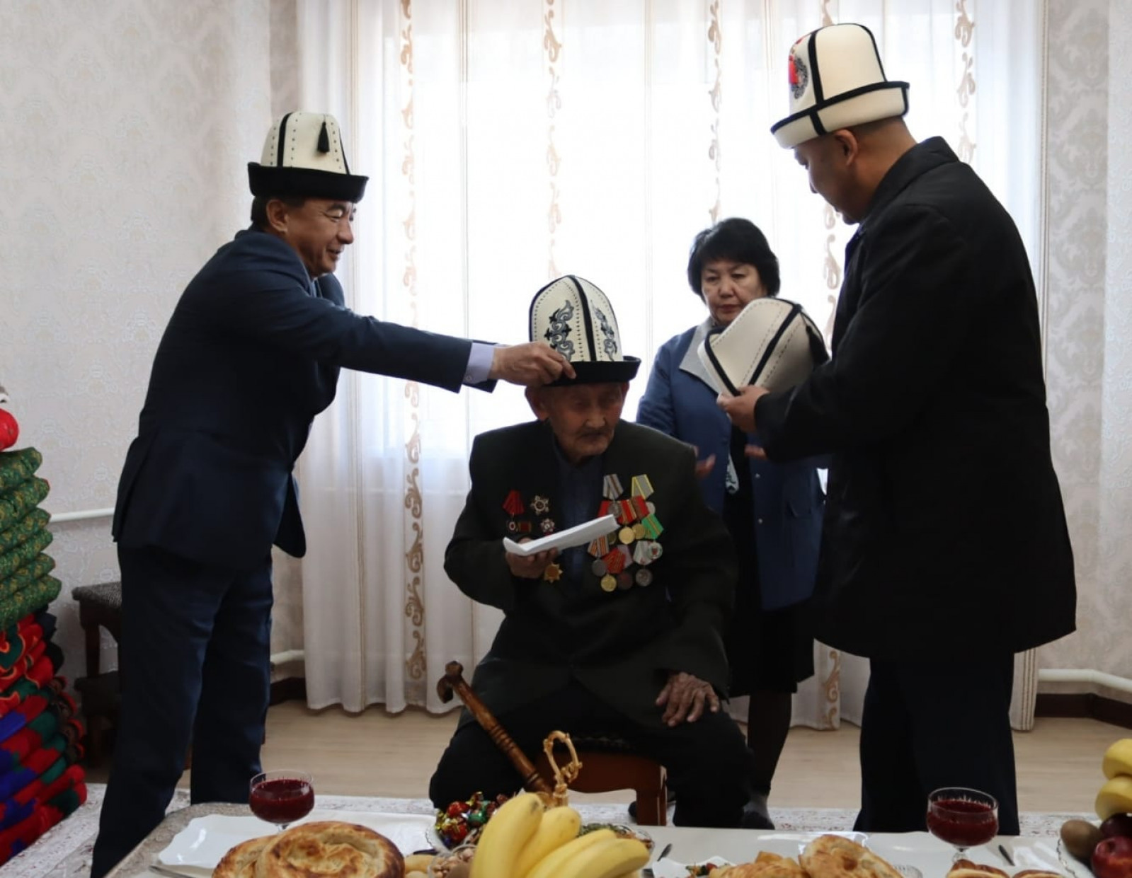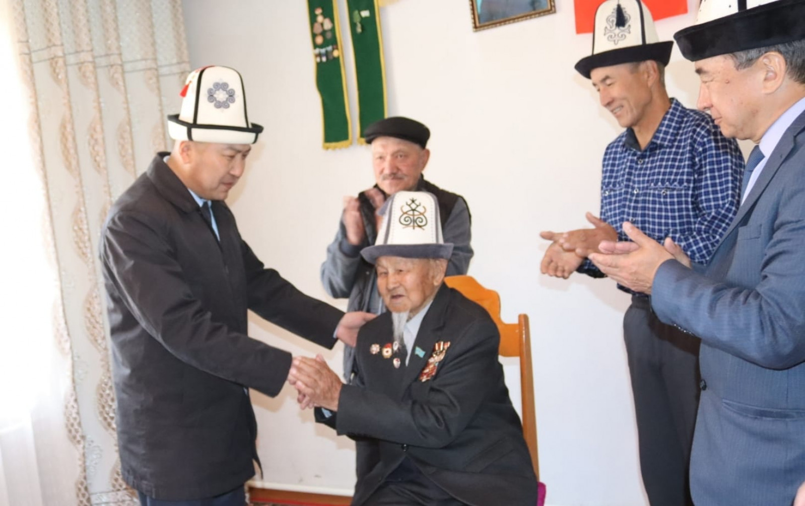 Өлкө башчысынын белегин Президенттин Нарын облусундагы ыйгарым укуктуу өкүлү Алтынбек Эргешов дарегине жеткирип, ардагерлерди майрамы менен куттуктады.