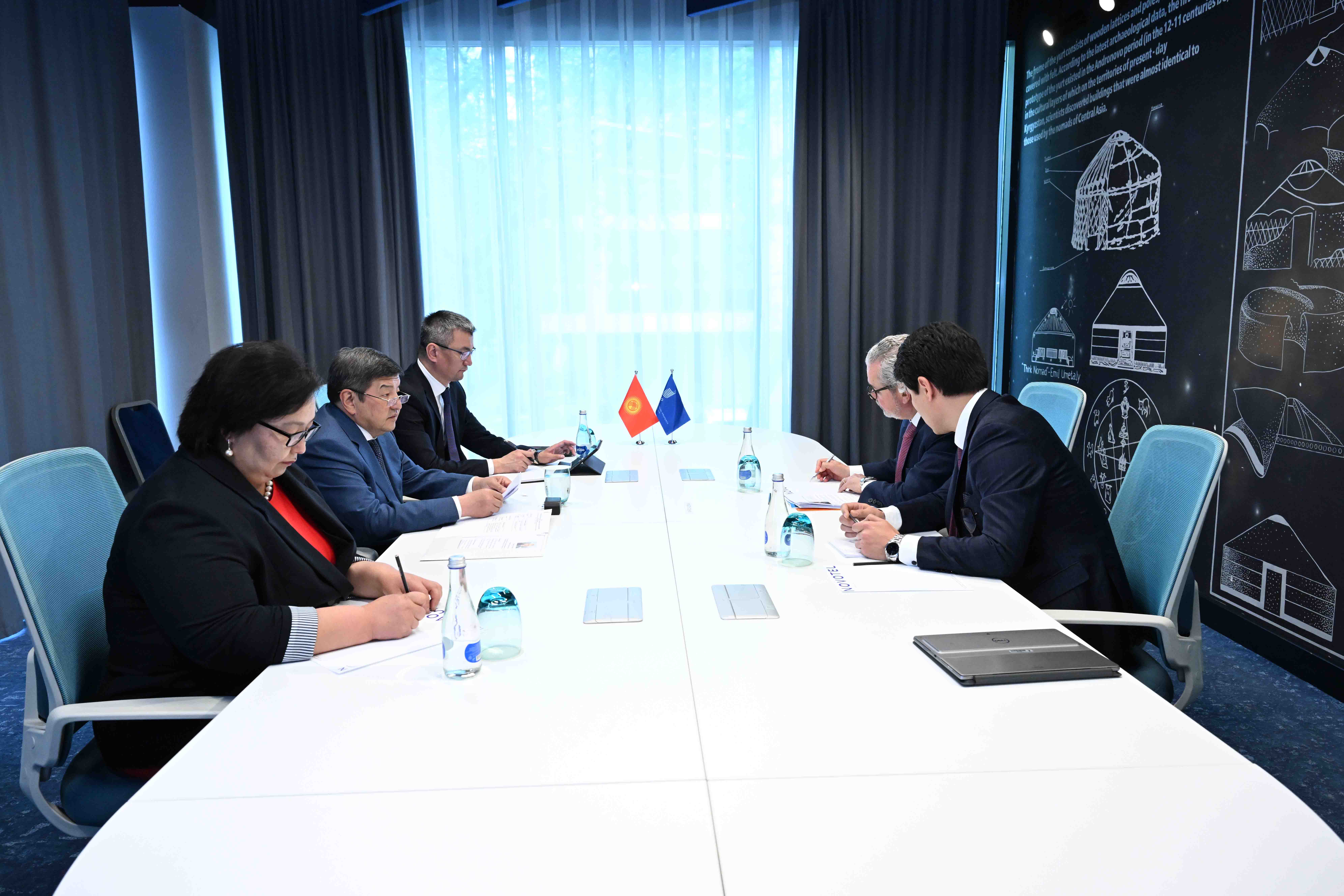 “Интеллектуалдык менчик жана өлкөнүн аймактарын өнүктүрүү үчүн инновациялар: ийгиликтүү келечекке бирге” аттуу Улуттук форумдун алкагында Кыргыз Республикасынын Министрлер Кабинетинин Төрагасы-Президенттин Администрациясынын Жетекчиси Акылбек Жапаров, Интеллектуалдык менчиктин бүткүл дүйнөлүк уюмунун (ИМБДУ) башкы директорунун жардамчысы Марко Алеман менен жолугушту.