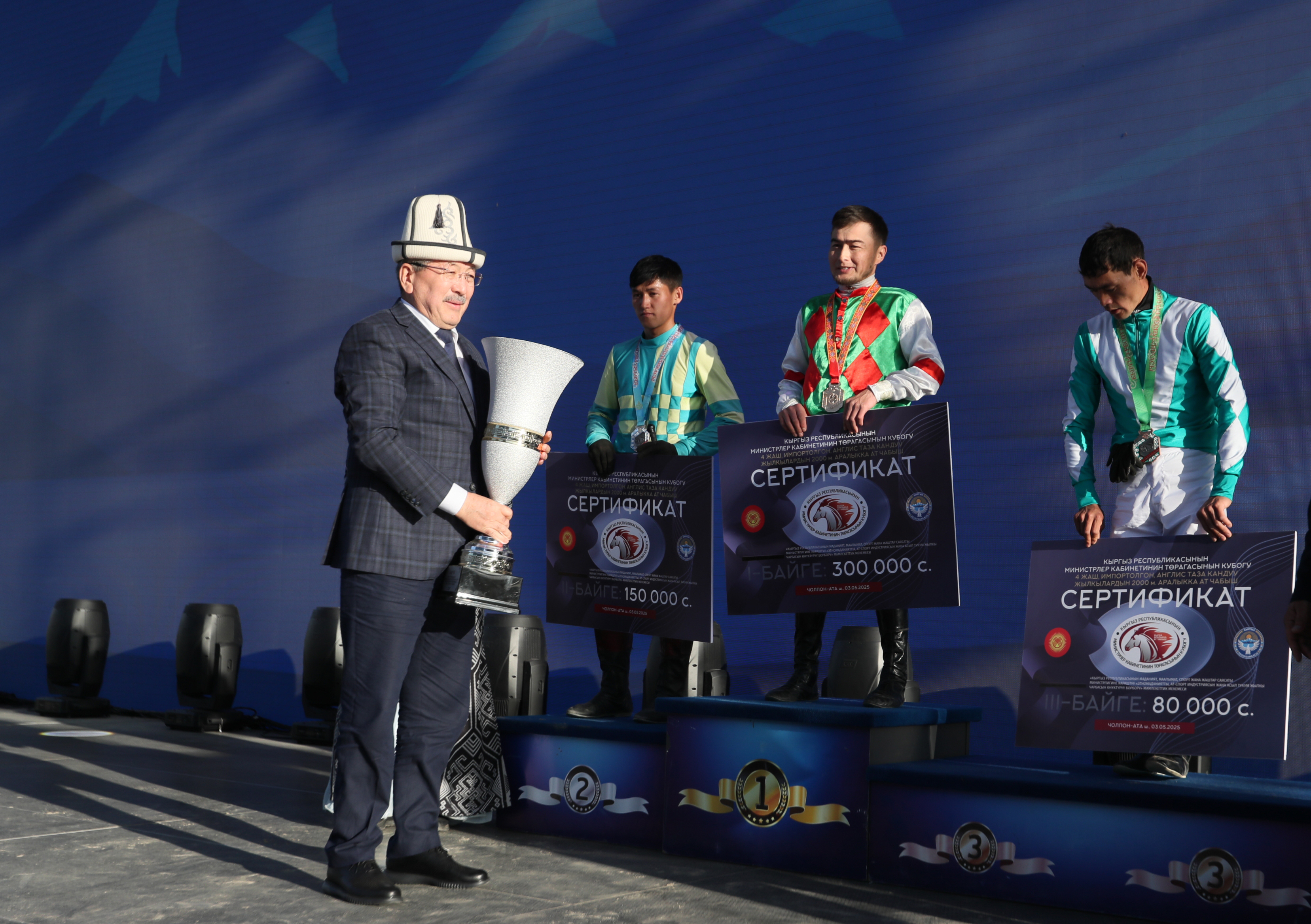 Жеңүүчүлөргө акчалай сертификаттарды МинКаб Төрагасы өзү тапшырып, бул чабуу жакшы салтка айланып, Кыргызстанда ат спортунун мындан ары өнүгүшүнө салым кошот деген ишенимин билдирди.