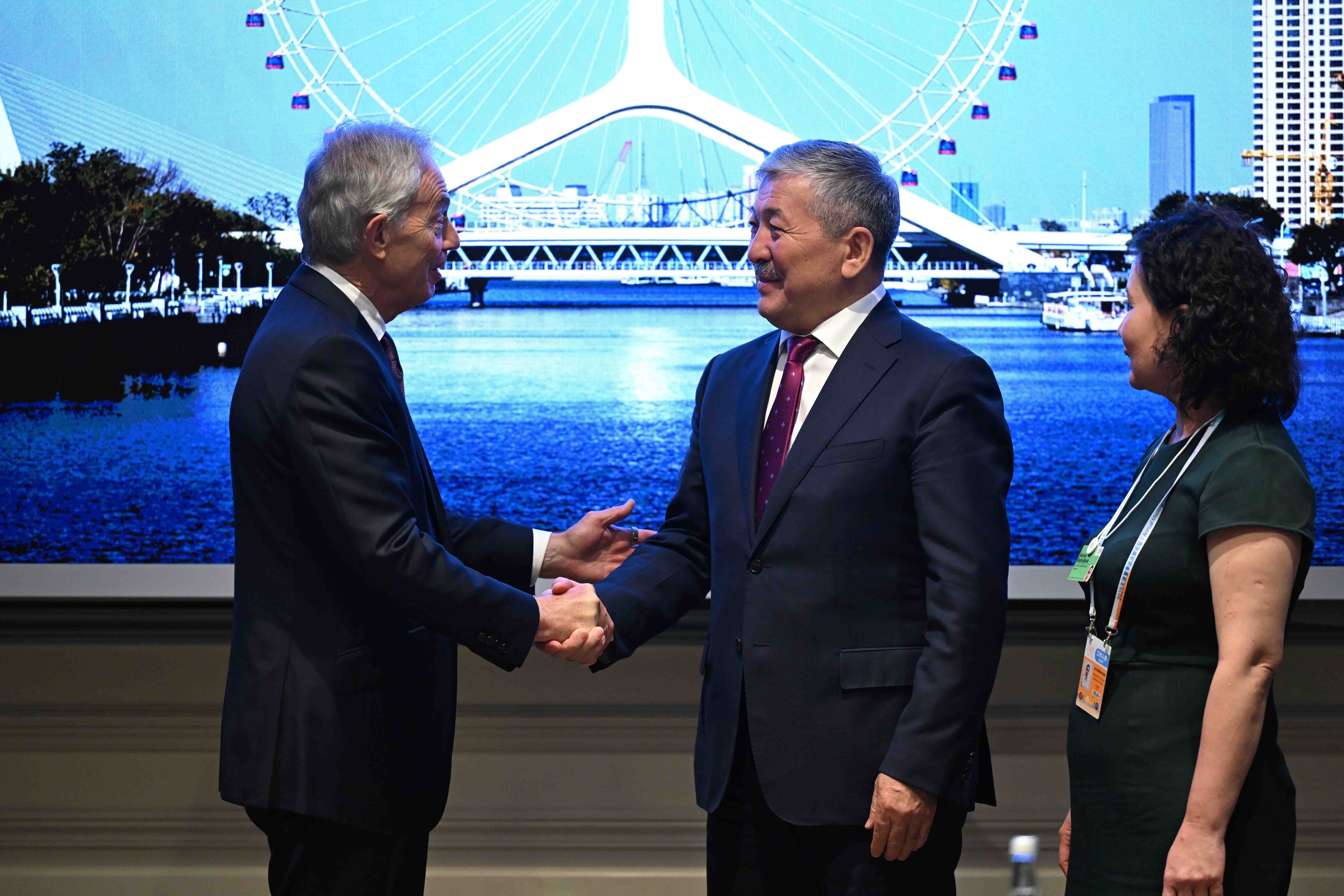 Кытай Эл Республикасы, Тяньцзинь, 2025-жылдын 25-июну – Кыргыз Республикасынын Министрлер Кабинетинин Төрагасы – Кыргыз Республикасынын Президентинин Администрациясынын Жетекчиси Адылбек Касымалиев “Жайкы Давос – 2025” Дүйнөлүк экономикалык форумунун жылдык жыйынына катышуусунун алкагында Улуу Британиянын мурдагы премьер-министри Тони Блэр менен жолукту.
