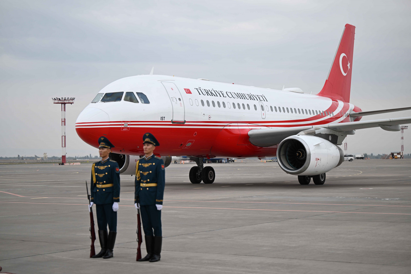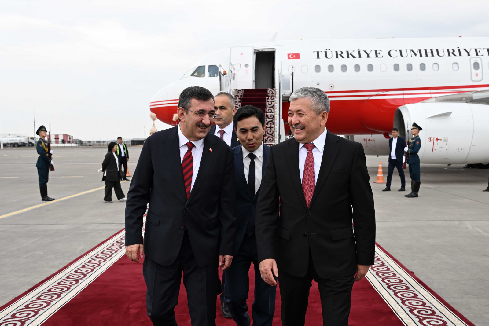 Аэропортто эки мамлекеттин туулары илинип, Ардактуу кароол ротасы тизилип, килем төшөлдү.