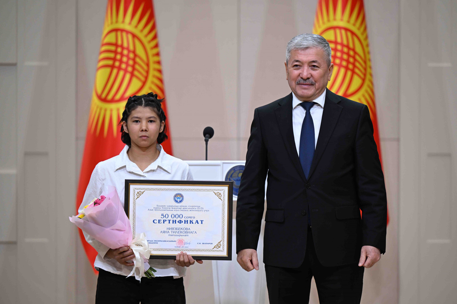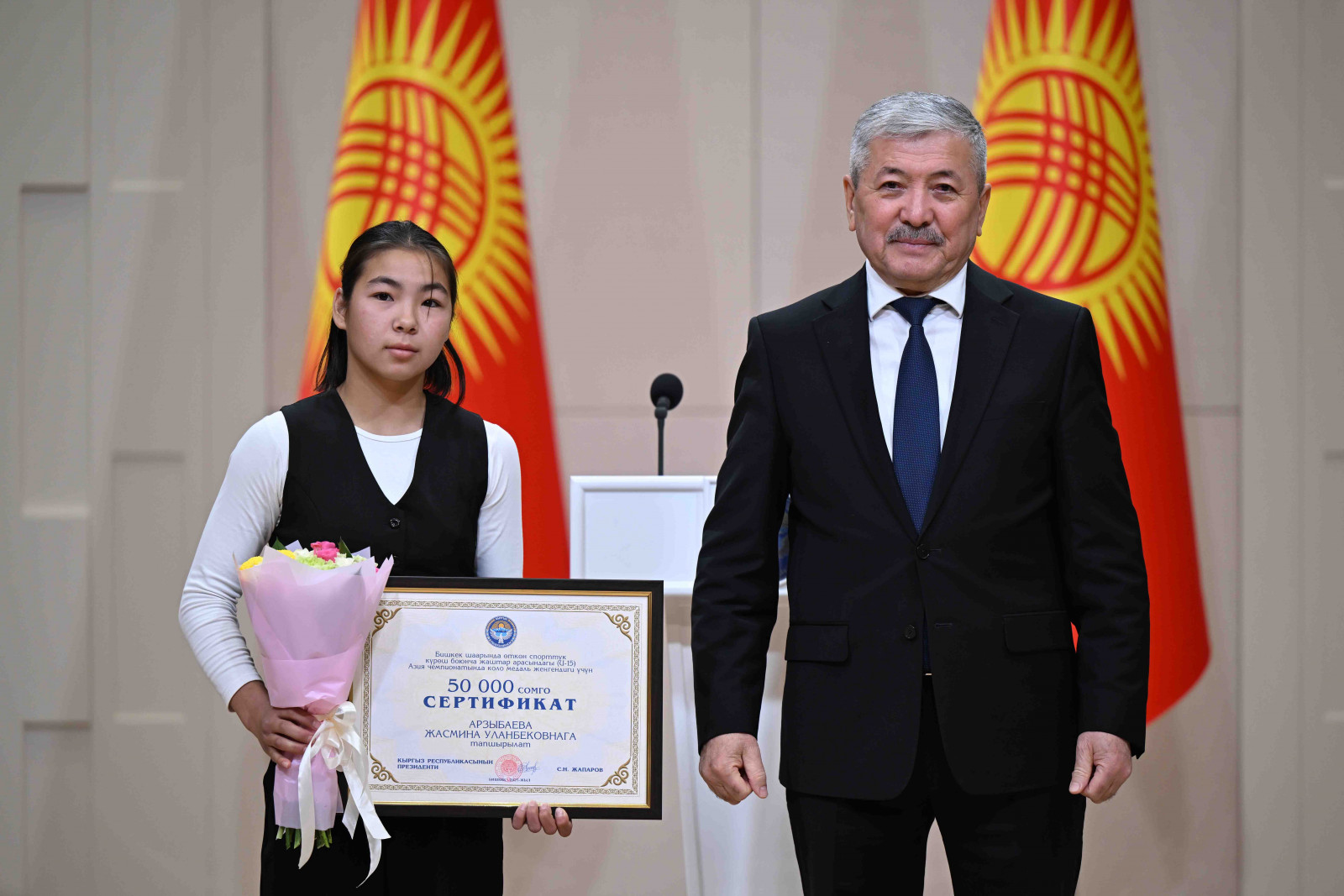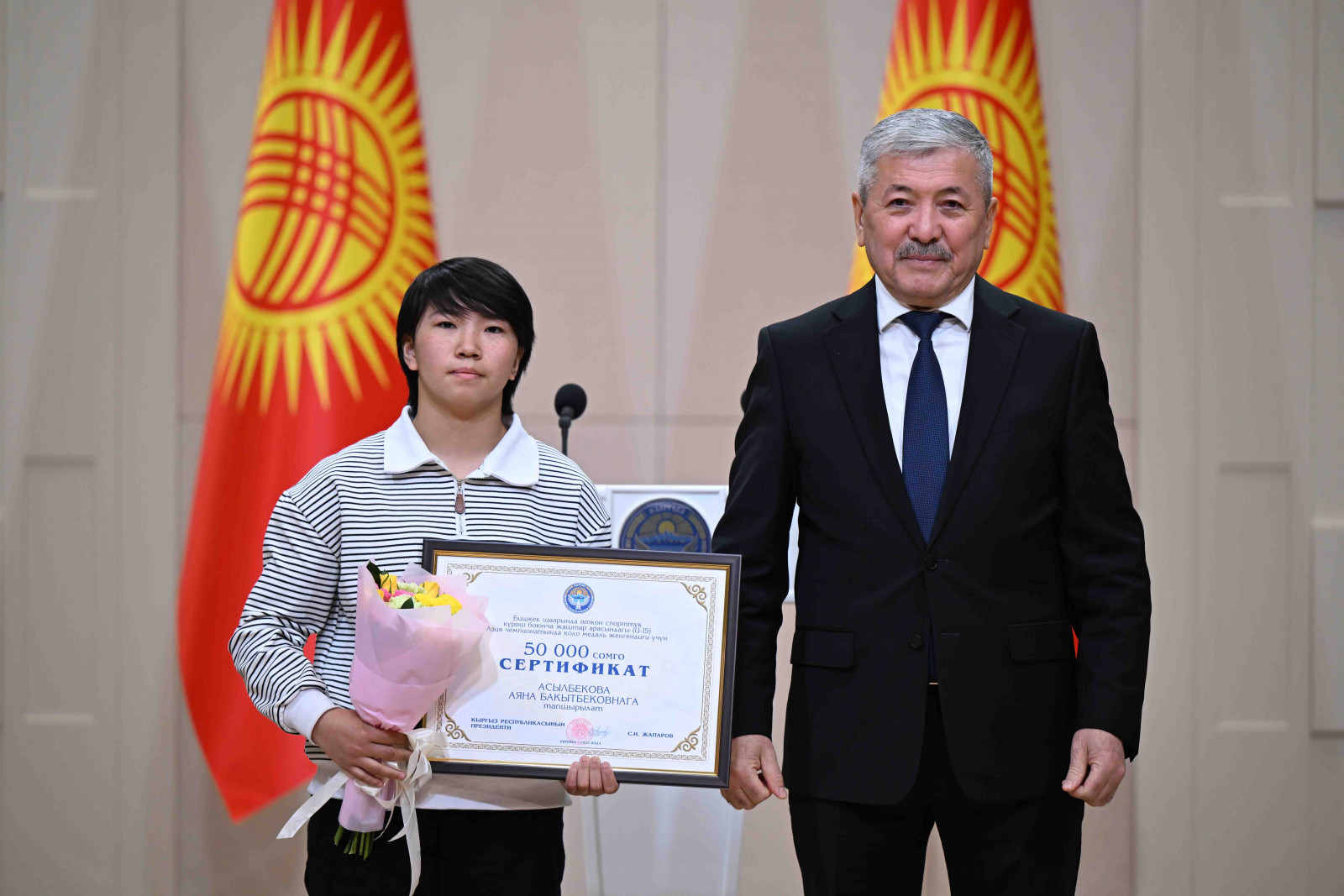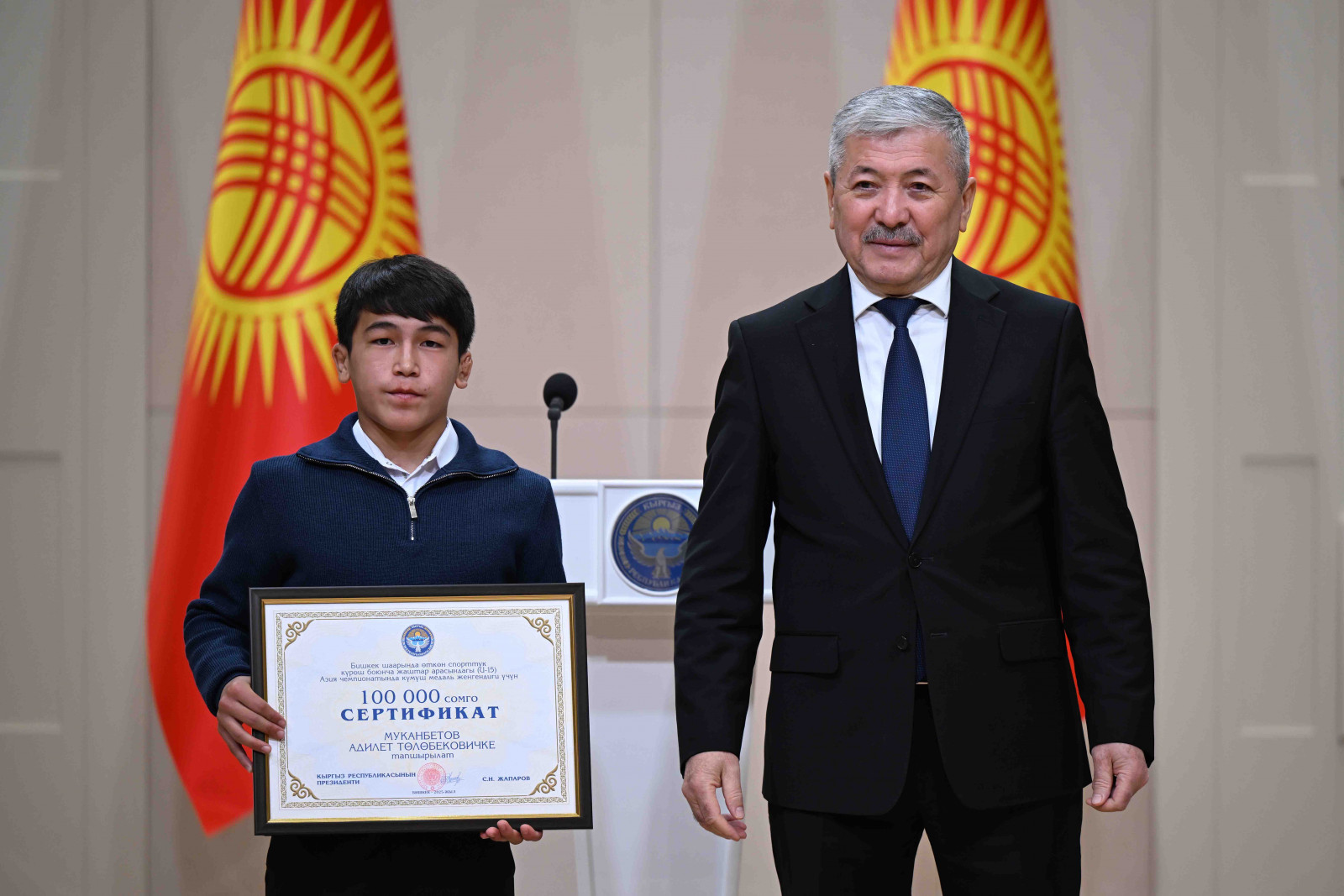 Бишкек, Ынтымак Ордо, 2025-жылдын 14-октябрь - Кыргыз Республикасынын Министрлер Кабинетинин Төрагасы - Кыргыз Республикасынын Президентинин Администрациясынын Жетекчиси Адылбек Касымалиев Кыргыз Республикасынын Президентинин атынан грек-рим, эркин жана кыз-келиндер күрөшү боюнча 15 жана 20 жашка чейинки спортчулар арасындагы Азия чемпионатынын жеңүүчүлөрүнө сертификаттарды тапшырды.