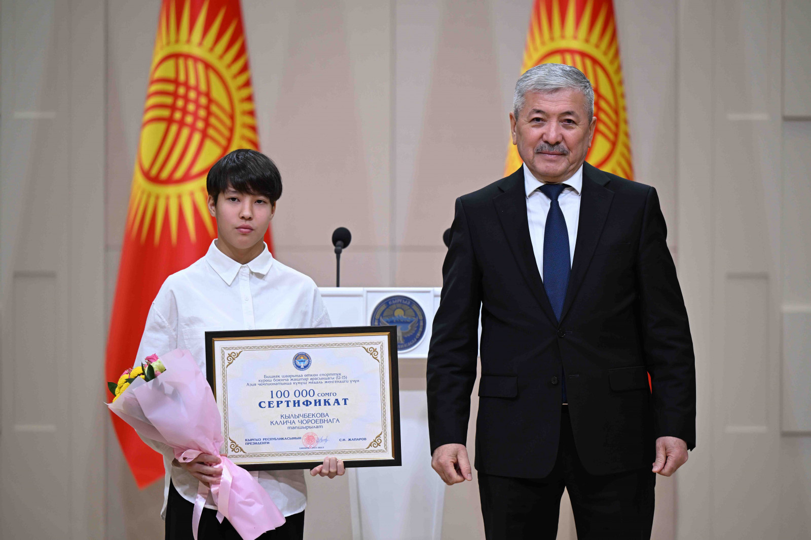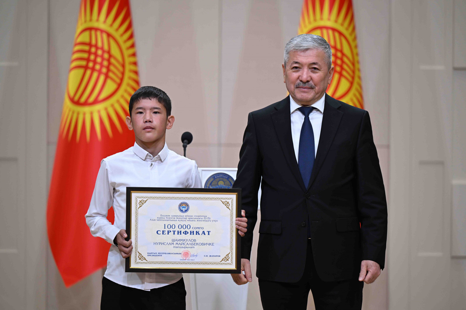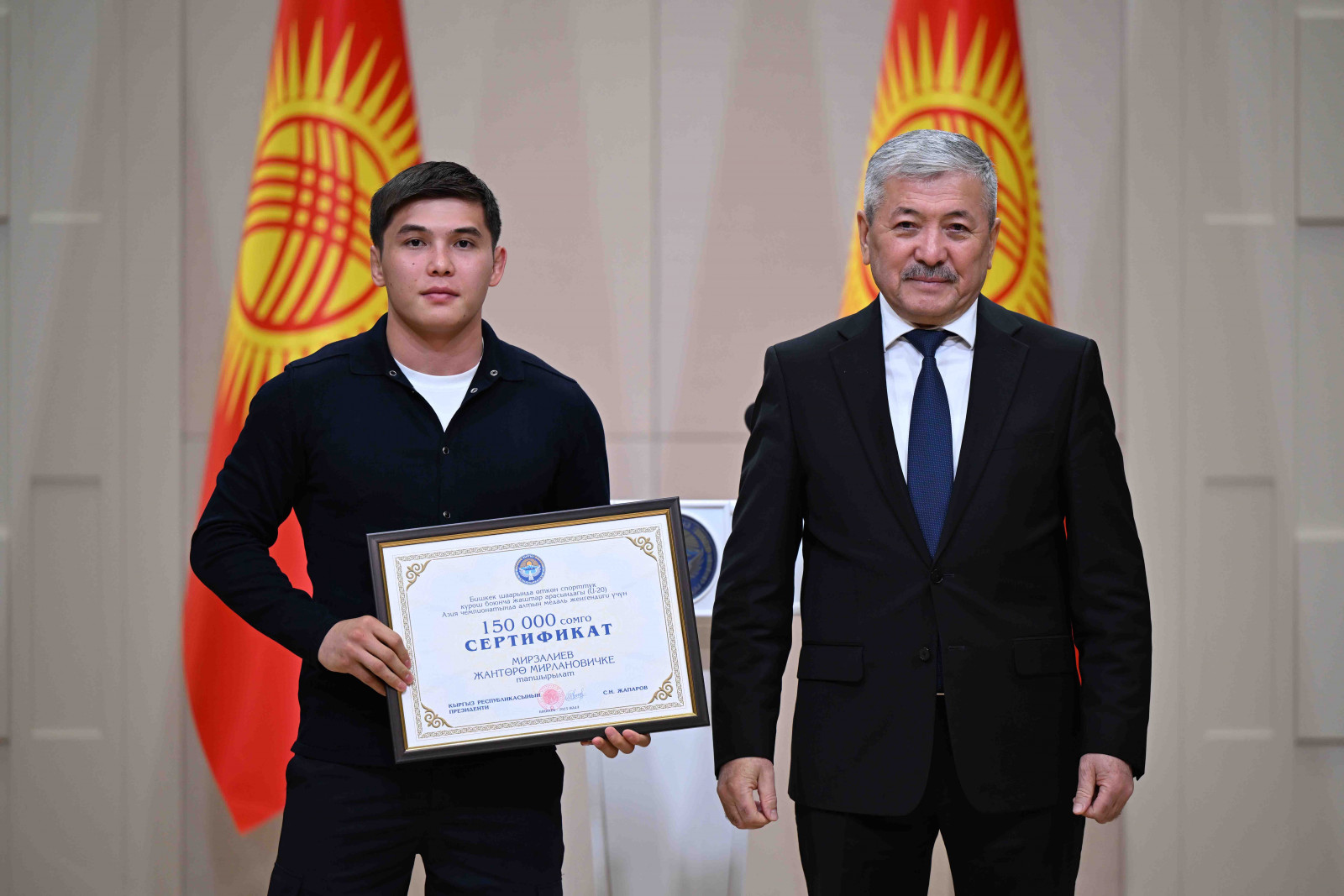 Бишкек, Ынтымак Ордо, 2025-жылдын 14-октябрь - Кыргыз Республикасынын Министрлер Кабинетинин Төрагасы - Кыргыз Республикасынын Президентинин Администрациясынын Жетекчиси Адылбек Касымалиев Кыргыз Республикасынын Президентинин атынан грек-рим, эркин жана кыз-келиндер күрөшү боюнча 15 жана 20 жашка чейинки спортчулар арасындагы Азия чемпионатынын жеңүүчүлөрүнө сертификаттарды тапшырды.