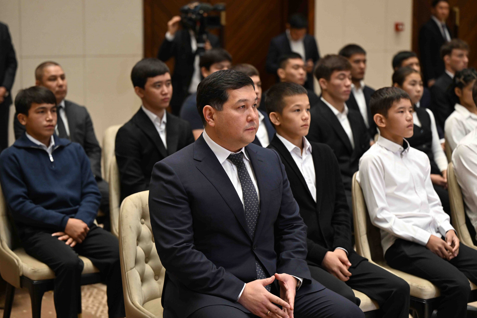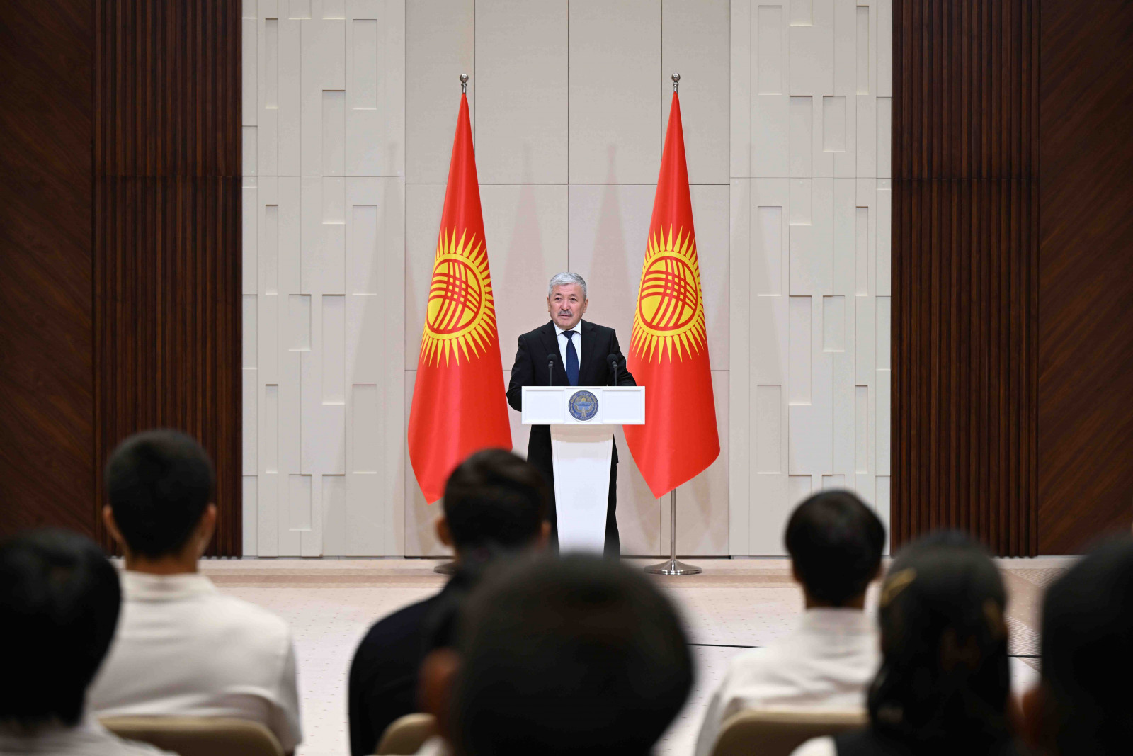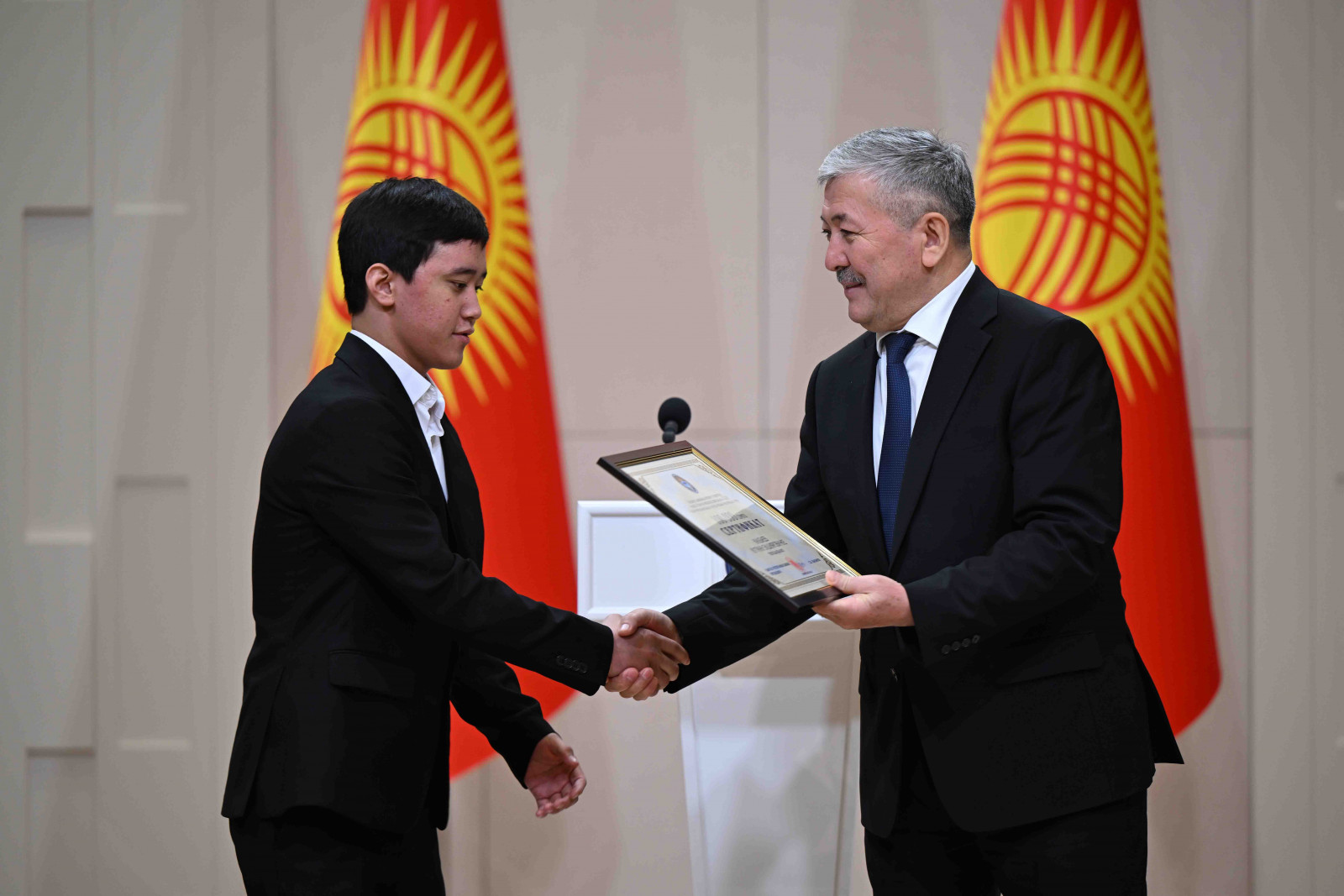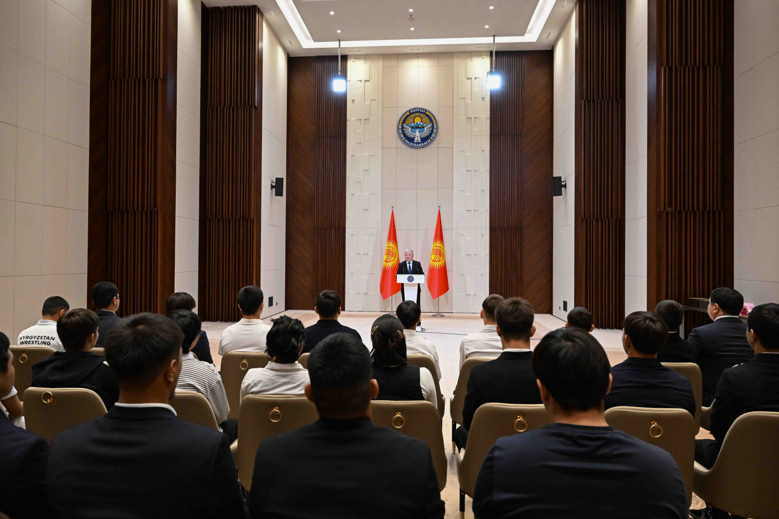 Бишкек, Ынтымак Ордо, 2025-жылдын 14-октябрь - Кыргыз Республикасынын Министрлер Кабинетинин Төрагасы - Кыргыз Республикасынын Президентинин Администрациясынын Жетекчиси Адылбек Касымалиев Кыргыз Республикасынын Президентинин атынан грек-рим, эркин жана кыз-келиндер күрөшү боюнча 15 жана 20 жашка чейинки спортчулар арасындагы Азия чемпионатынын жеңүүчүлөрүнө сертификаттарды тапшырды.