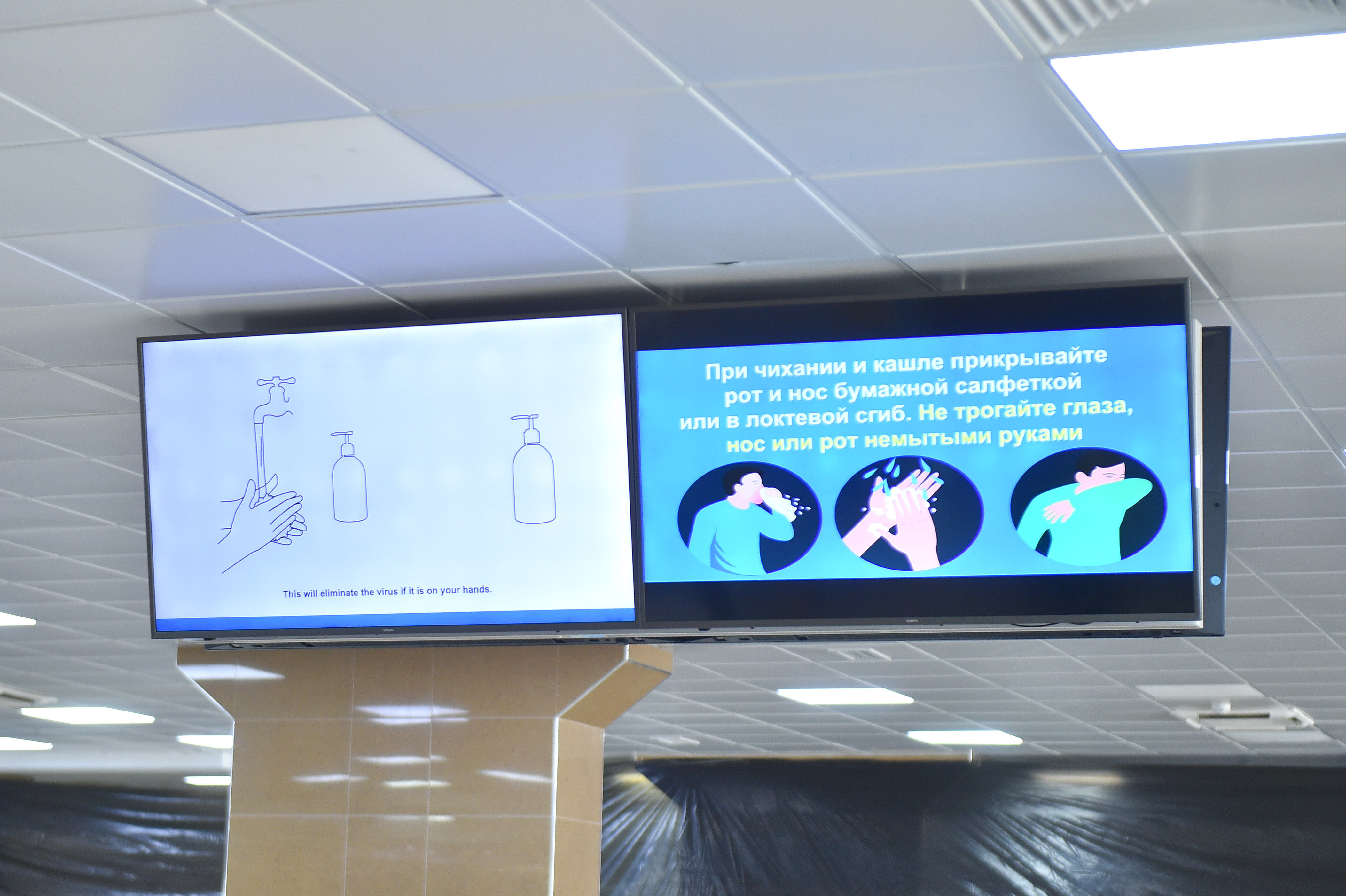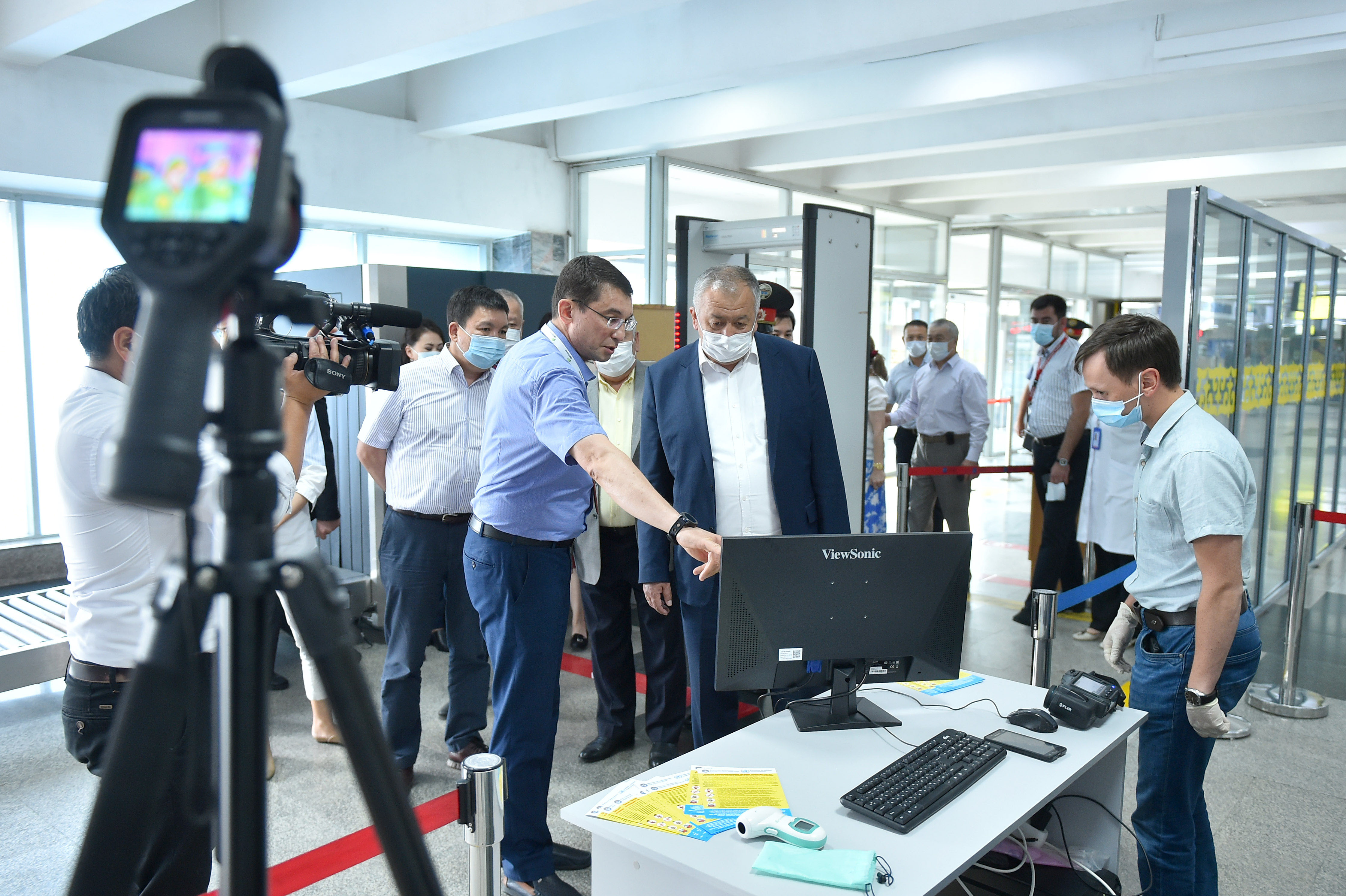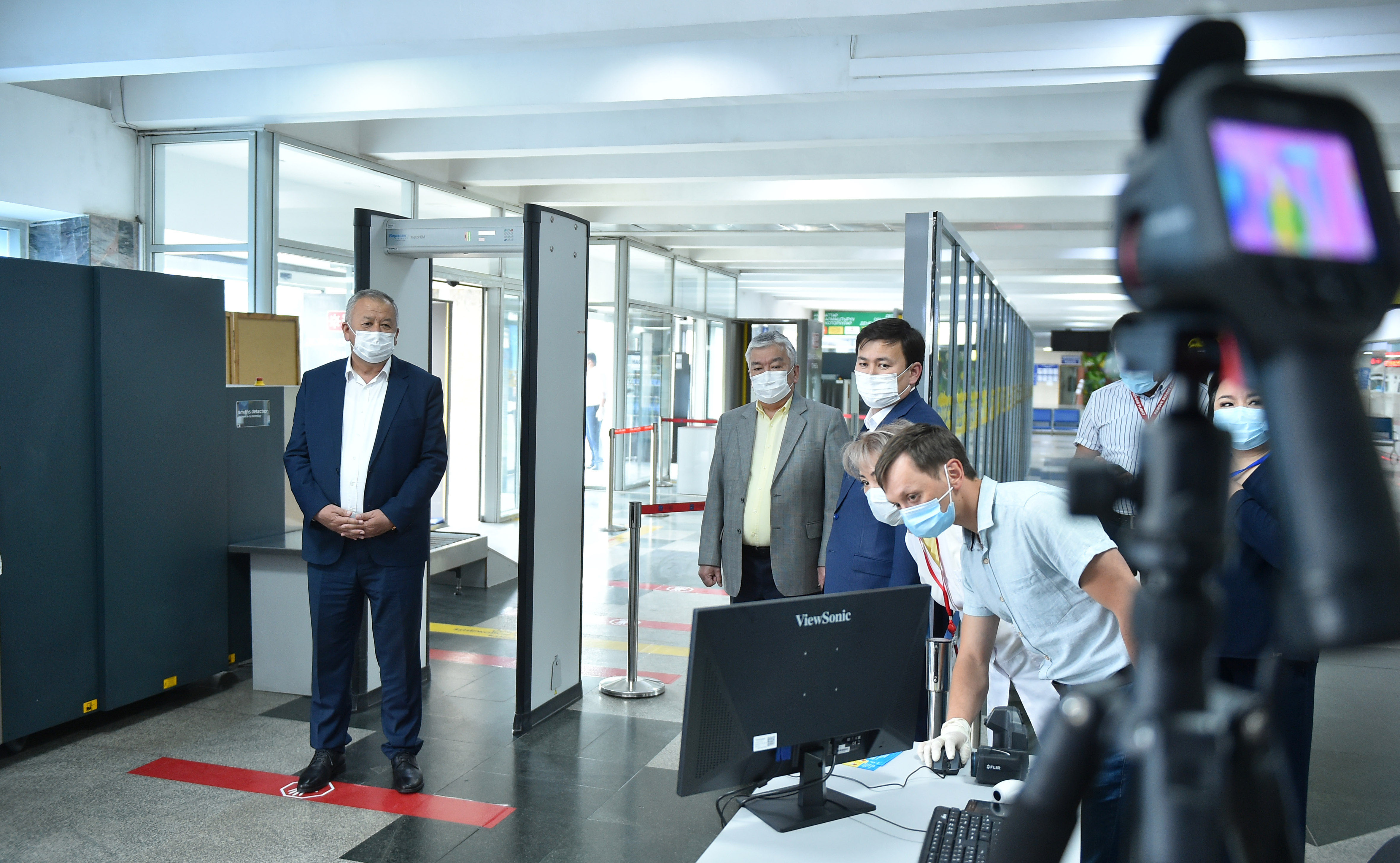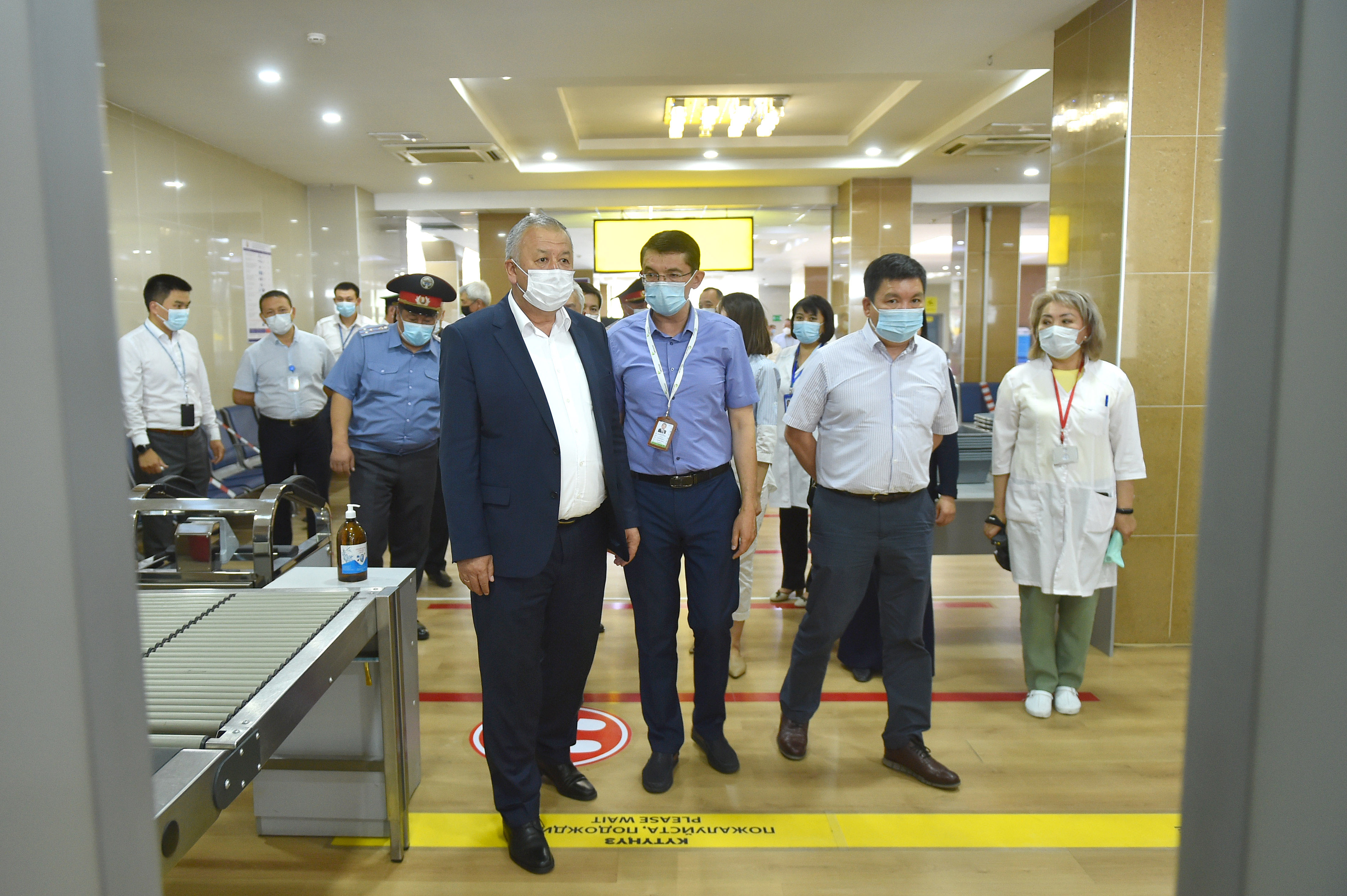 Аэробекеттер имаратынын кире беришинде бардык жүргүнчүлөр жана жүк милдеттүү түрдө дезинфекциялоочу туннелден, термометрдик көзөмөлдөн жана дене табын тепловизордук камералар менен ченөөдөн өткөрүлөт.