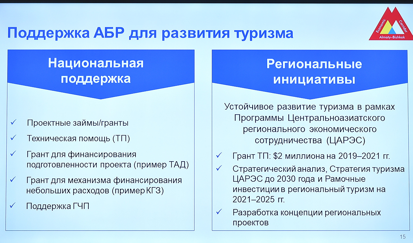 «Мен келгендердин баары - туристтер деген ойдон алысмын. Бирок жок дегенде булардын жарымы биздин өлкөгө эс алуу үчүн келди деген ойдомун. Биз бүгүнкү күндө туризмди өнүктүрүүгө өзгөчө көңүл буруу ниетибиз бар. Туризм ата мекендик экономиканын алдыңкы тармактарынын бири болушу шарт. Эгерде 2019-жылы ИДПдагы туризмдин үлүшү 5% түзсө, 2023-жылга карата бул көрсөткүчтү 7%га чейин жеткирүүнү пландап жатабыз. Бул үчүн, мисалы, өлкөгө кирген туристтерди эсептөөнүн усулун карап чыгуу шарт. Сиздердин сунушуңуздардын негизинде биринчи кезекте көңүл бура турган башка аспектилер дагы бар», -деп Мухаммедкалый Аблыгазиев эл аралык эксперттерге кайрылды.