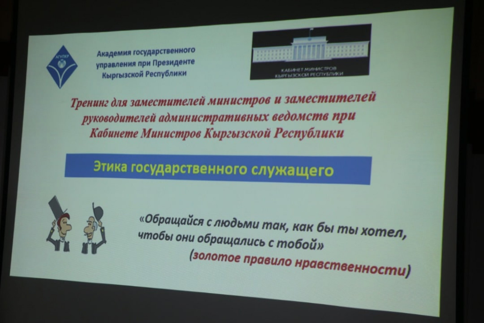C 29 марта по 21 апреля 2022 года в академии государственного управления при Президенте Кыргызской Республики имени Жусупа Абдрахманова проходят тренинги по темам: «Подготовка, представление и защита законопроекта», «Деловой государственный язык», «Эффективное публичное выступление и навыки презентации», «Управление государственными закупками товаров, работ и услуг», «Этика государственного служащего».