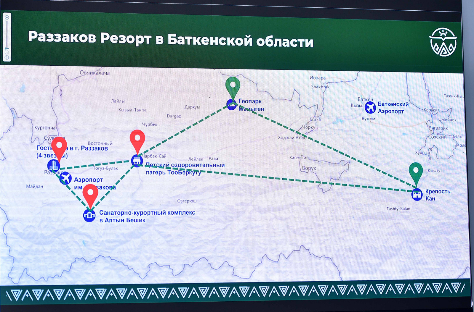 В частности, были представлены проекты гостиничного комплекса уровня 4 звезды в городе Раззаков Баткенской области, санаторно-курортного комплекса и детского оздоровительного лагеря в Баткенской области.