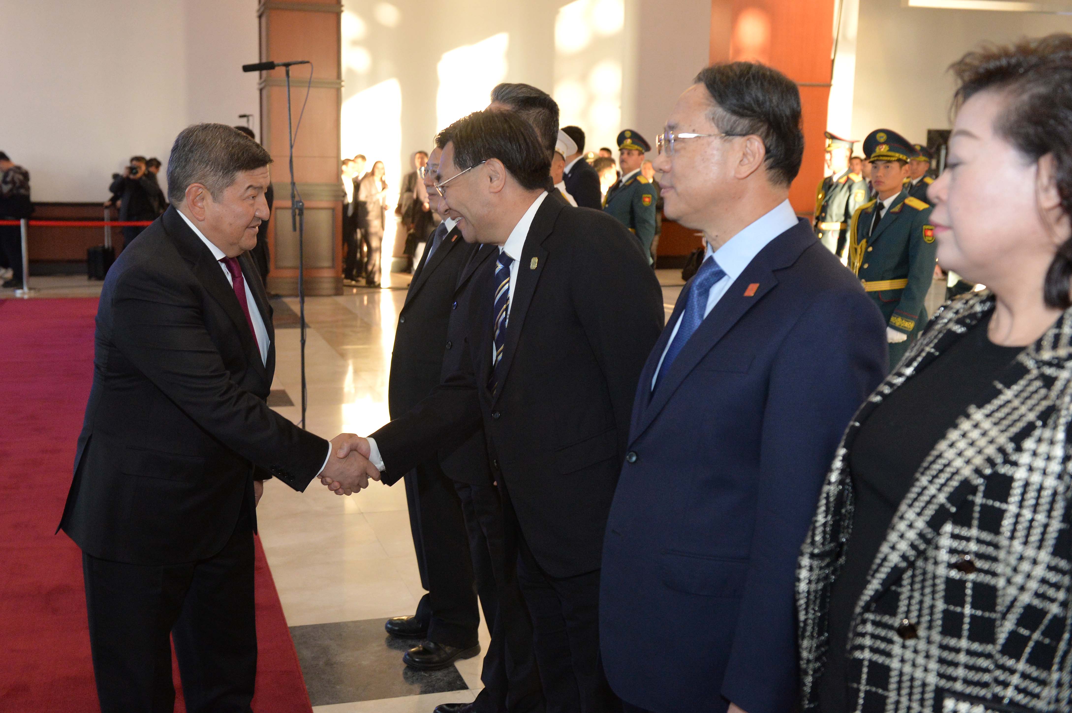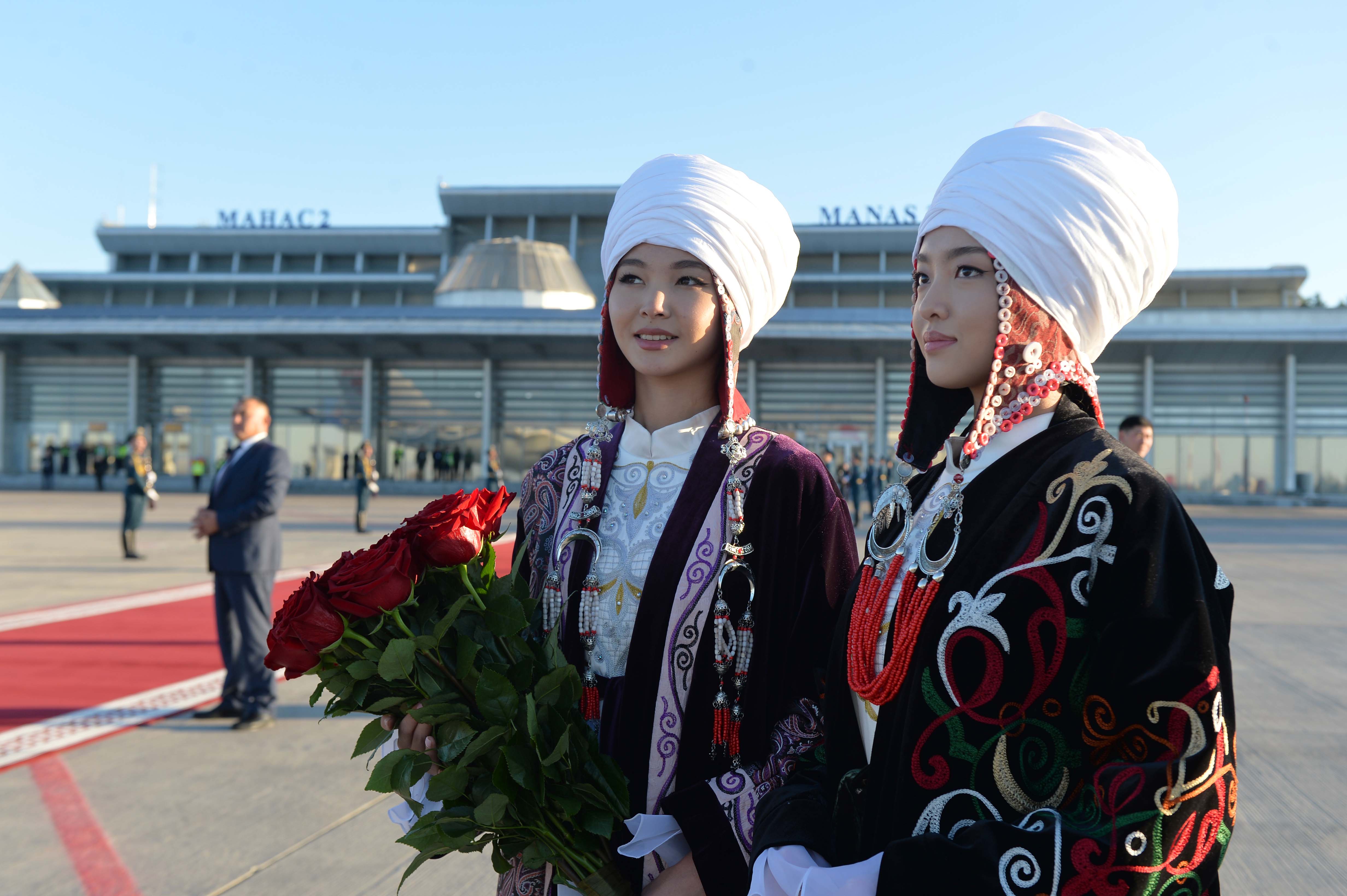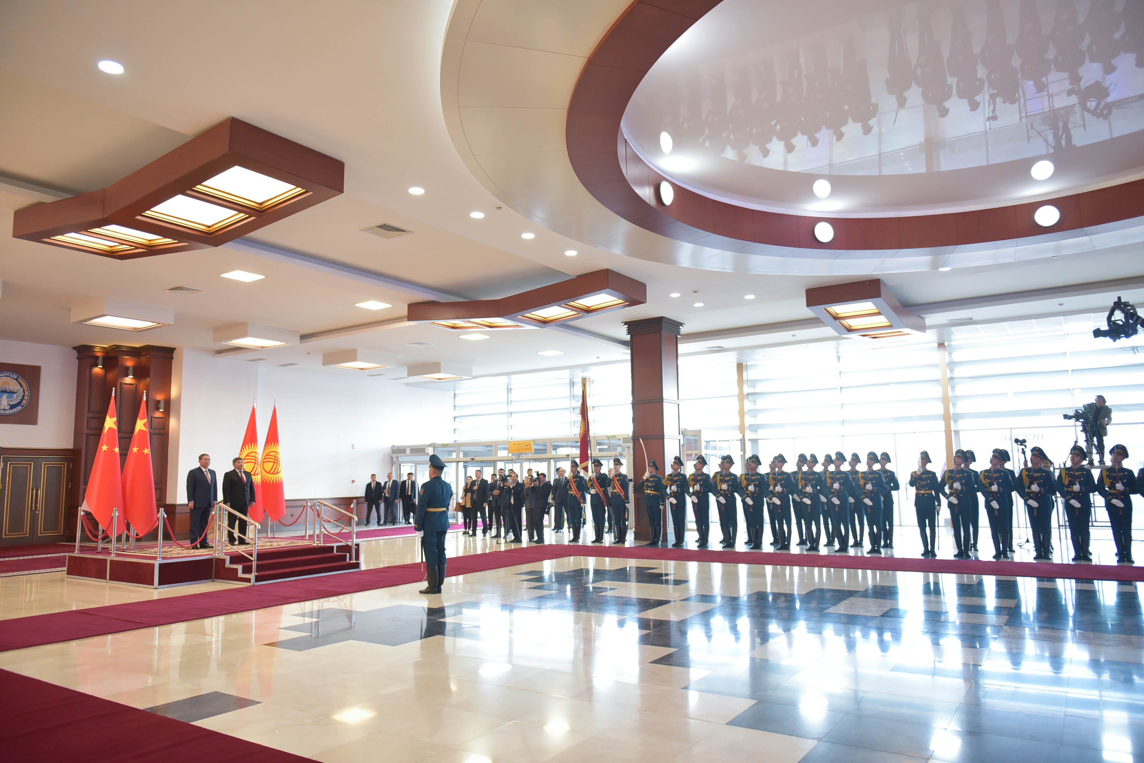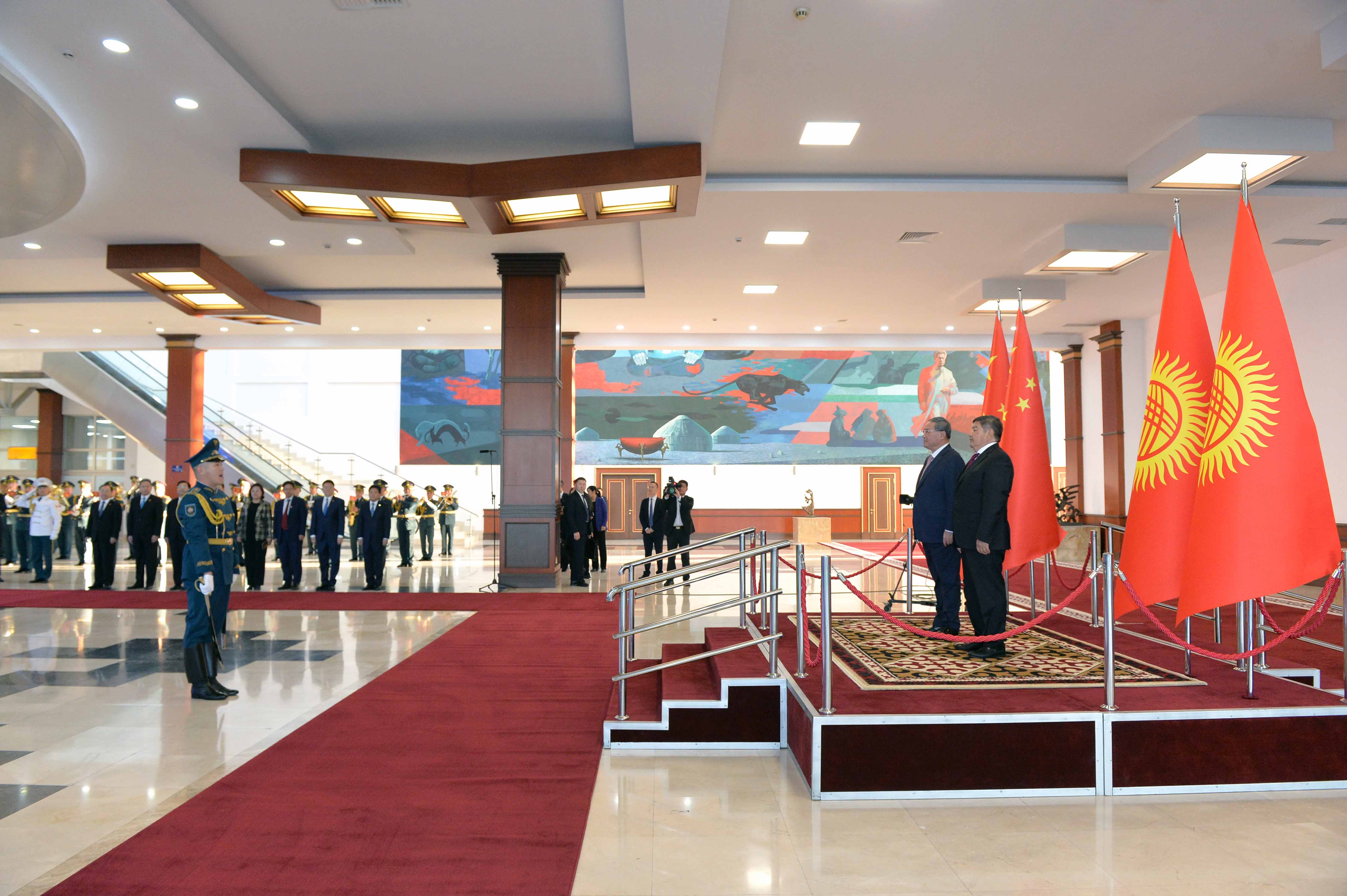 В рамках церемонии встречи высокого гостя в международном аэропорту «Манас» были вывешены государственные флаги Кыргызской Республики и Китайской Народной Республики, выстроен почетный караул.