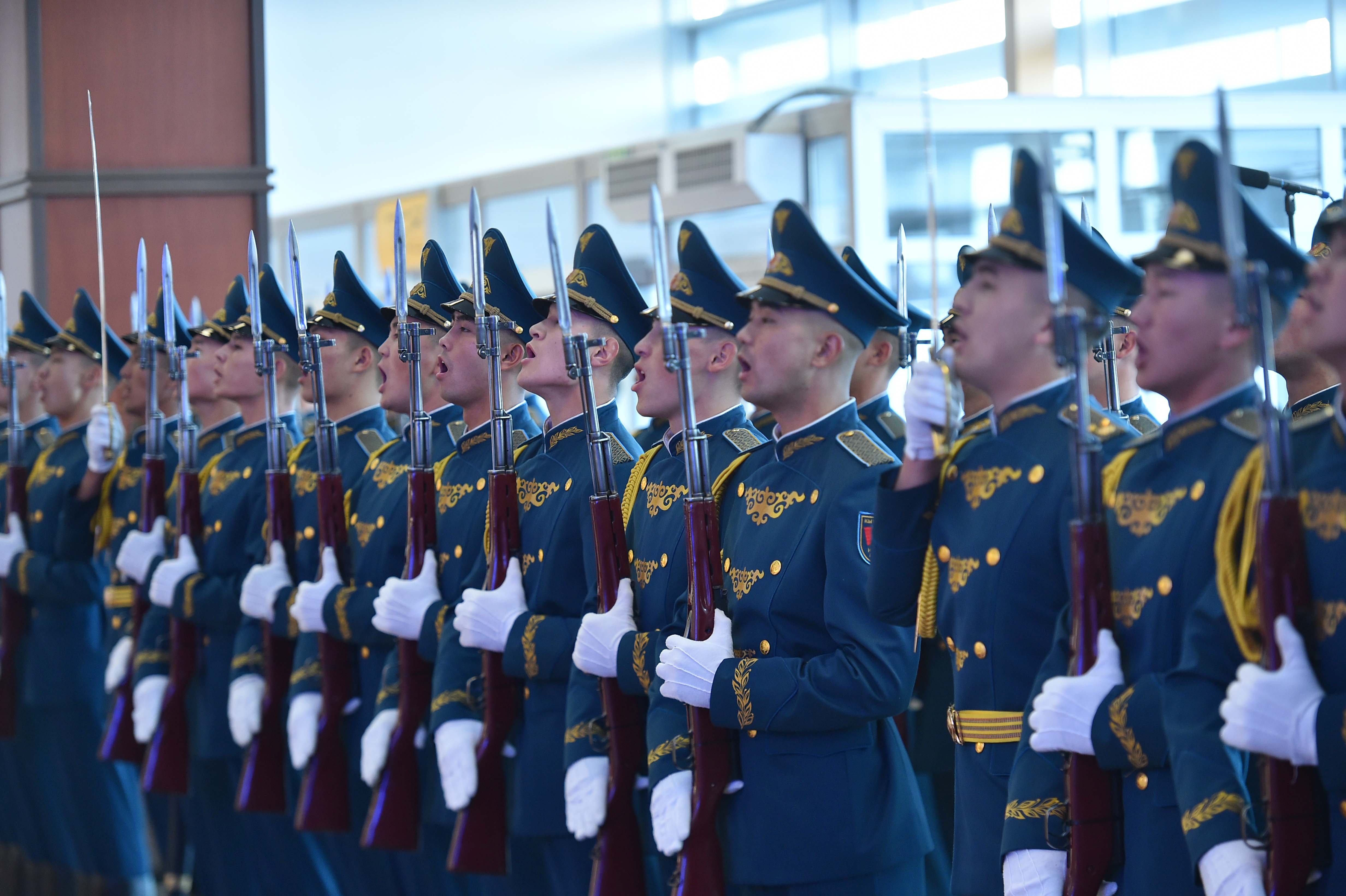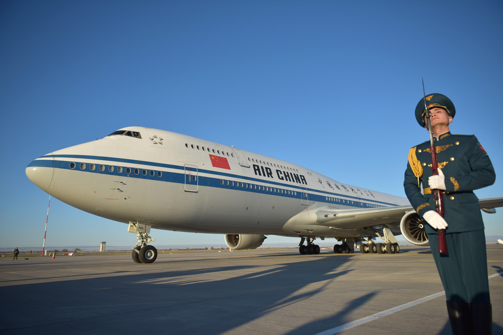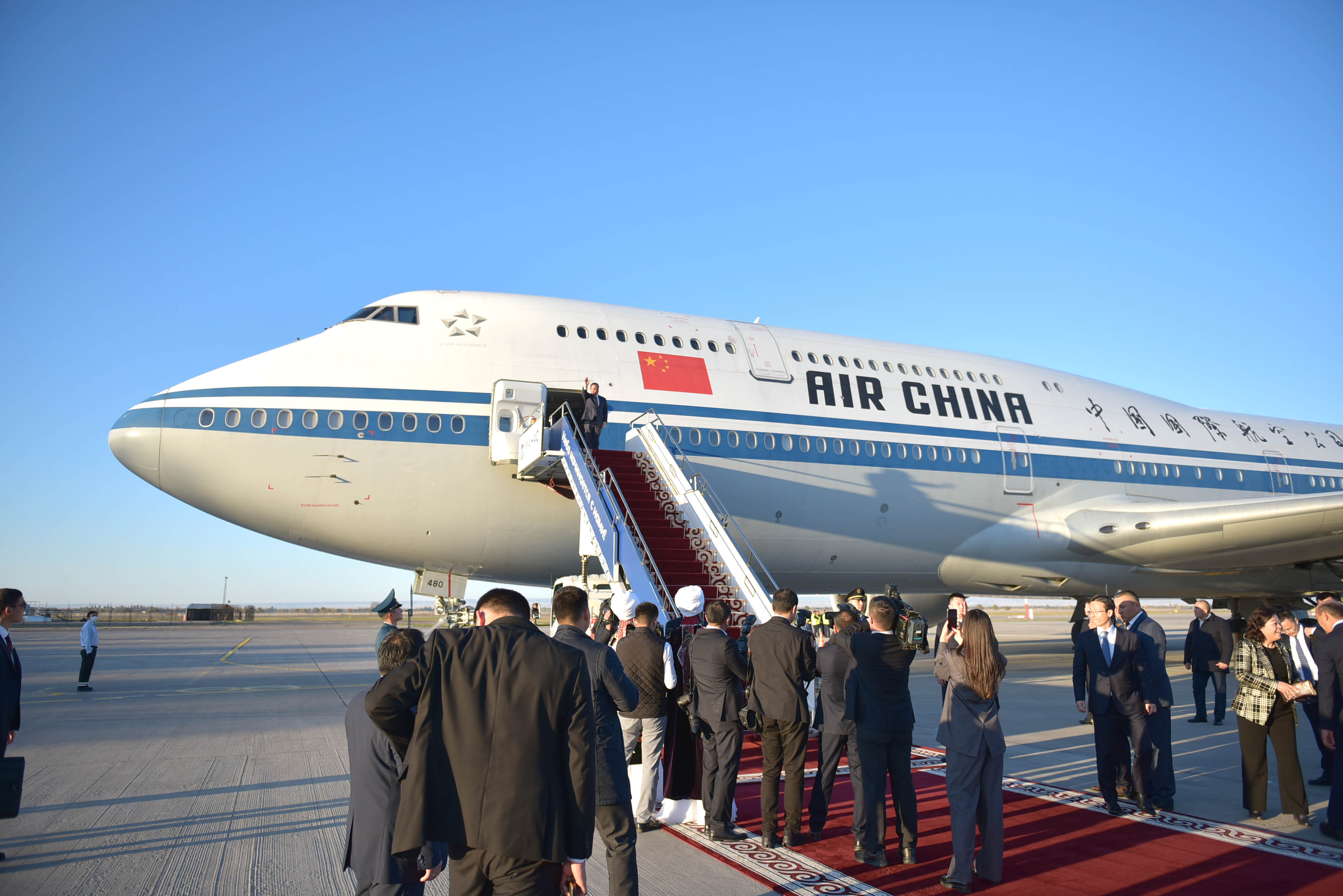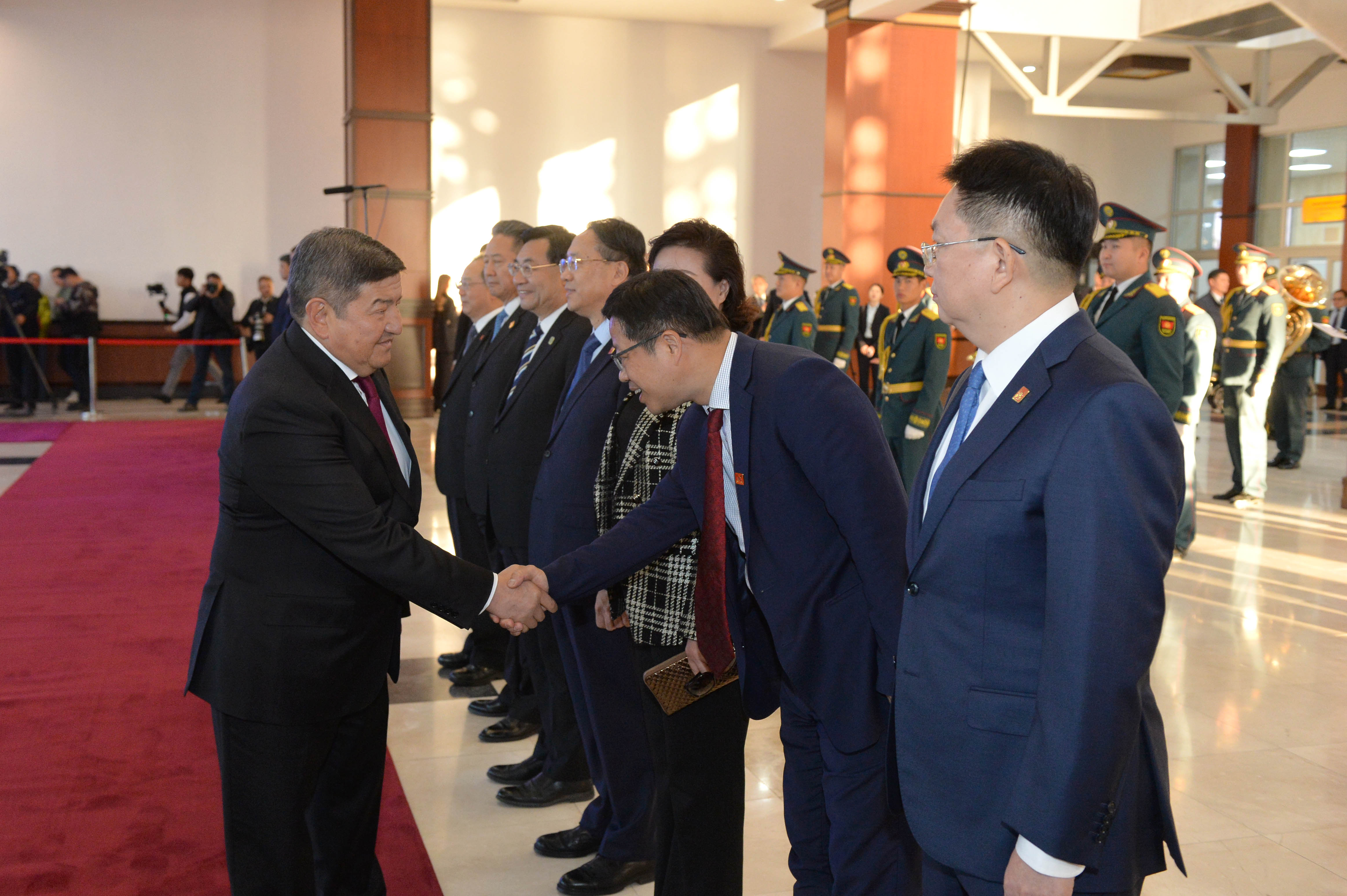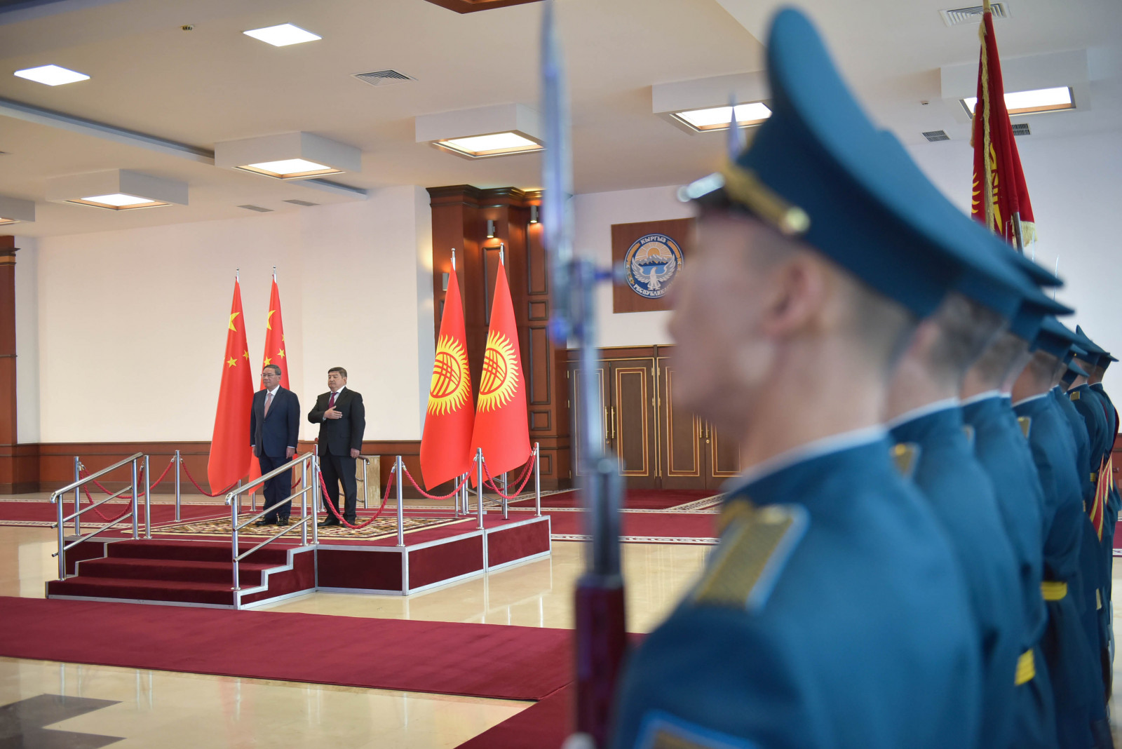 В рамках церемонии встречи высокого гостя в международном аэропорту «Манас» были вывешены государственные флаги Кыргызской Республики и Китайской Народной Республики, выстроен почетный караул.