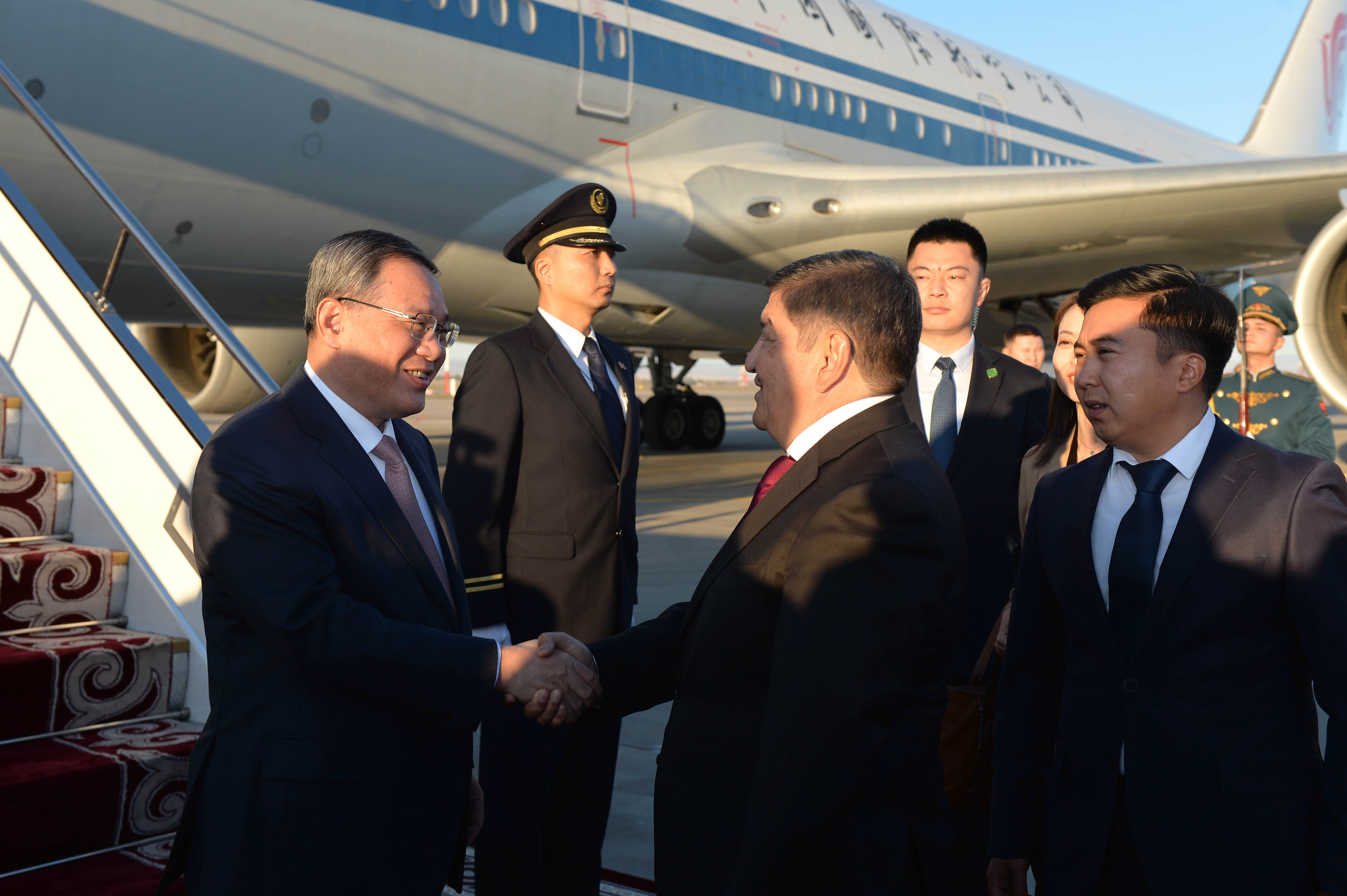В международном аэропорту «Манас» Премьера Госсовета Китайской Народной Республики встретил Председатель Кабинета Министров Кыргызской Республики – Руководитель Администрации Президента Кыргызской Республики Акылбек Жапаров.
