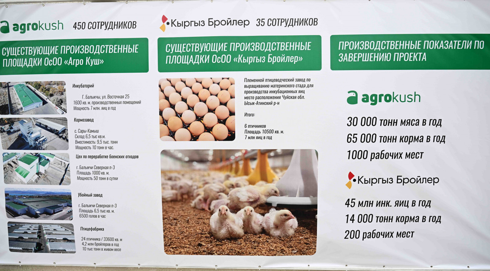 Далее он посетил птицефабрику «Агро-Куш» в селе Сары-Камыш Иссык-Кульского района, которая занимается производством продукции из мяса птицы в промышленных масштабах. Мощности завода по убою и переработке мяса птицы составляют до 6000 гол/час.