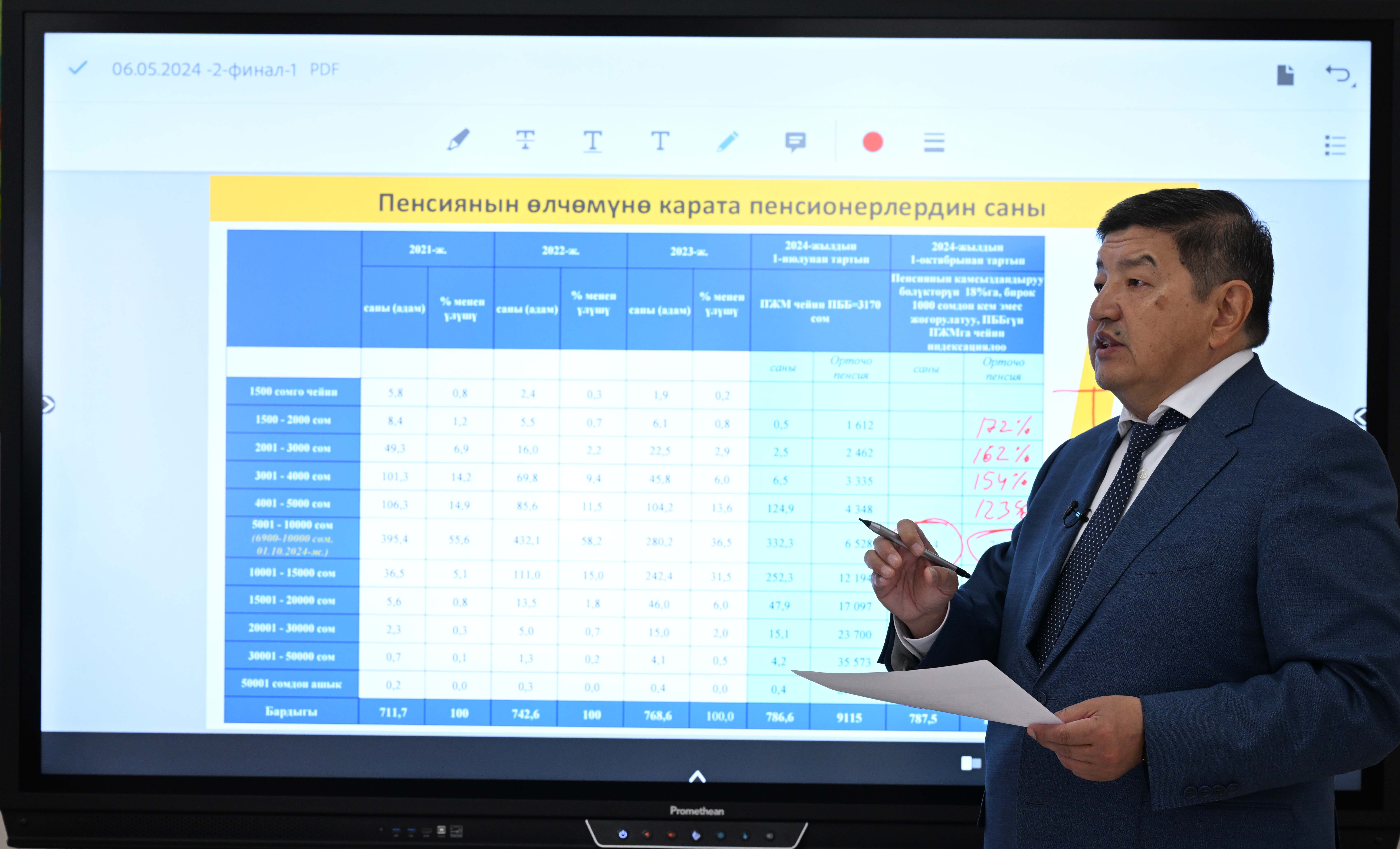 Глава Кабмина в разговоре с директором информагентства отметил, что с 1 октября 2024 года пенсии, назначаемые Социальным фондом будут повышены до 172% и будут составлять не менее 6800 сомов.