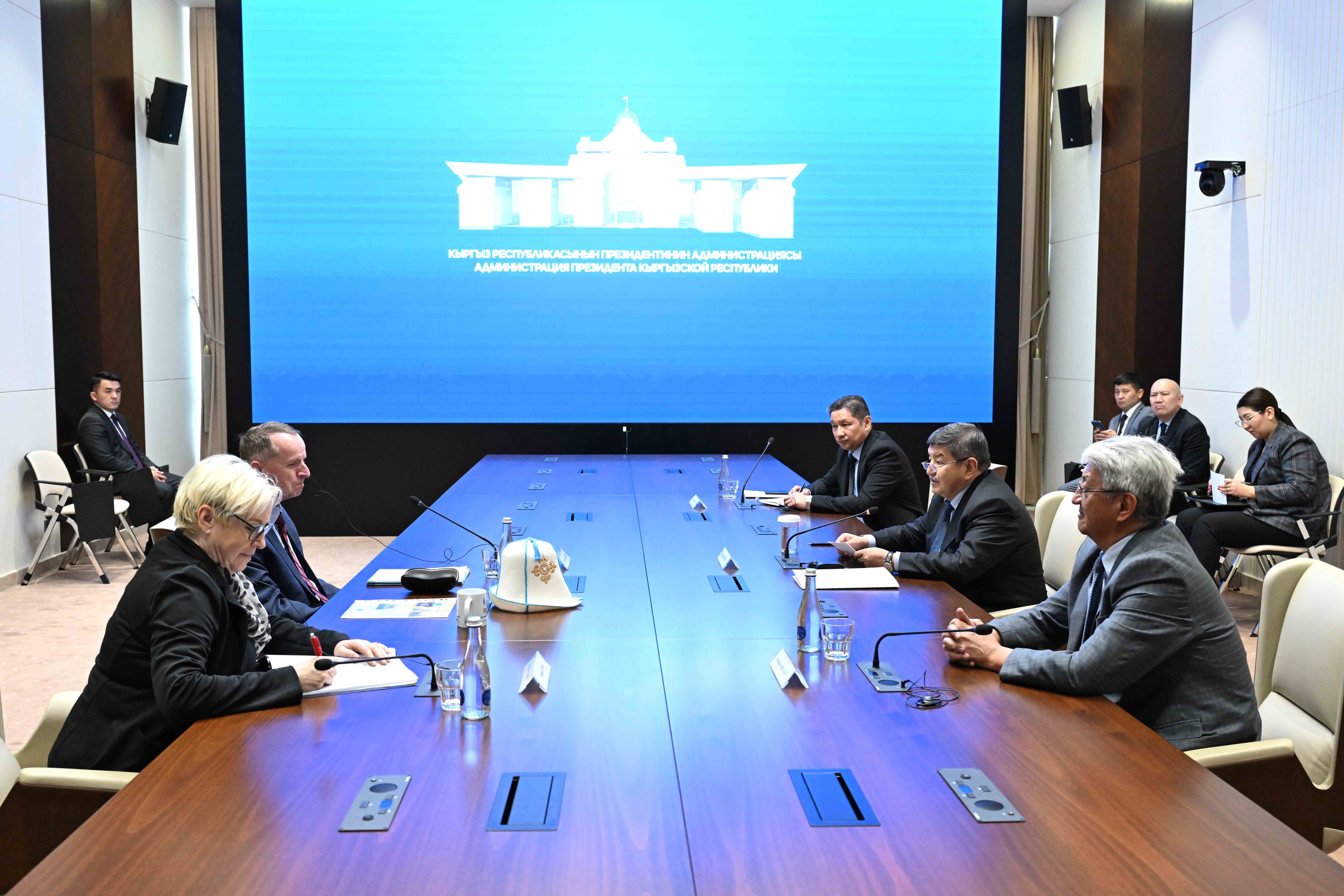 Председатель Кабинета Министров-Руководитель Администрации Президента Кыргызской Республики Акылбек Жапаров встретился с директором Института международного сотрудничества Фонда Ханнса Зайделя доктором Сюзанной Лютер и главой представительства Фонда Ханнса Зайделя в Центральной Азии доктором Максом Георгом Майером.