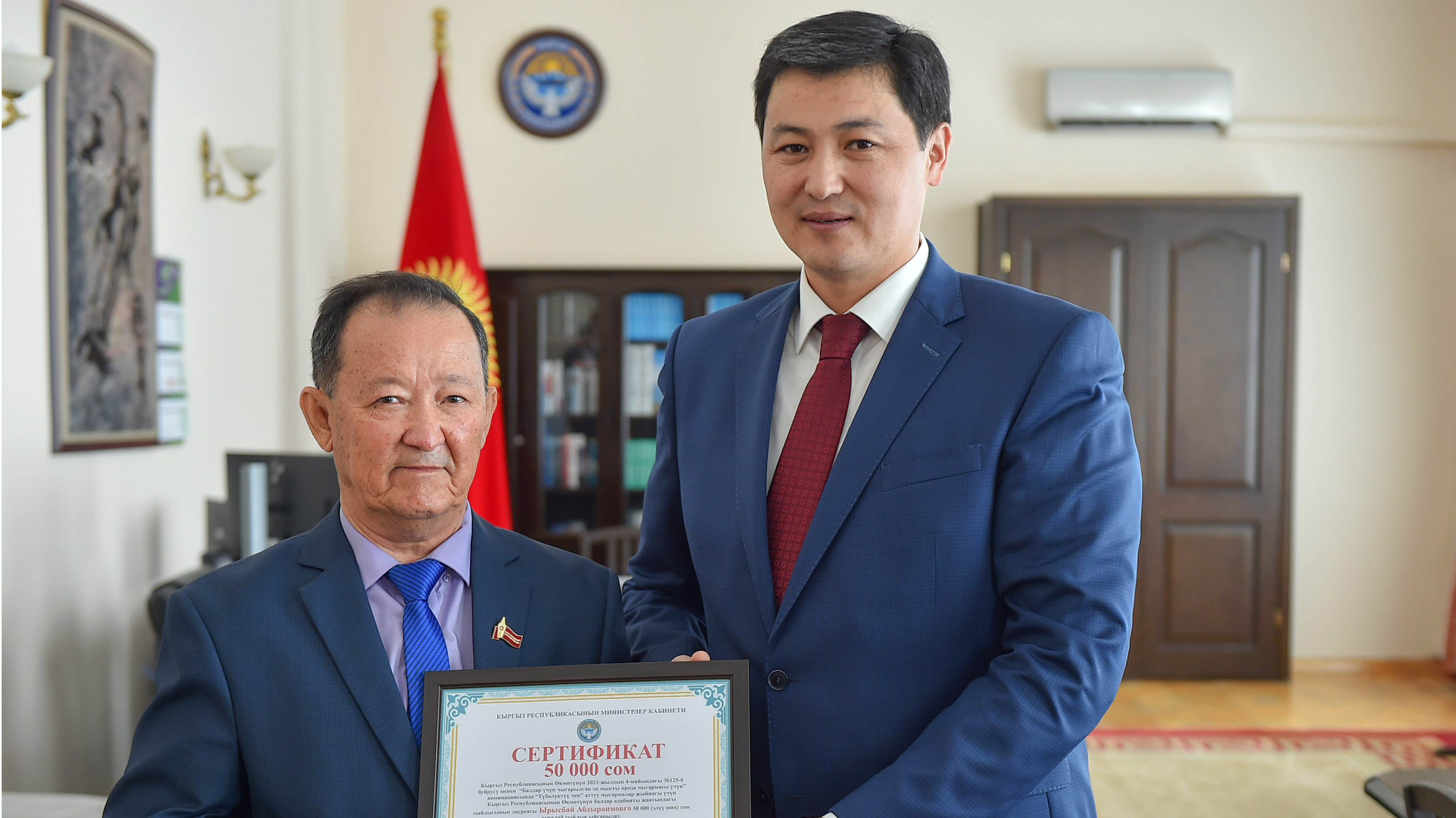Министрлер Кабинетинин башчысы жазуучуларды татыктуу сыйлыгы менен куттуктап, кыргыз балдар адабиятынын өнүгүүсүнө кошкон өзгөчө салымын белгиледи.