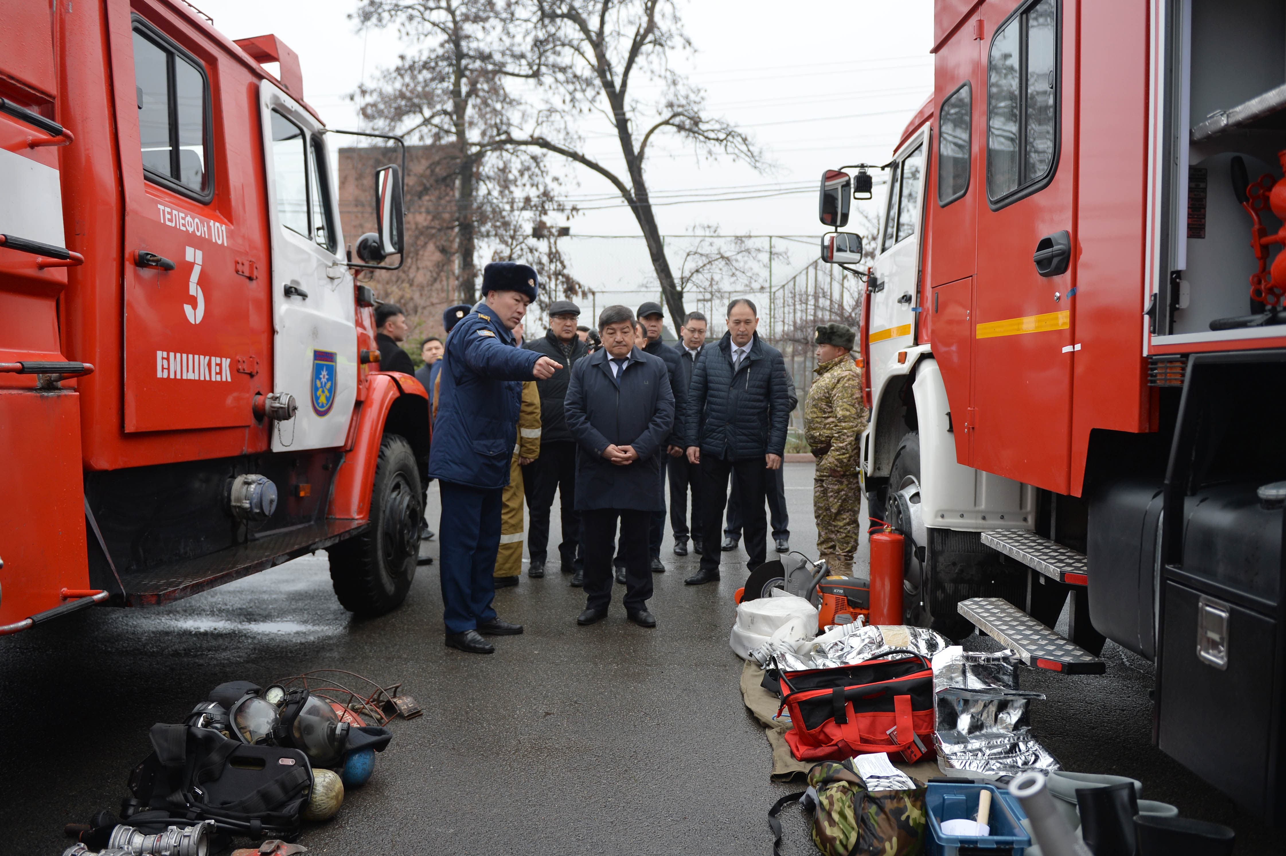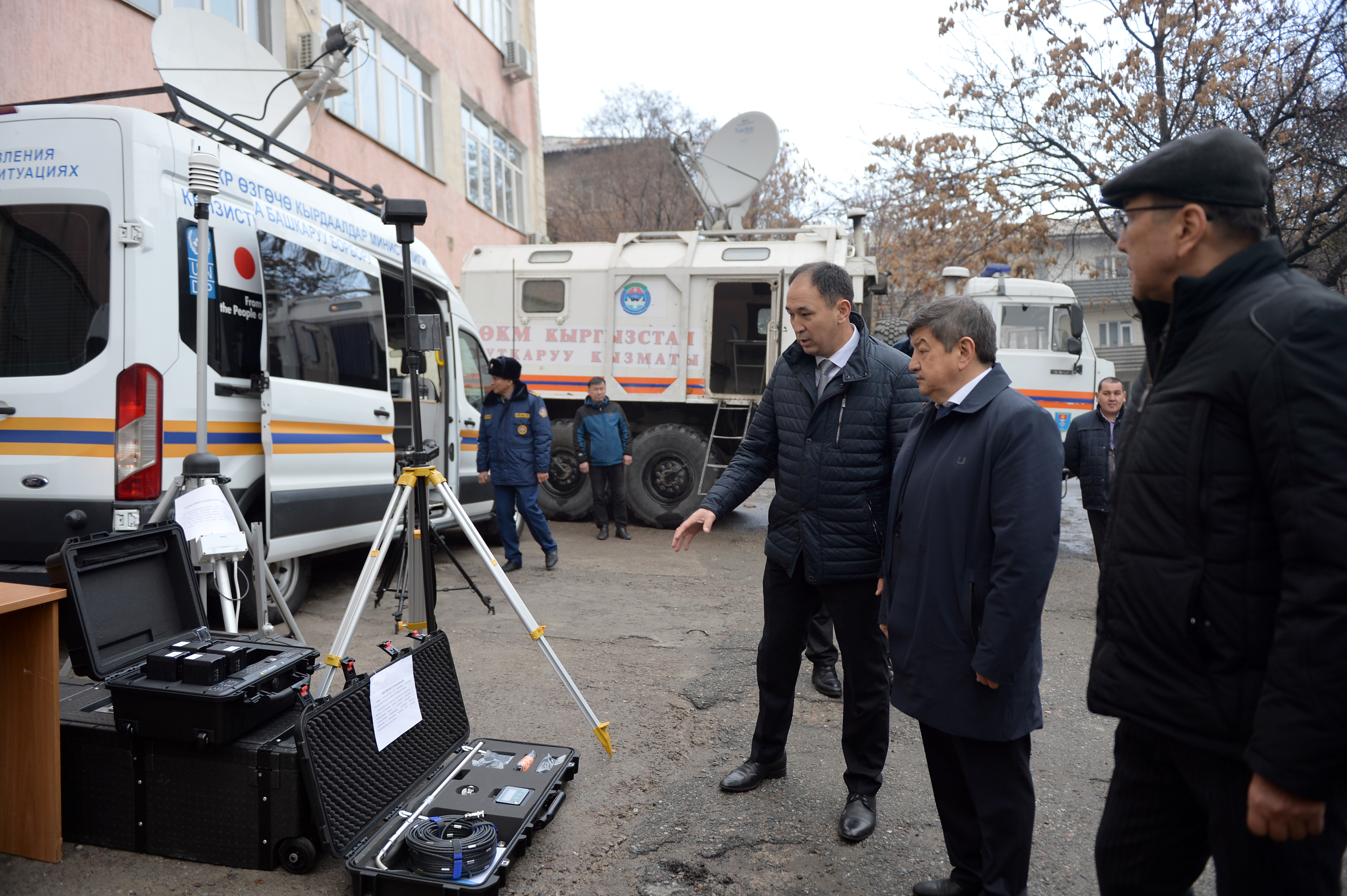 Акылбек Жапаровго кырсык болгон аймактагы адамдарды издөөгө каралган жабдуулар, радиациялык нурланууну өлчөөчү приборлор, метеорологиялык маалыматтарды жана жер титирөө жана башка табигый кырсыктарды алдын-ала кабарлоо системасынын маалыматтарын чагылдырган видеосистемалар көрсөтүлдү.