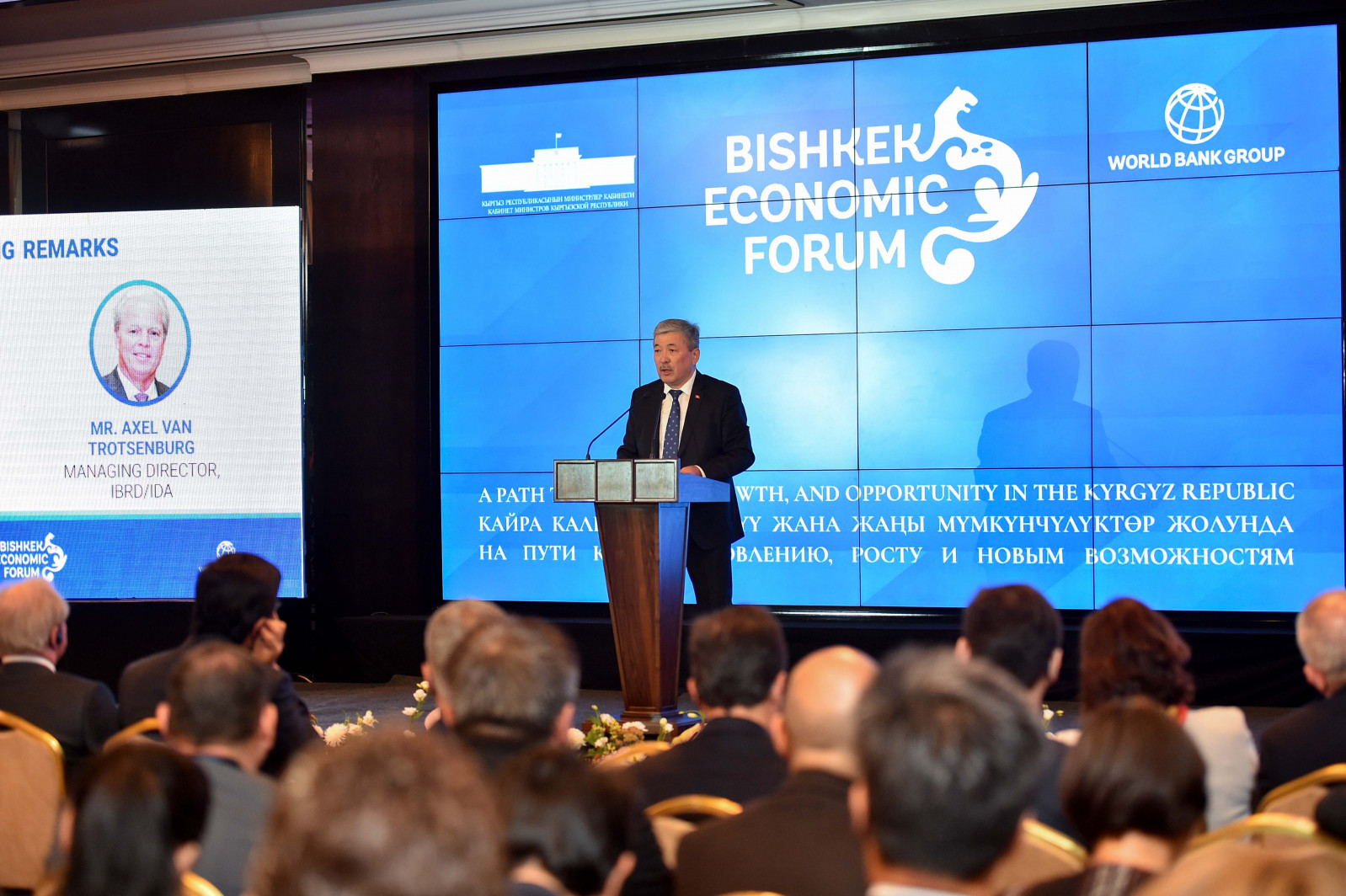 Кыргыз Республикасынын Министрлер Кабинетинин Төрагасынын биринчи орун басары Адылбек Касымалиев Дүхйнөлүк банктын колдоосунда уюштурулган «Калыбына келтирүү, өсүү жана жаңы мүмкүнчүлүктөргө карай жол» аталышындагы Бишкек экономикалык форумунун ачылышына катышты.