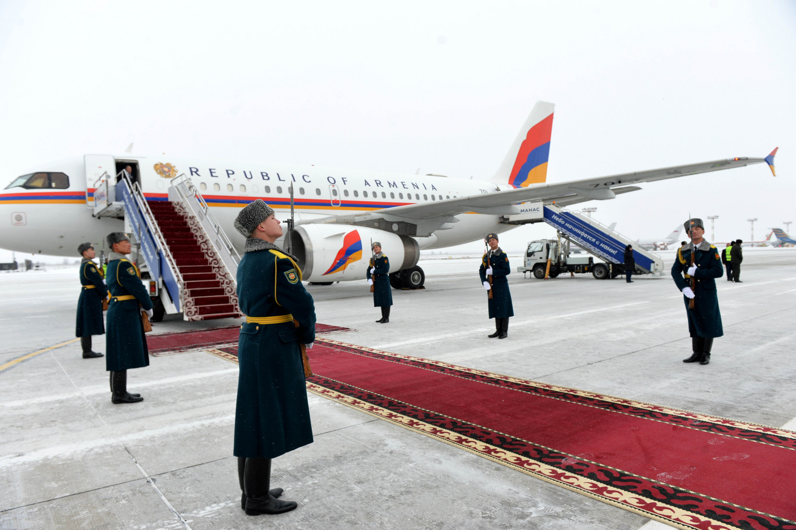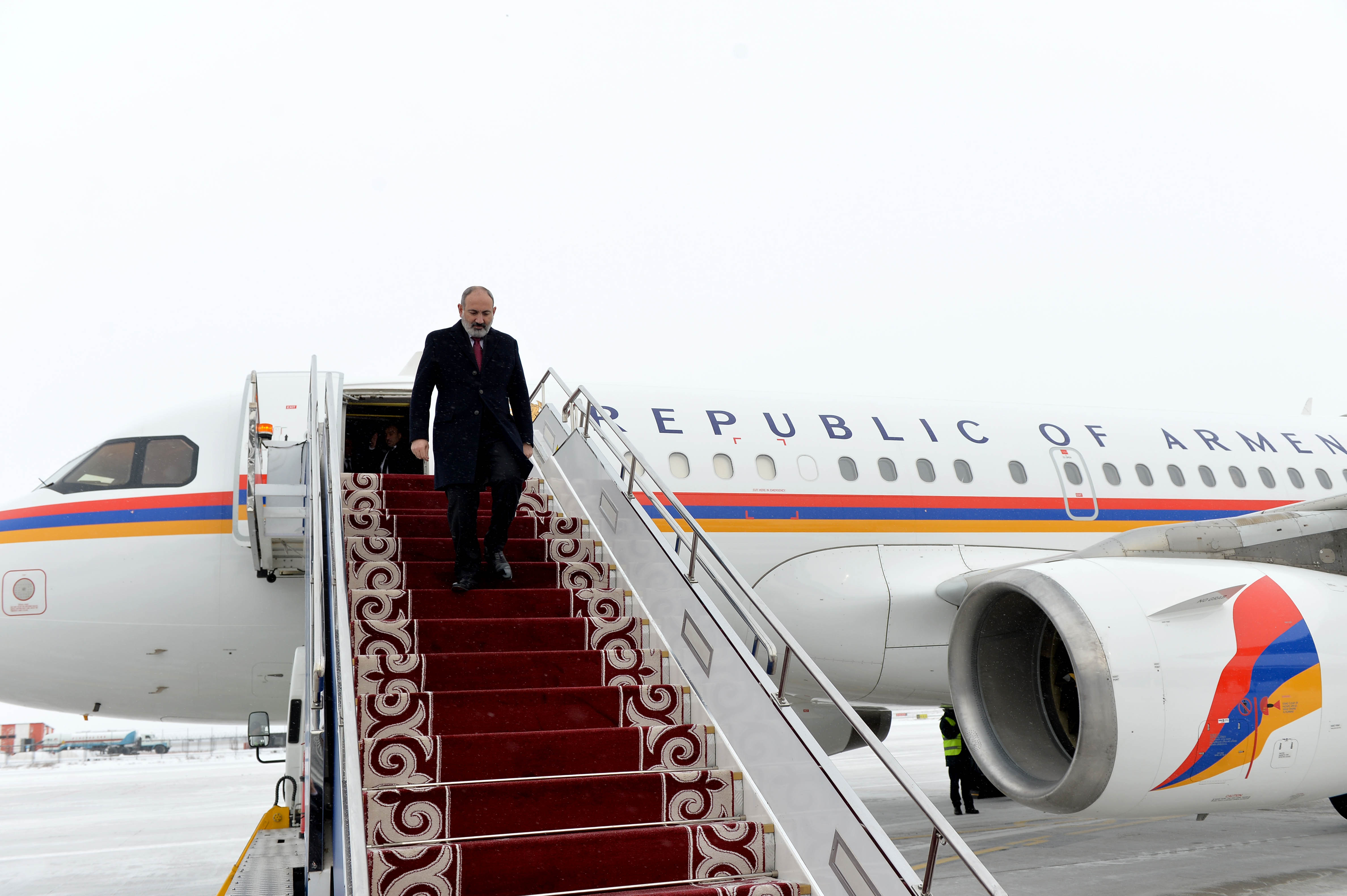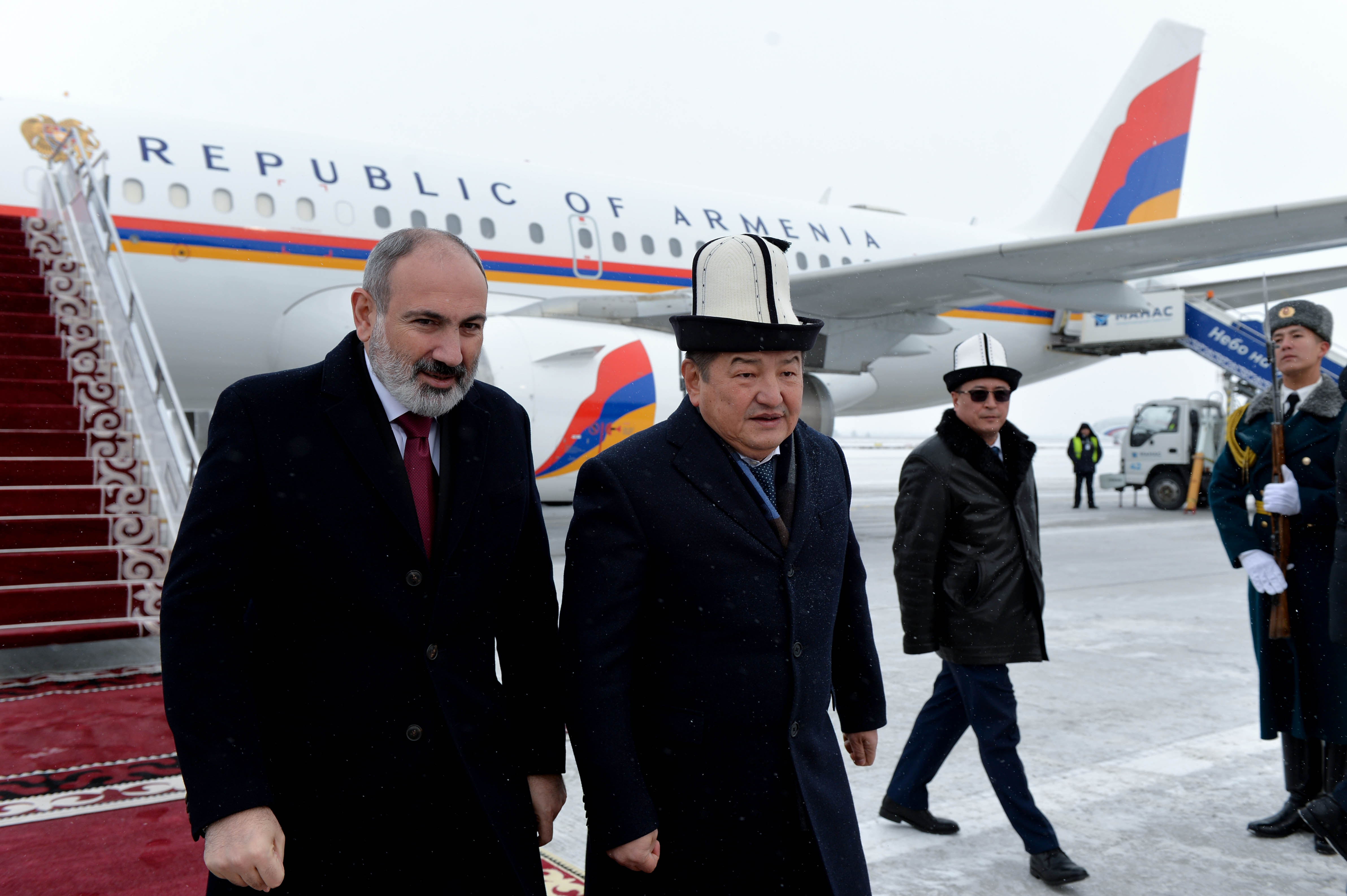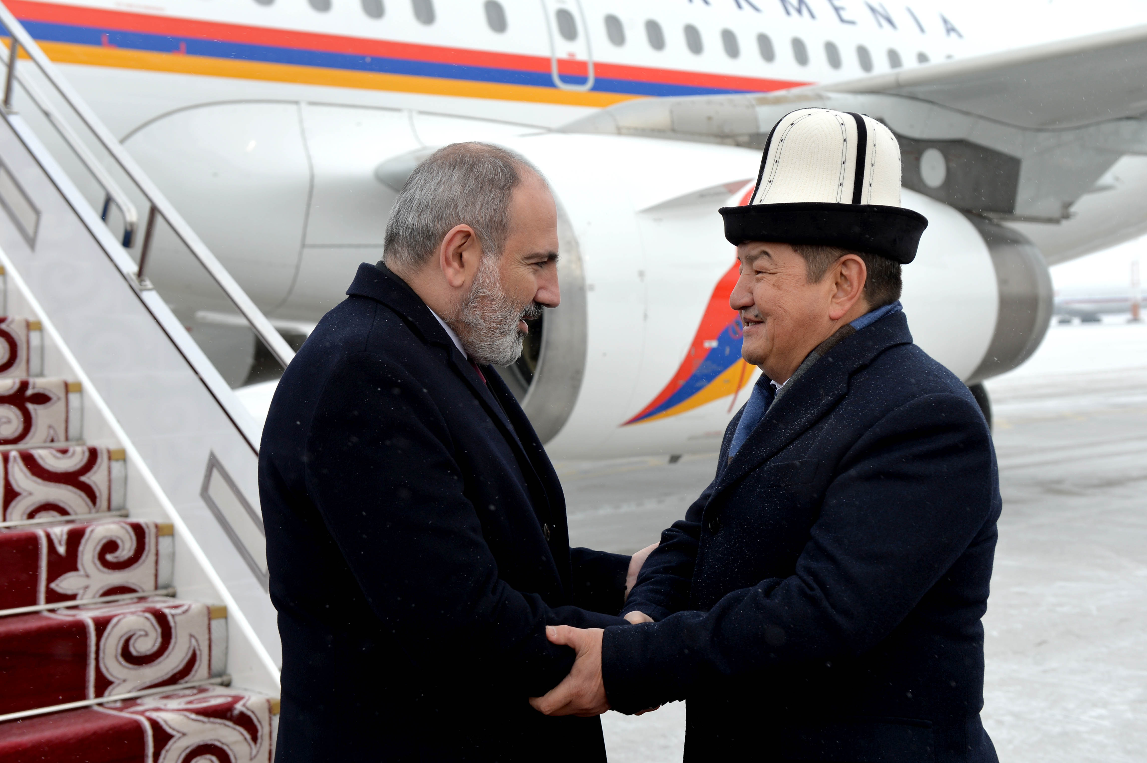 «Манас» Эл аралык аэропортунда Премьер-Министр Никол Пашинянды Кыргыз Республикасынын Министрлер Кабинетинин Төрагасы — Кыргыз Республикасынын Президентинин Администрациясынын Жетекчиси Акылбек Жапаров тосуп алды.