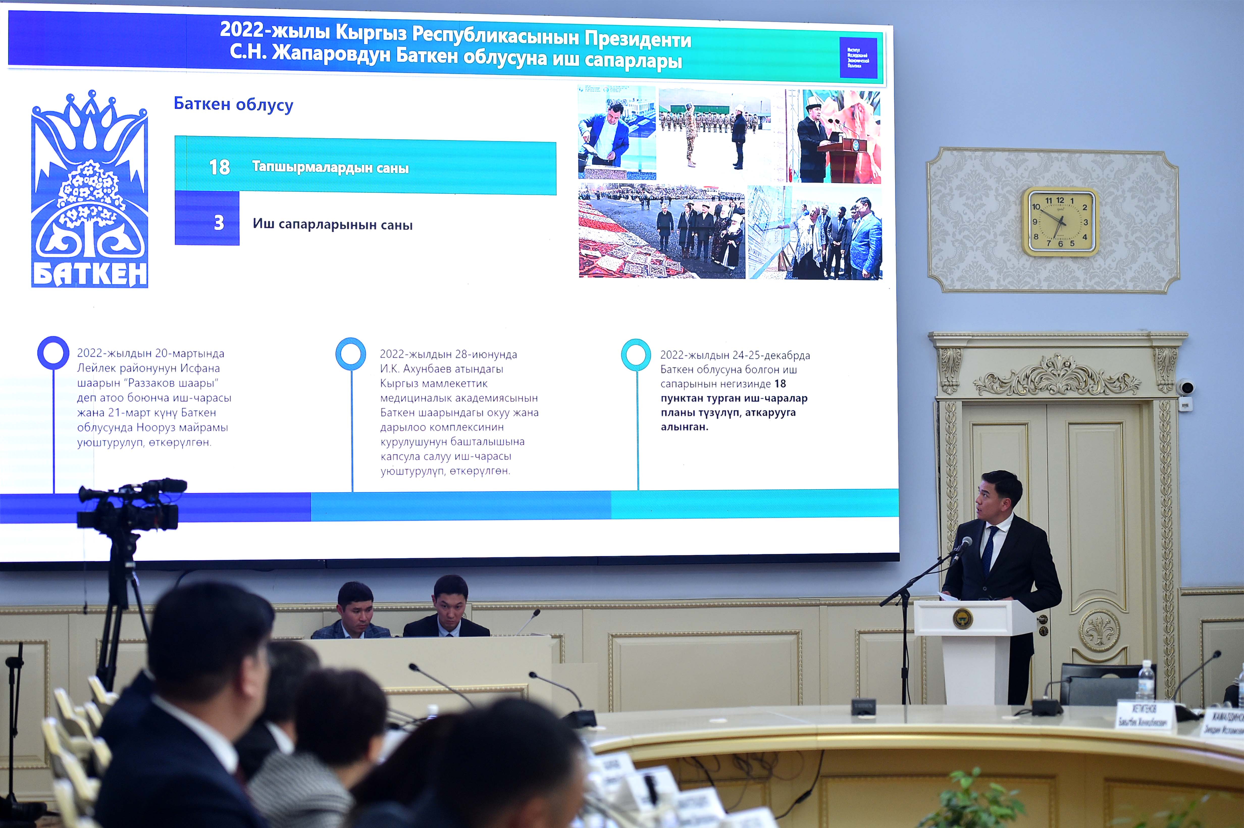 Кеңешменин күн тартибинде 4 маселе белгиленген, атап айтканда, экономика жана коммерция министри Данияр Амангелдиевдин жана финансы министри Алмаз Бакетаевдин баяндамалары (Президенттин жарлыктарын жана Министрлер Кабинетинин чечимдерин аткаруу боюнча) угулду.