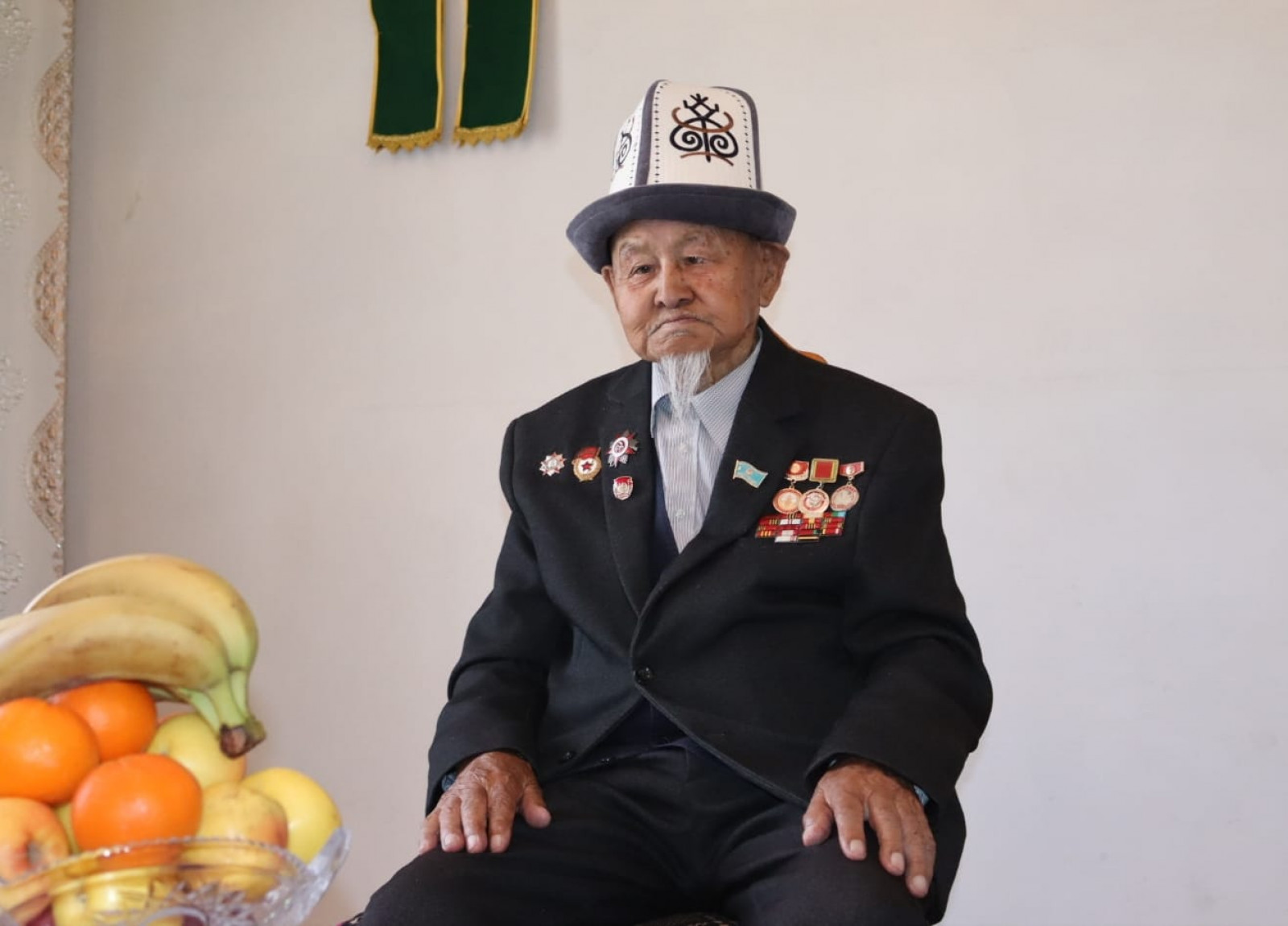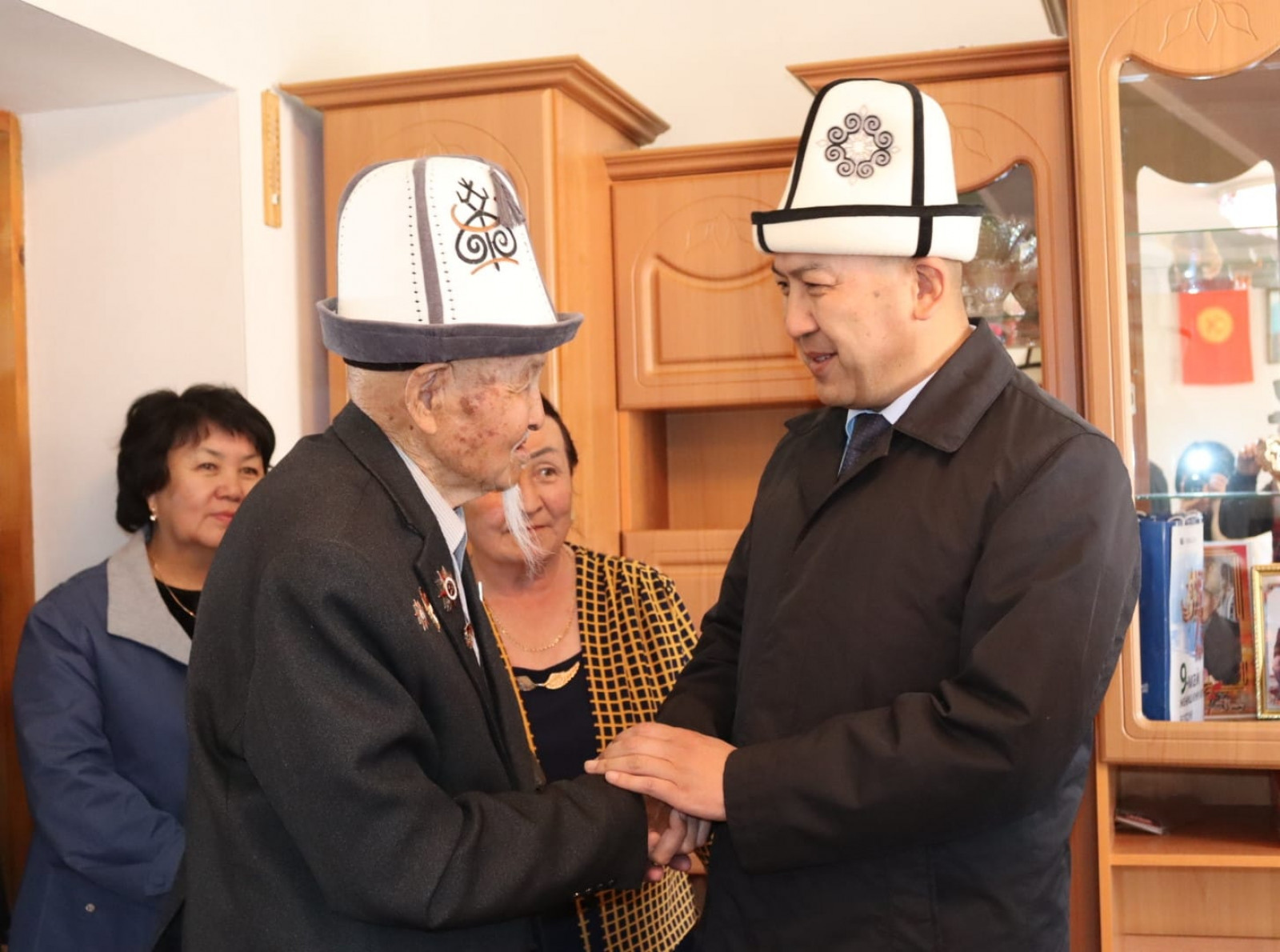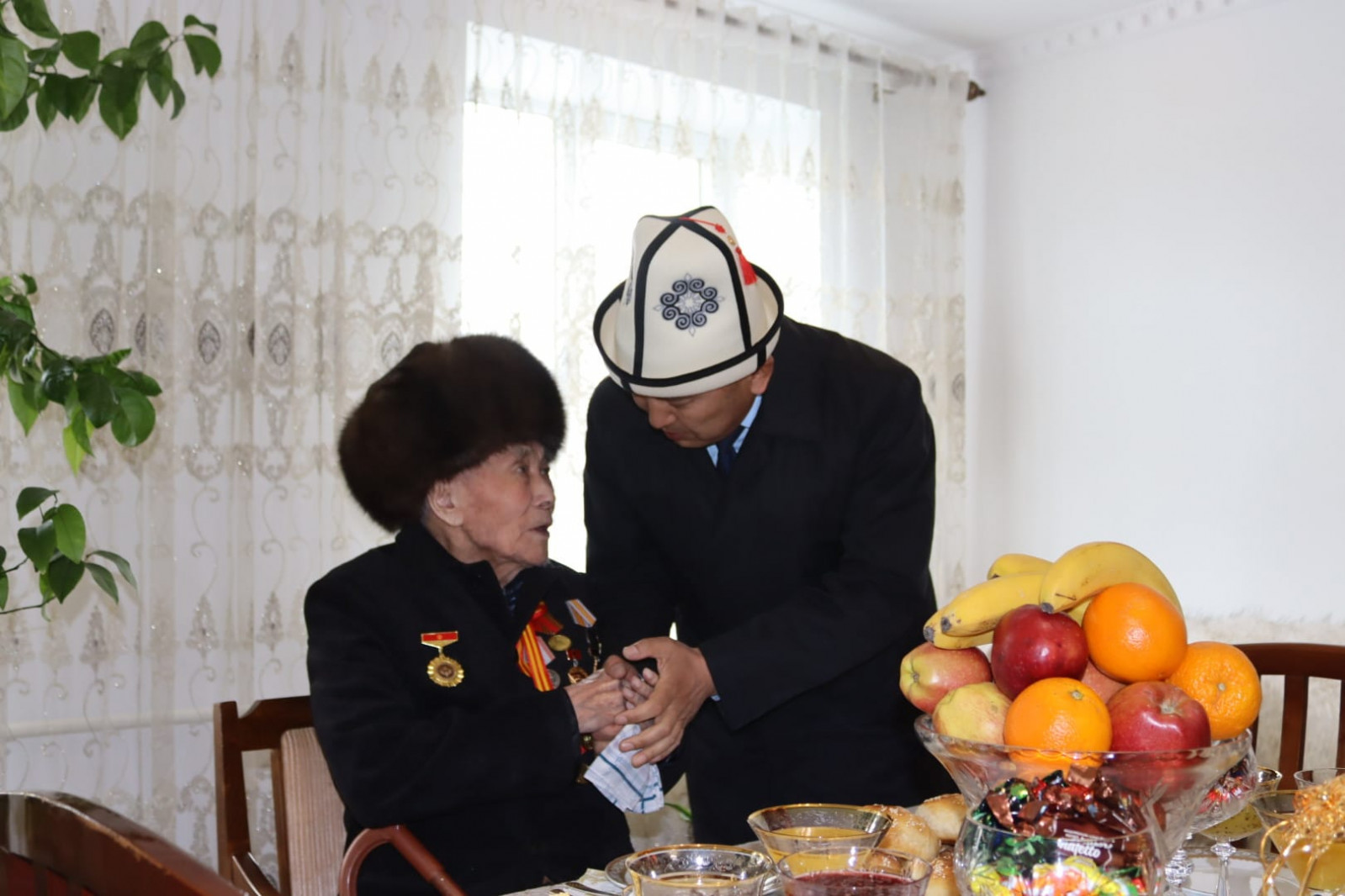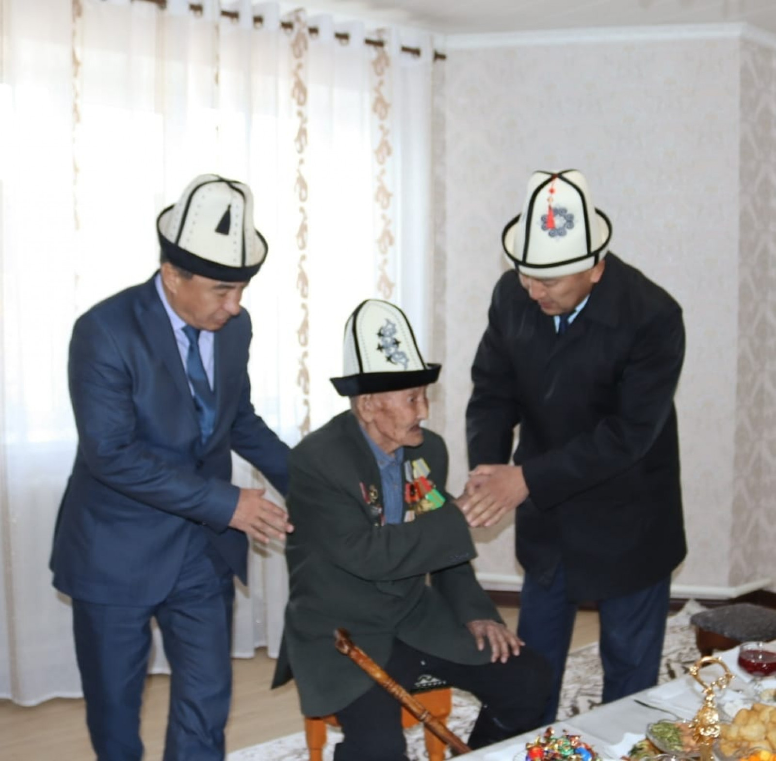 Өлкө башчысынын белегин Президенттин Нарын облусундагы ыйгарым укуктуу өкүлү Алтынбек Эргешов дарегине жеткирип, ардагерлерди майрамы менен куттуктады.