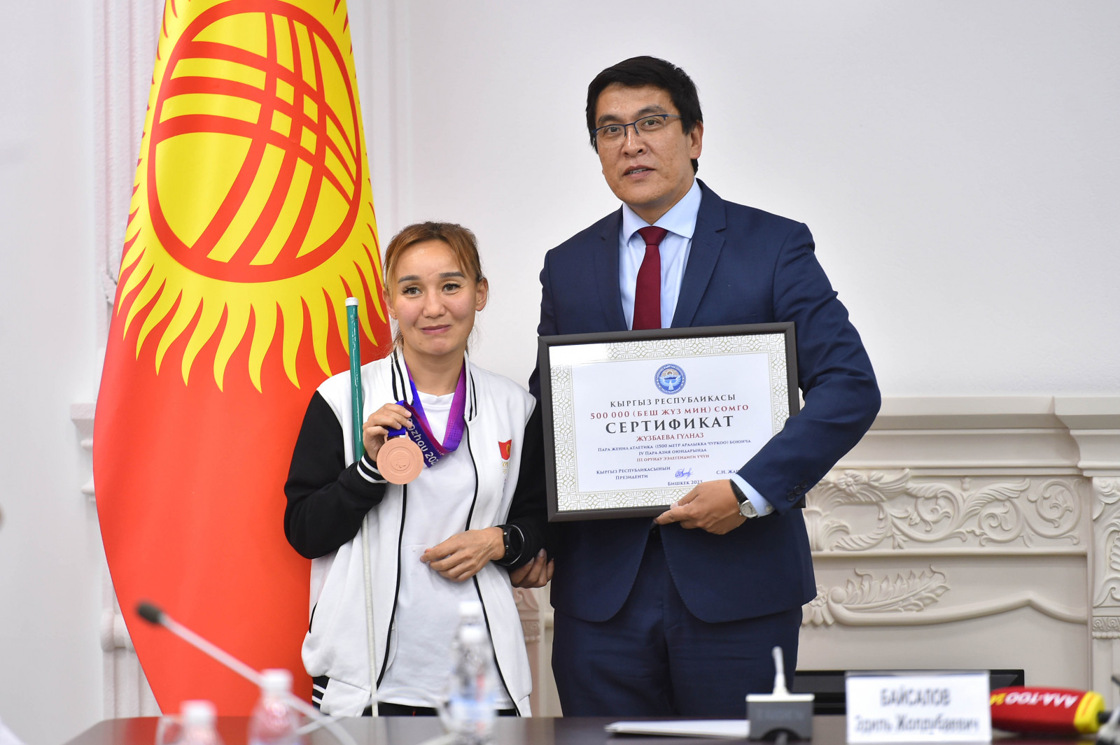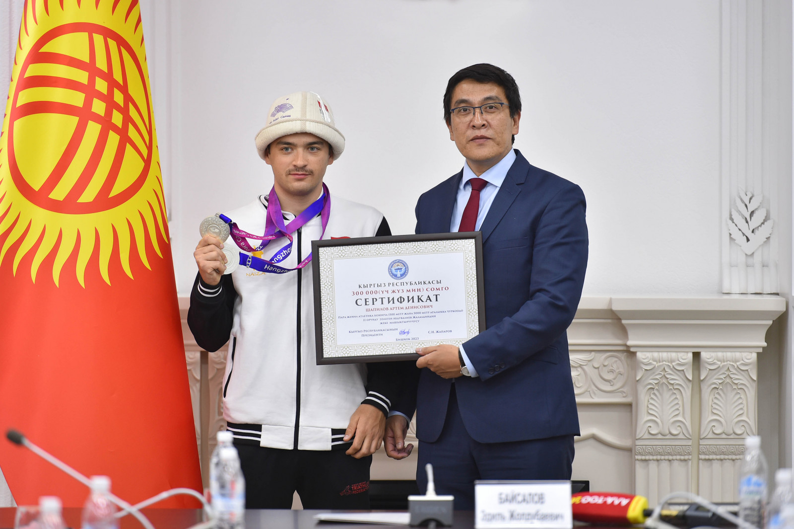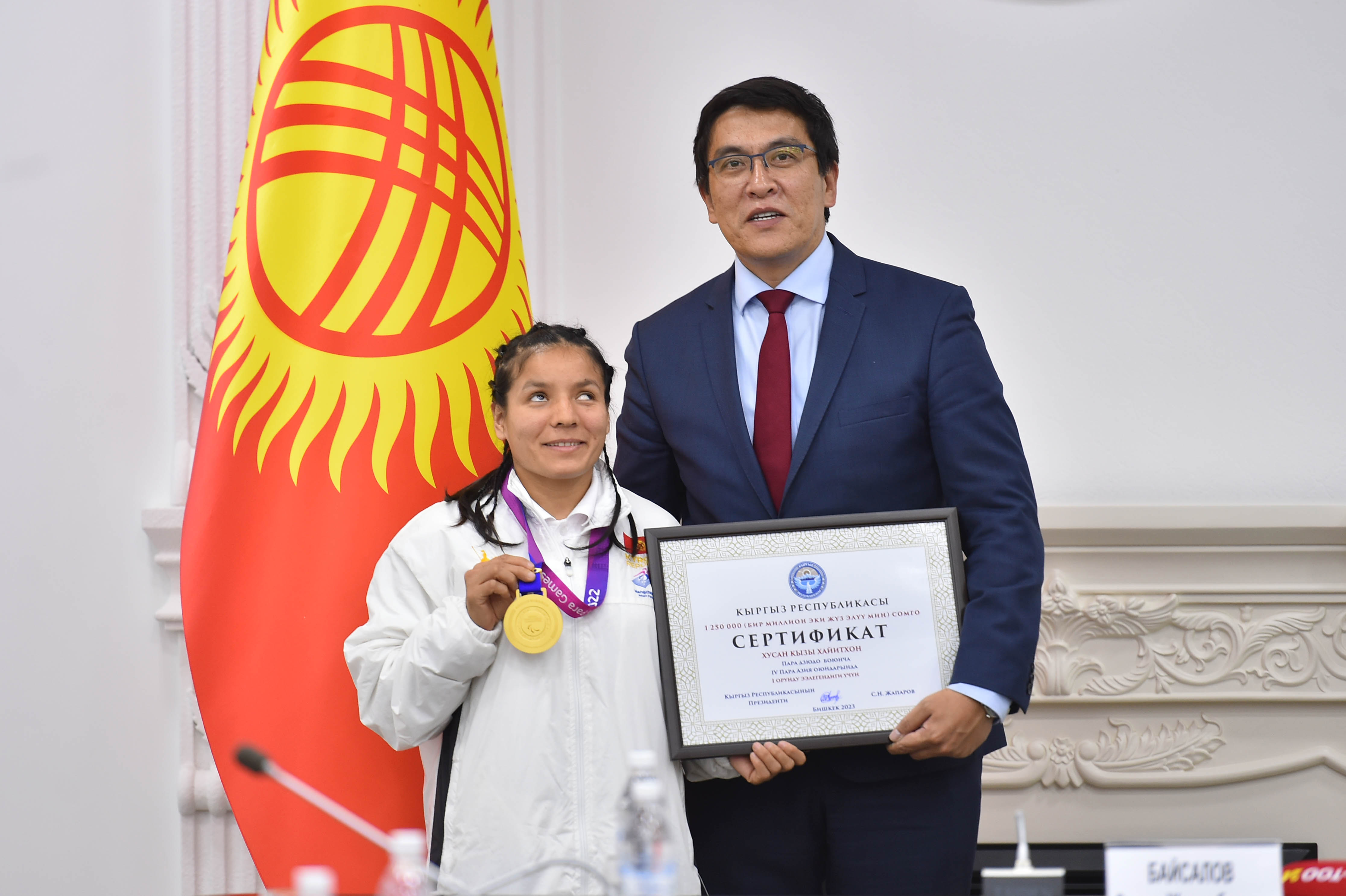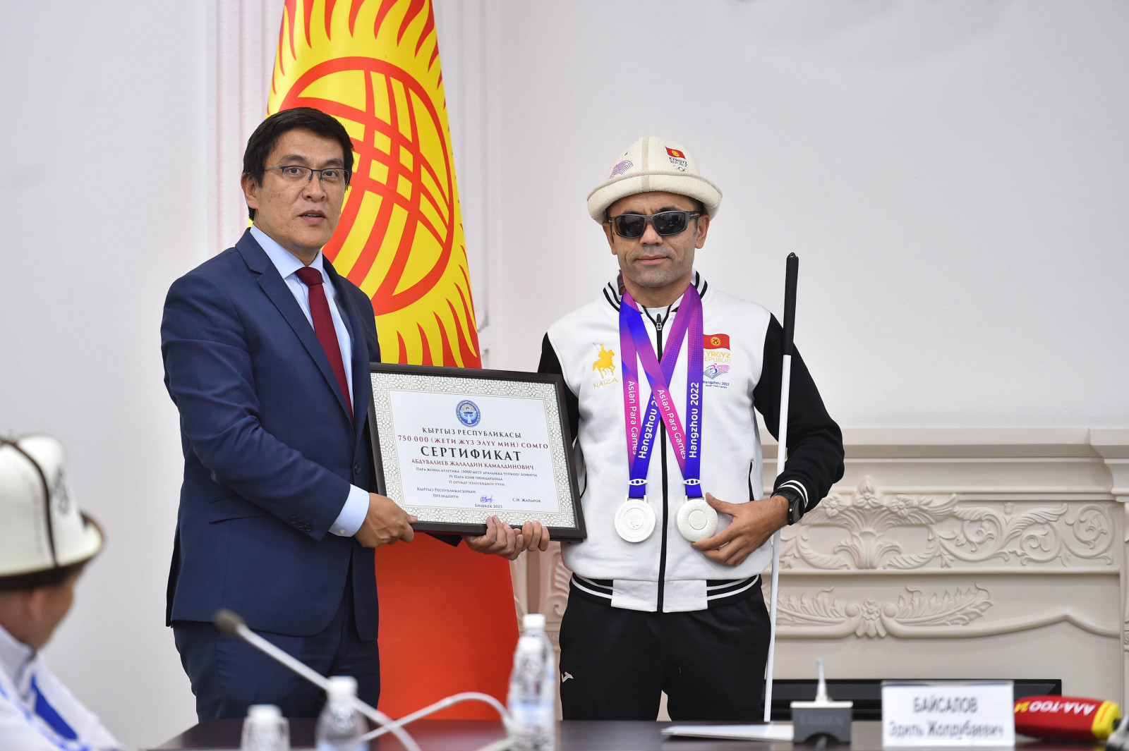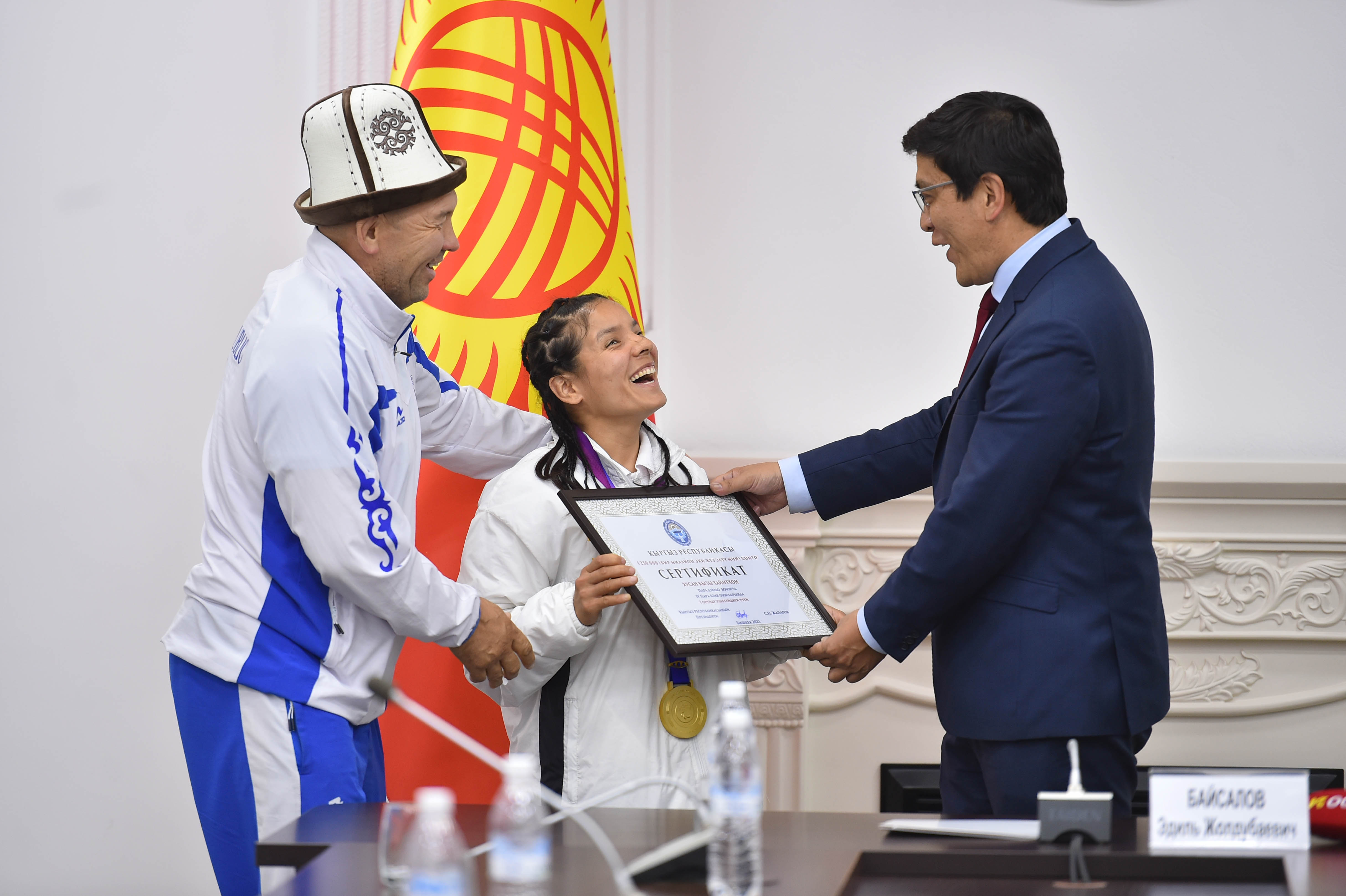 Кыргыз Республикасынын Министрлер Кабинетинин Төрагасынын орун басары Эдиль Байсалов Кыргыз Республикасынын Президентинин жана Министрлер Кабинетинин атынан Ханчжоу (Кытай Эл Республикасы) шаарында өткөн IV Азиянын пара оюндарына катышып жеңиш менен кайтып келген кыргызстандык спортчуларды куттуктады.