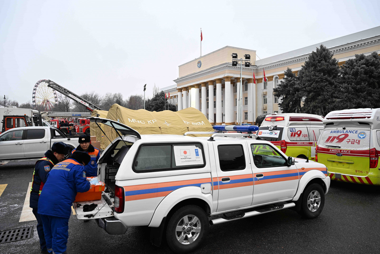 «Бүгүн биз Өзгөчө кырдаалдар министрлигине 28 даана атайын техника өткөрүлүп берилгенине күбө болдук, анын ичинен 10 даанасы Белоруссиядан алынып келинген БЕЛАЗ-7540Б үлгүсүндөгү чоң самосвал, 4 заманбап медициналык жана 4 өрт өчүрүүчү машина жана башка заманбап куткаруу техникасы. Куткаруу шаймандары алууга республикалык бюджеттен 35 миллион сом бөлүндү», - деп баса белгиледи Камчыбек Ташиев.