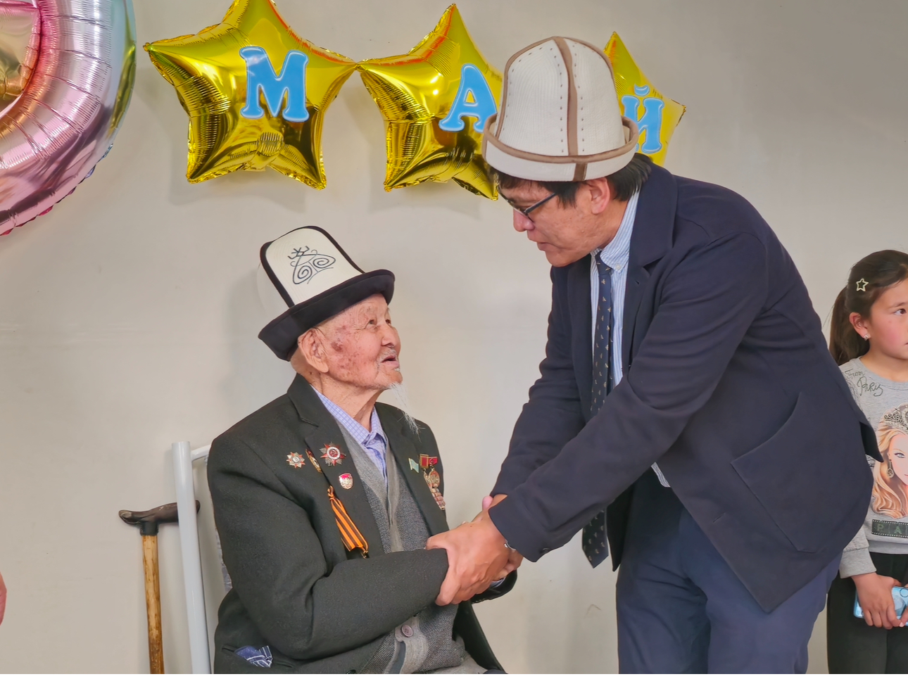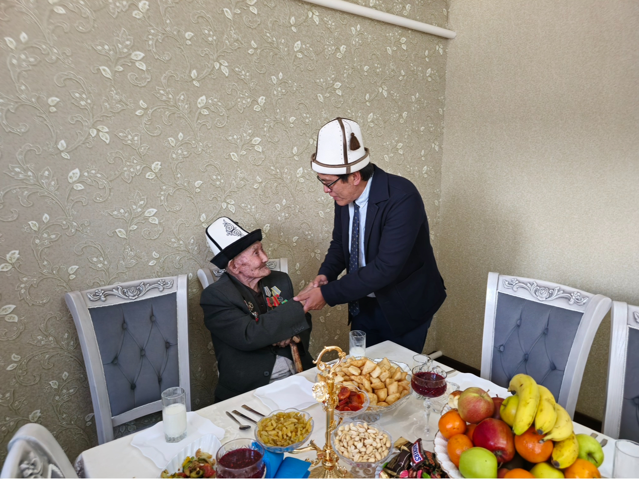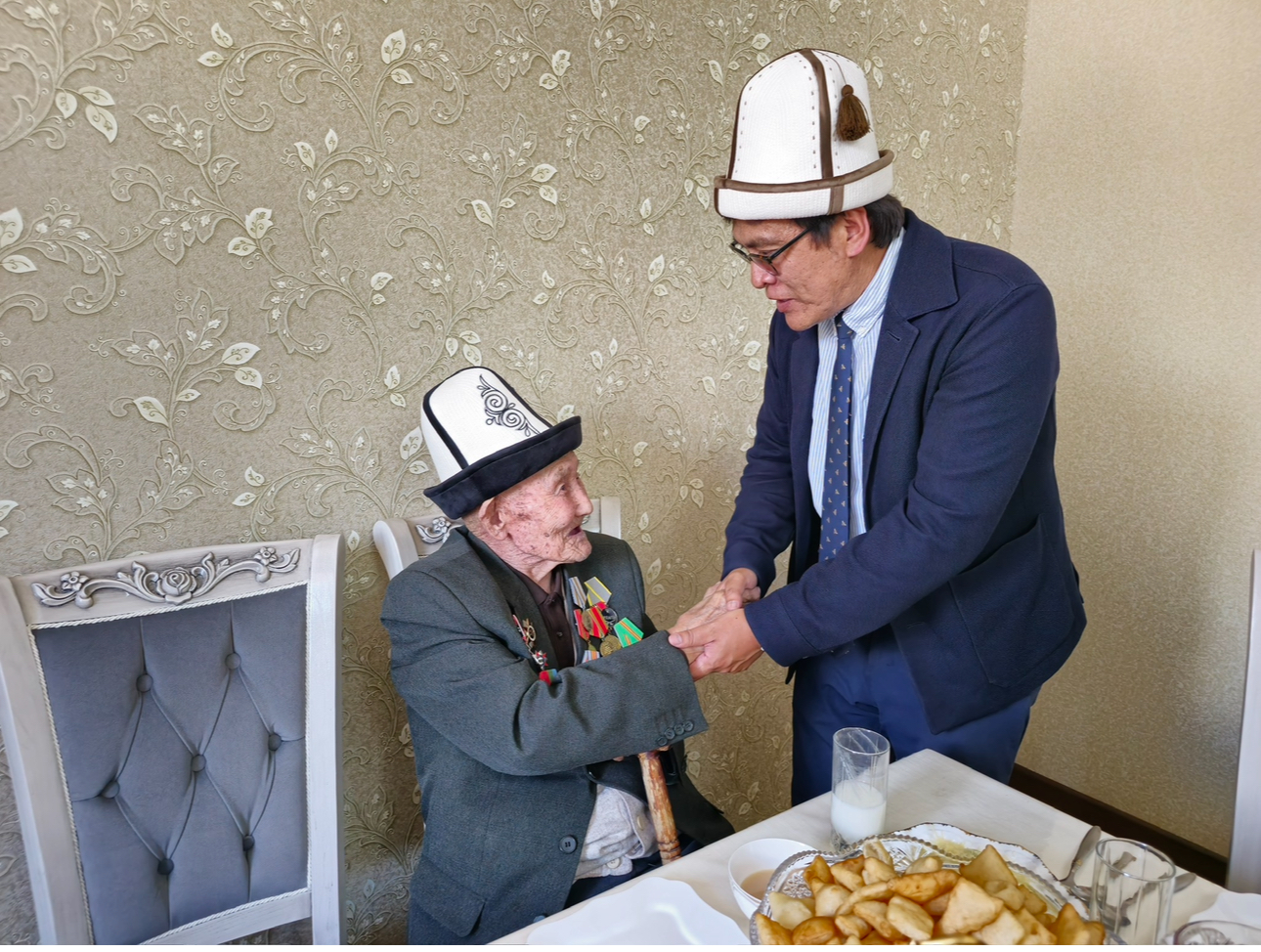 Минкаб Төрагасынын орун басары Эдил Байсалов Нарын облусунда Улуу Ата Мекендик согуштун ардагерлери Сатында Жапаров менен Тапа Керимкуловду зыярат кылды