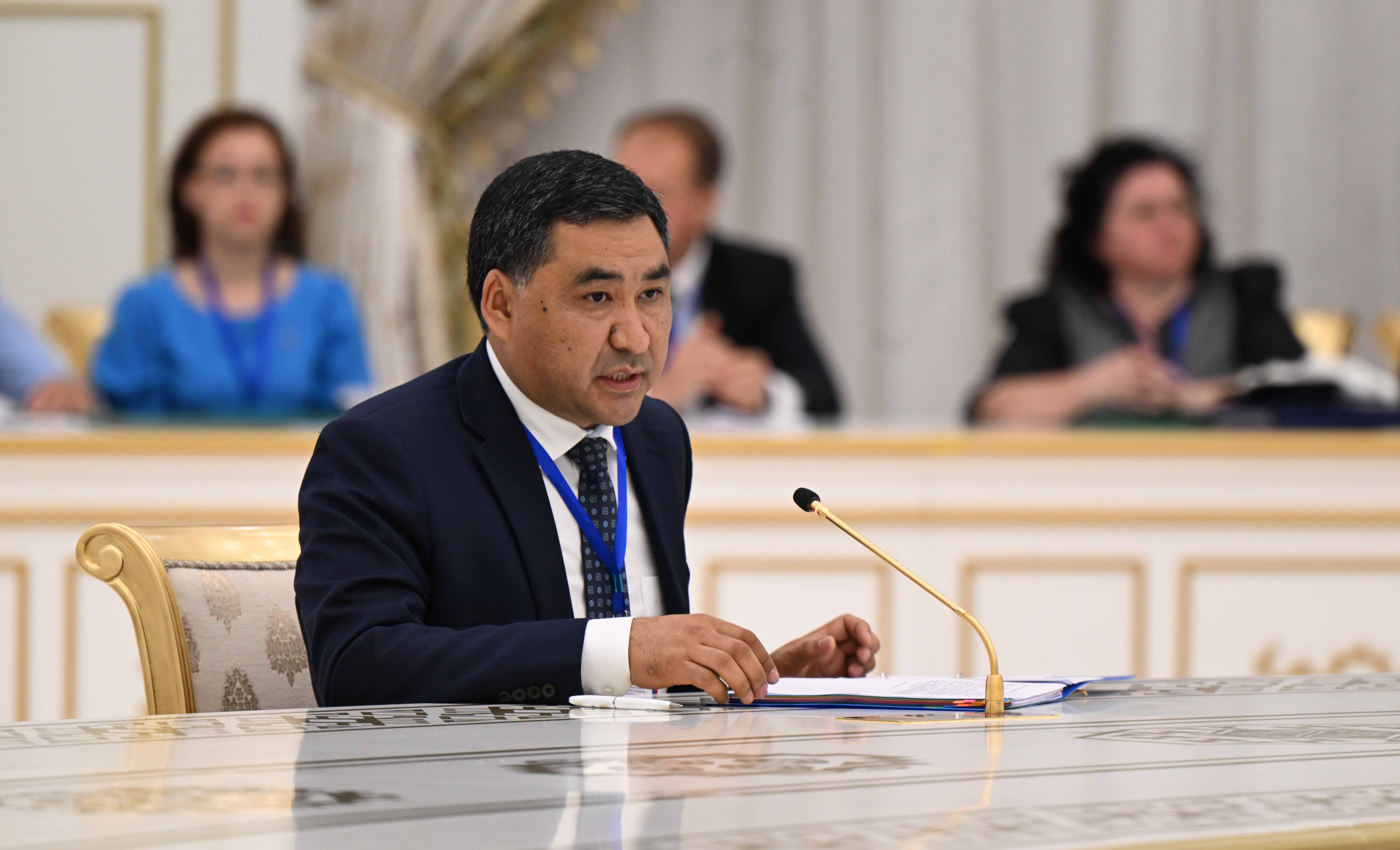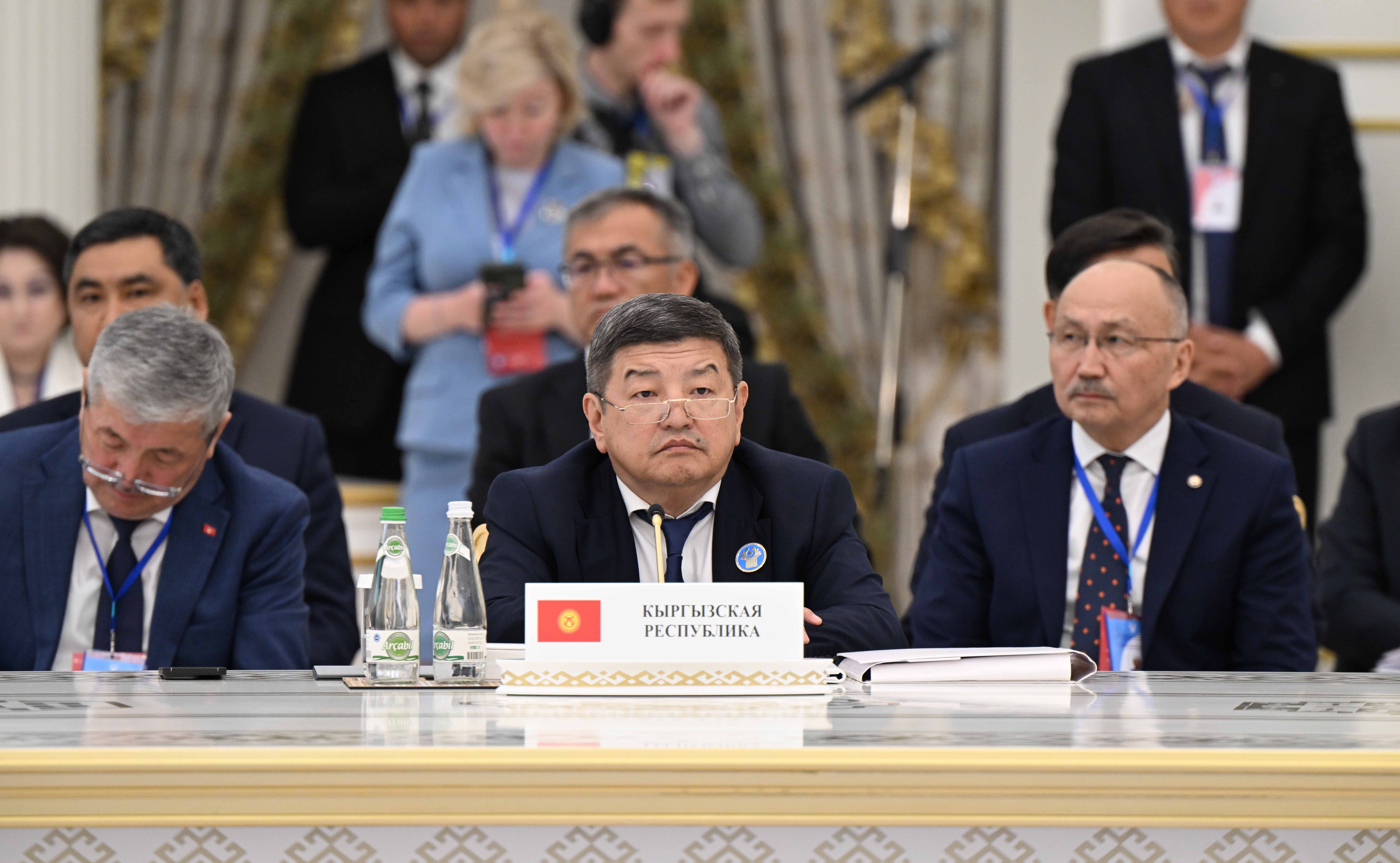 "2019-2023-жылдарга Кыргызстандын КМШ өлкөлөрү менен өз ара жана тышкы соодасынын көлөмү 1,6 эсеге, анын ичинде экспорт — 1,8 эсе, импорт — 1,5 эсе өстү. 2023-жылы КМШга мүчө-мамлекеттердин үлүшү, Кыргыз Республикасынын жалпы соода жүгүртүүсүнүн 33 пайызына туура келди"-деди Акылбек Жапаров.