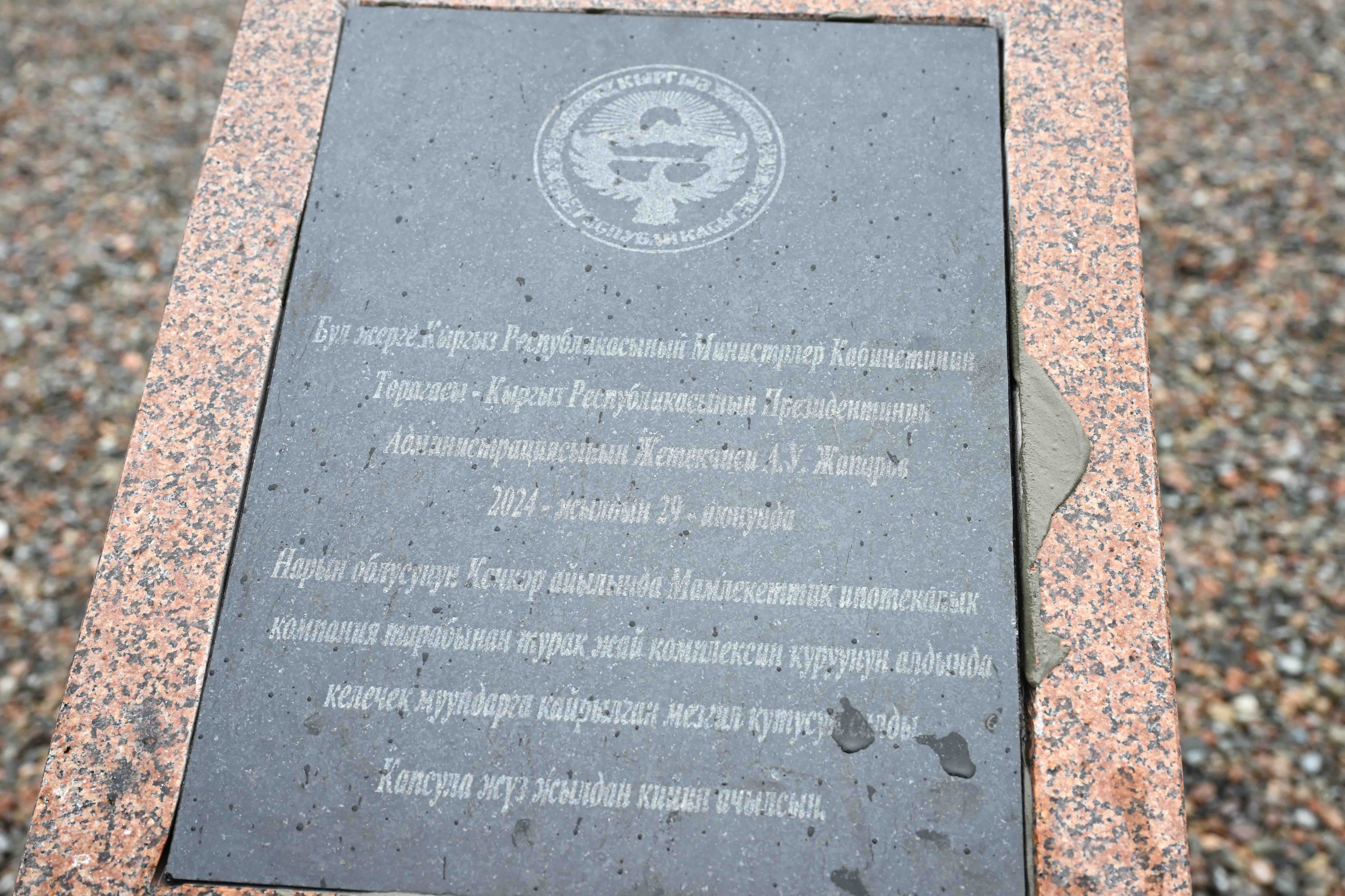 Кыргыз Республикасынын Министрлер Кабинетинин Төрагасы-Кыргыз Республикасынын Президентинин Администрациясынын Жетекчиси Акылбек Жапаров Нарын облусуна болгон жумушчу сапарынын алкагында Мамлекеттик ипотекалык компания (МИК) аркылуу Кочкор районунун Кочкор айылында 5 кабаттуу турак жайдын курулушуна мезгил кутучасын салуу аземине катышты.
