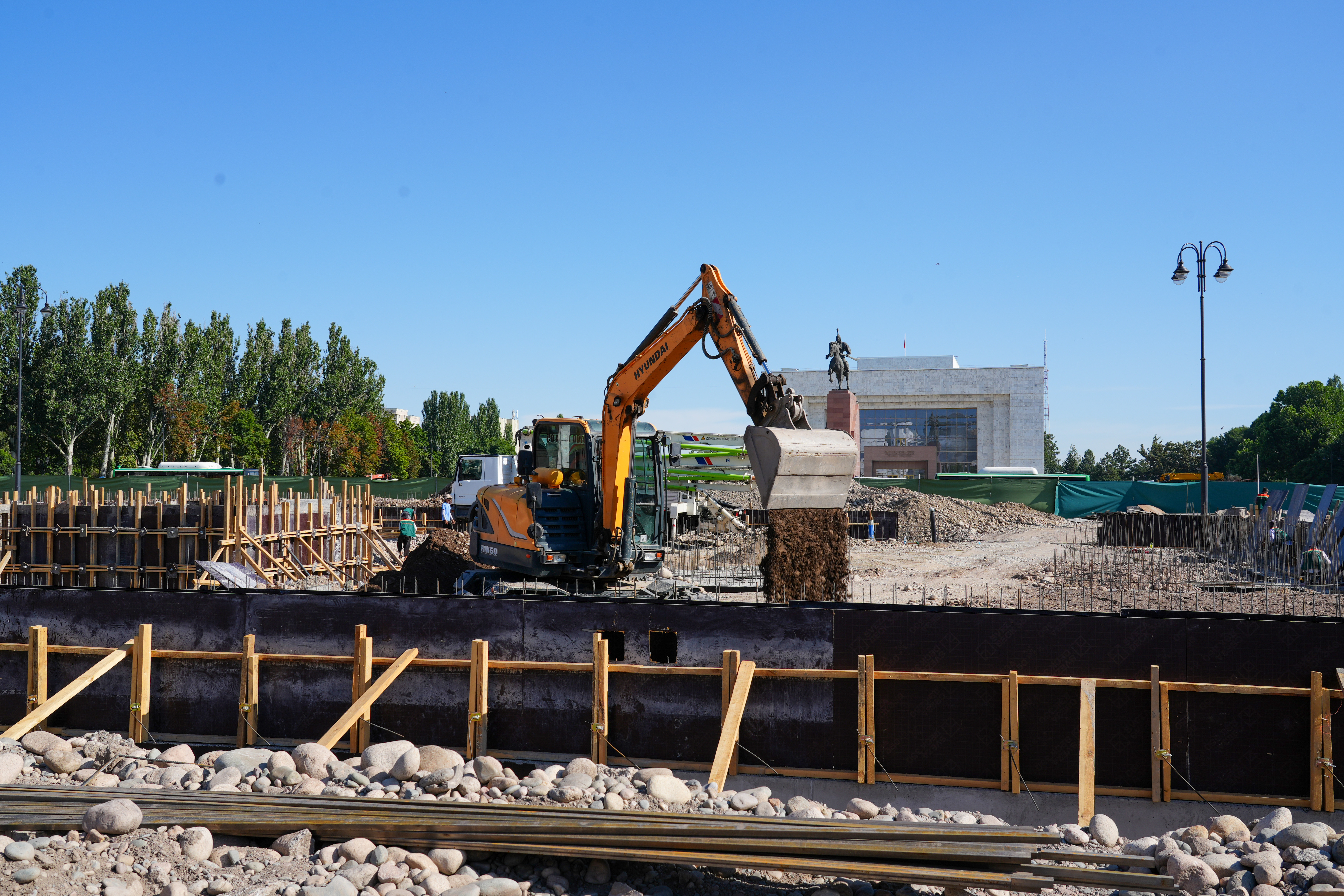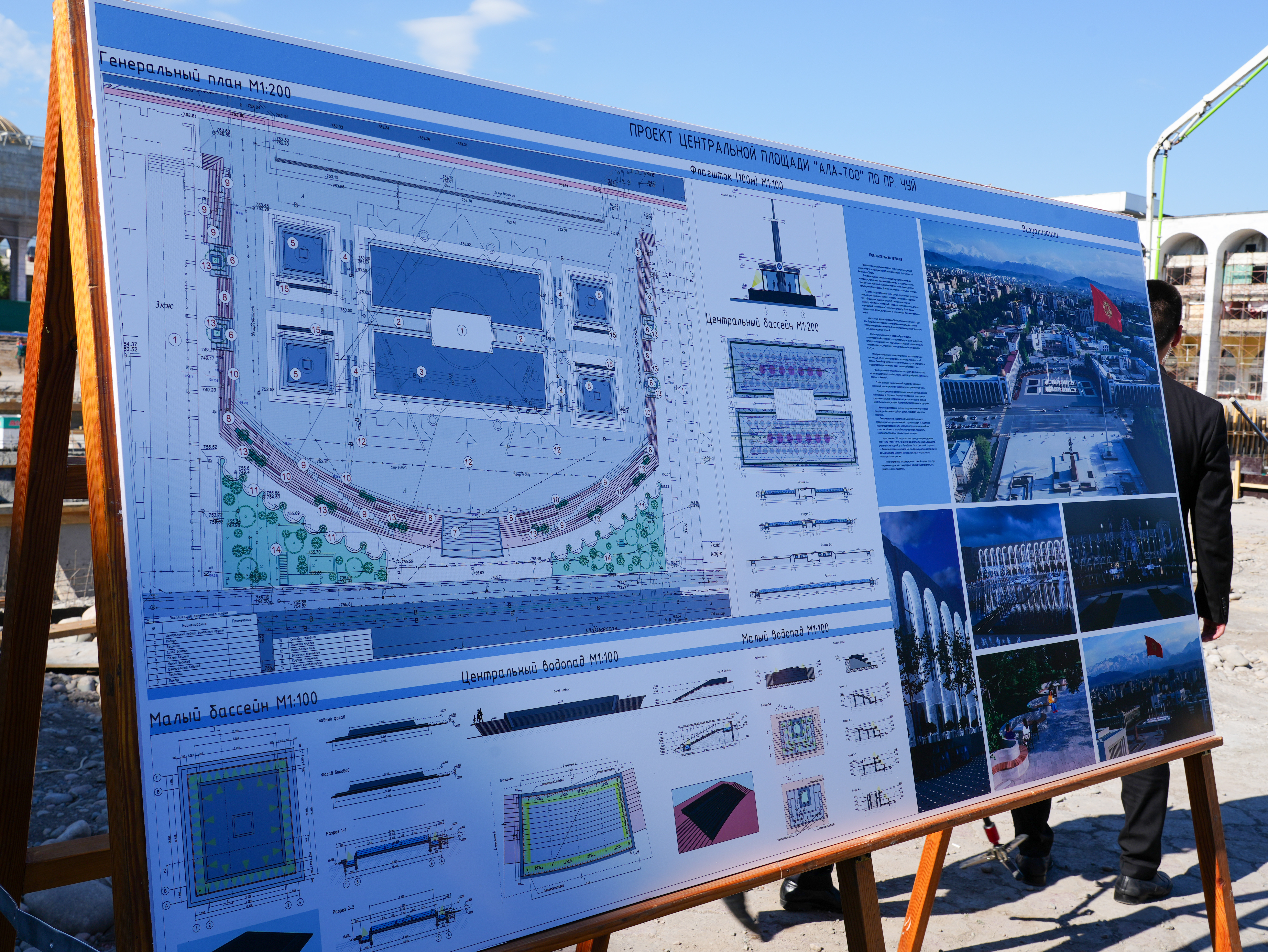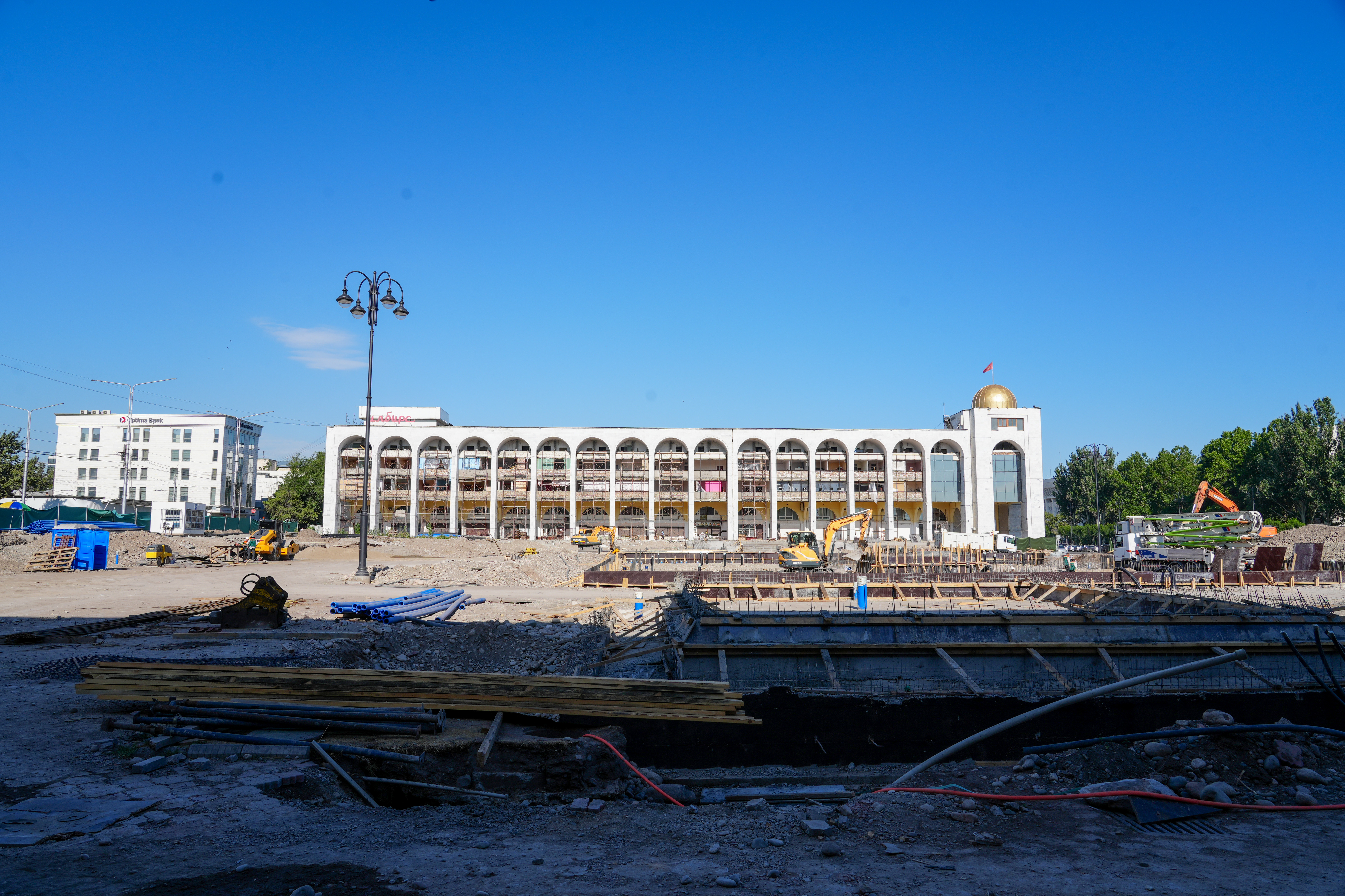 Аянтка заманбап фонтан комплекстери орнотулат, ошондой эле 100 метр бийиктиктеги флагшток орнотуу иштери жүрүп жатат.