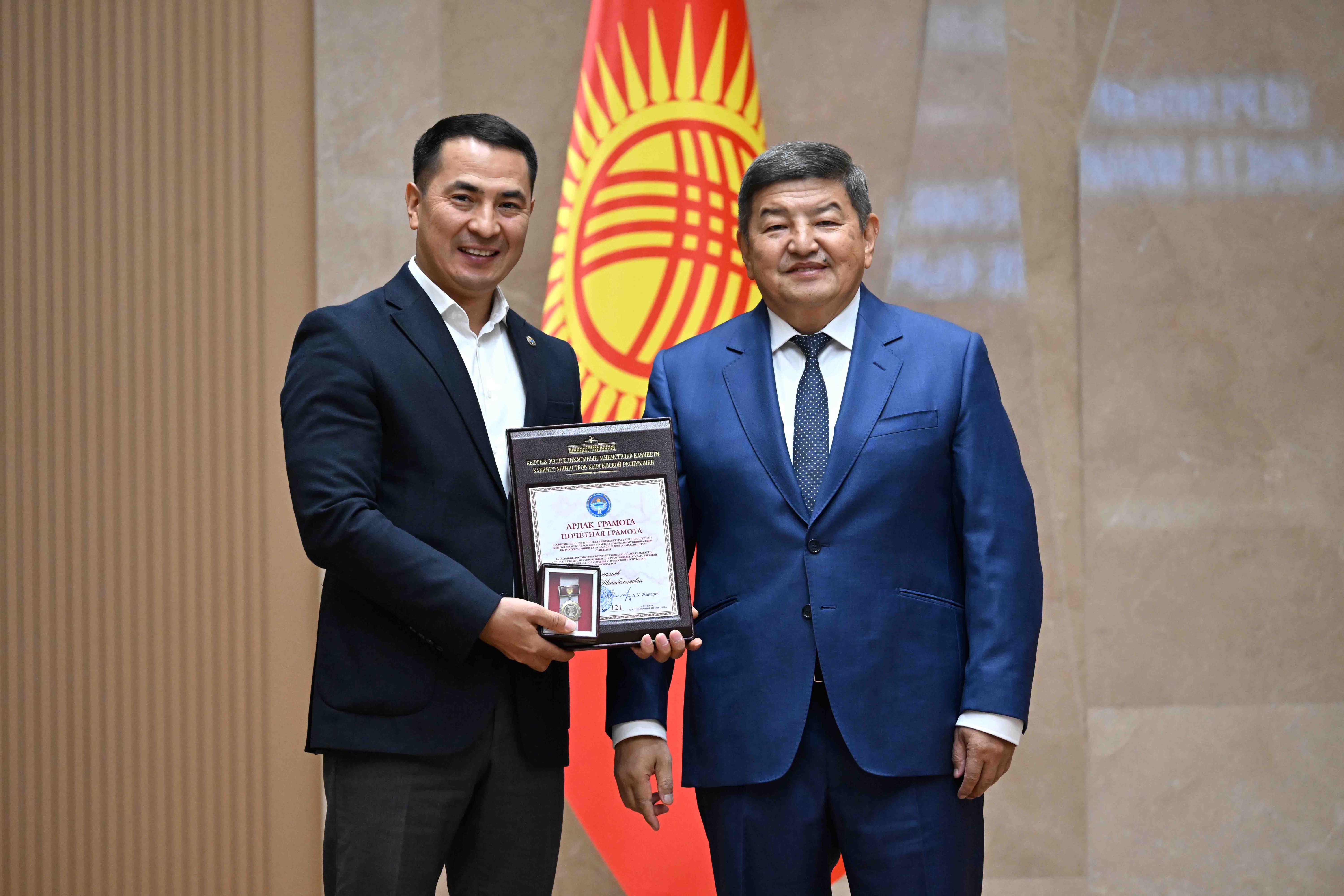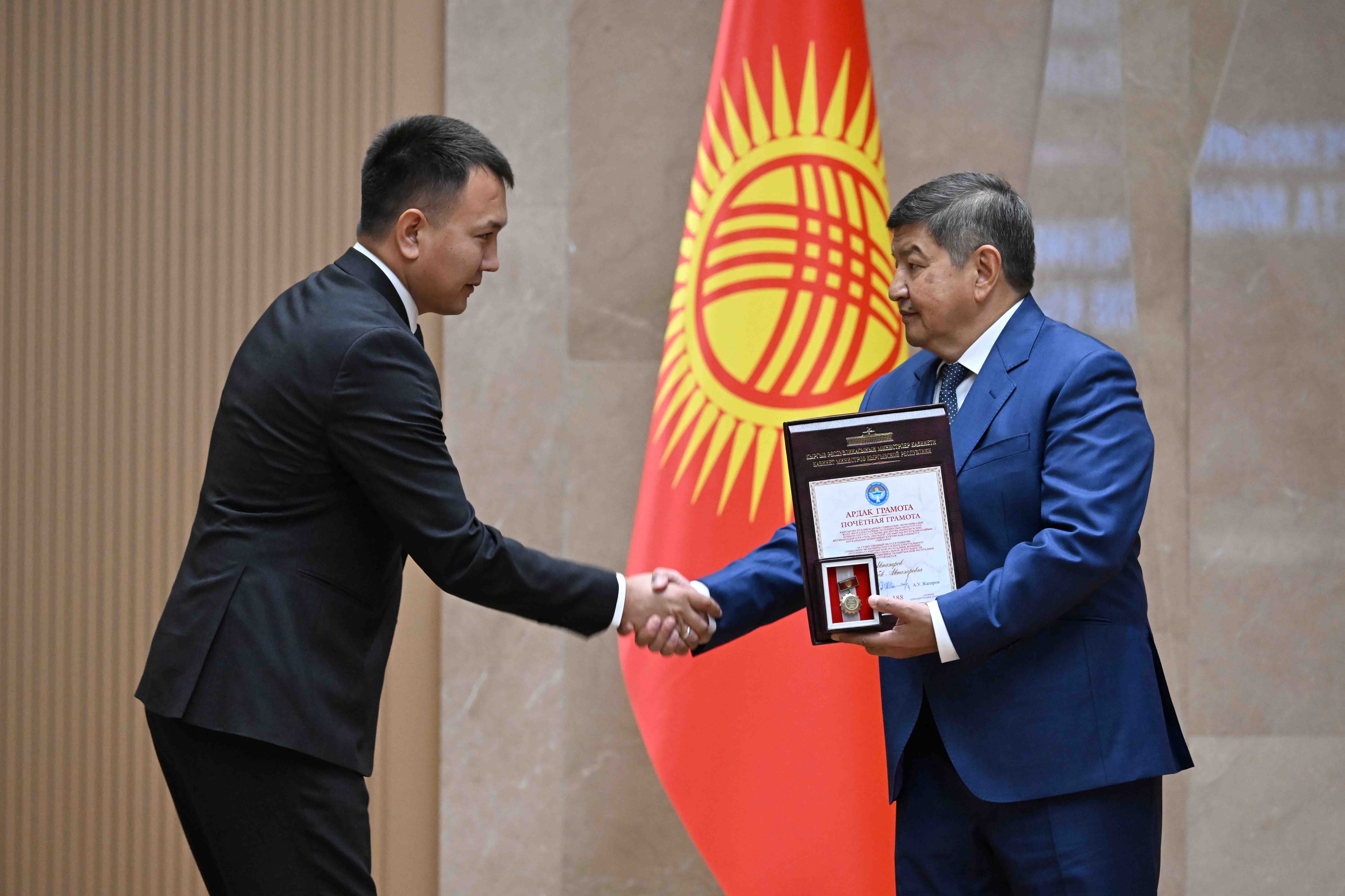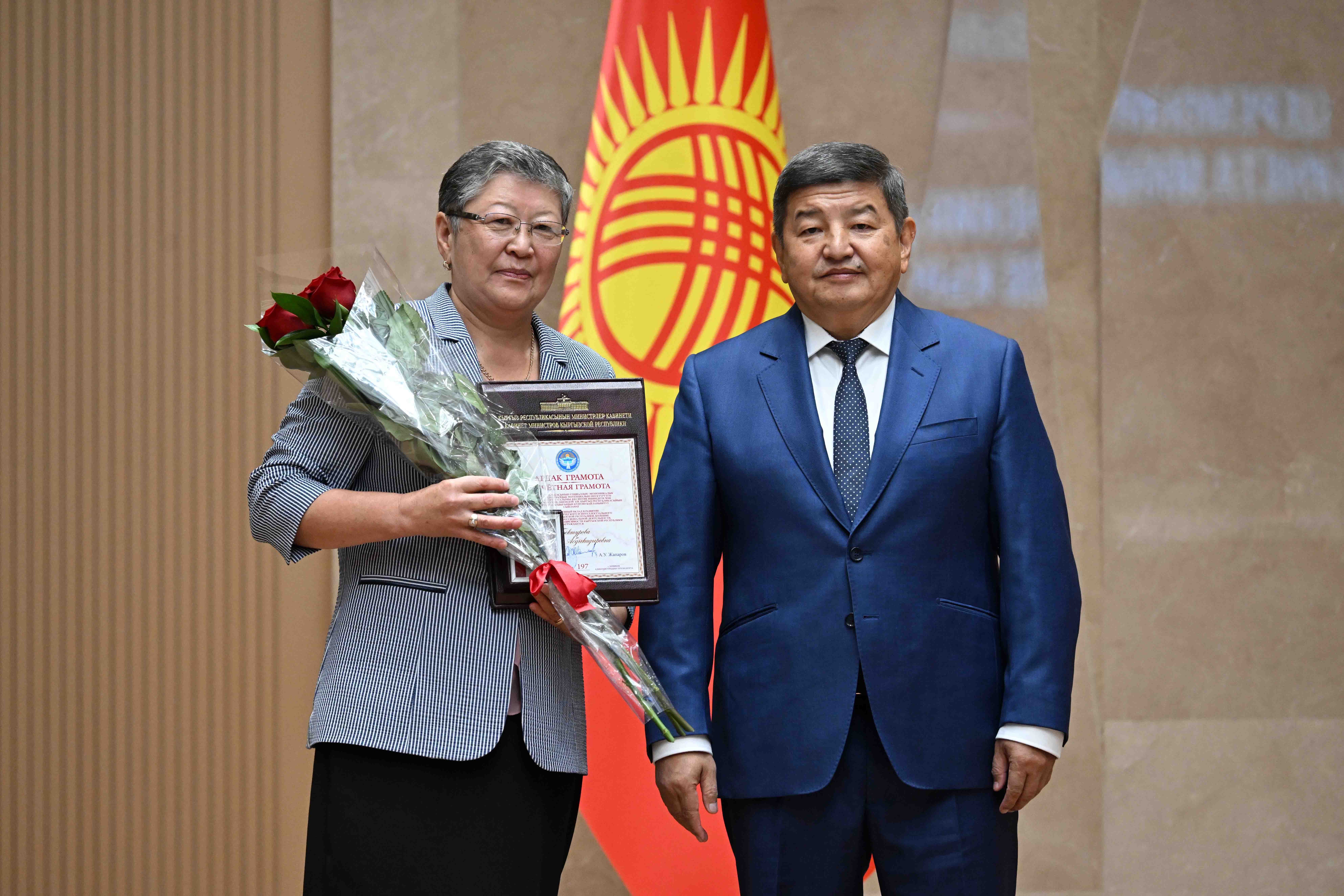 Кыргыз Республикасынын Министрлер Кабинетинин Төрагасы – Кыргыз Республикасынын Администрациясынын Жетекчиси Акылбек Жапаров экономиканы өнүктүрүүгө кошкон зор салымы, интеллектуалдык потенциалы бийик жана өз кесиптик чөйрөсүндө ийгилик жараткан, профессионалдык ишмердүүлүгүндө өзгөчөлөнгөн жарандарга Кыргыз Республикасынын Министрлер Кабинетинин Ардак грамоталарын тапшырды.