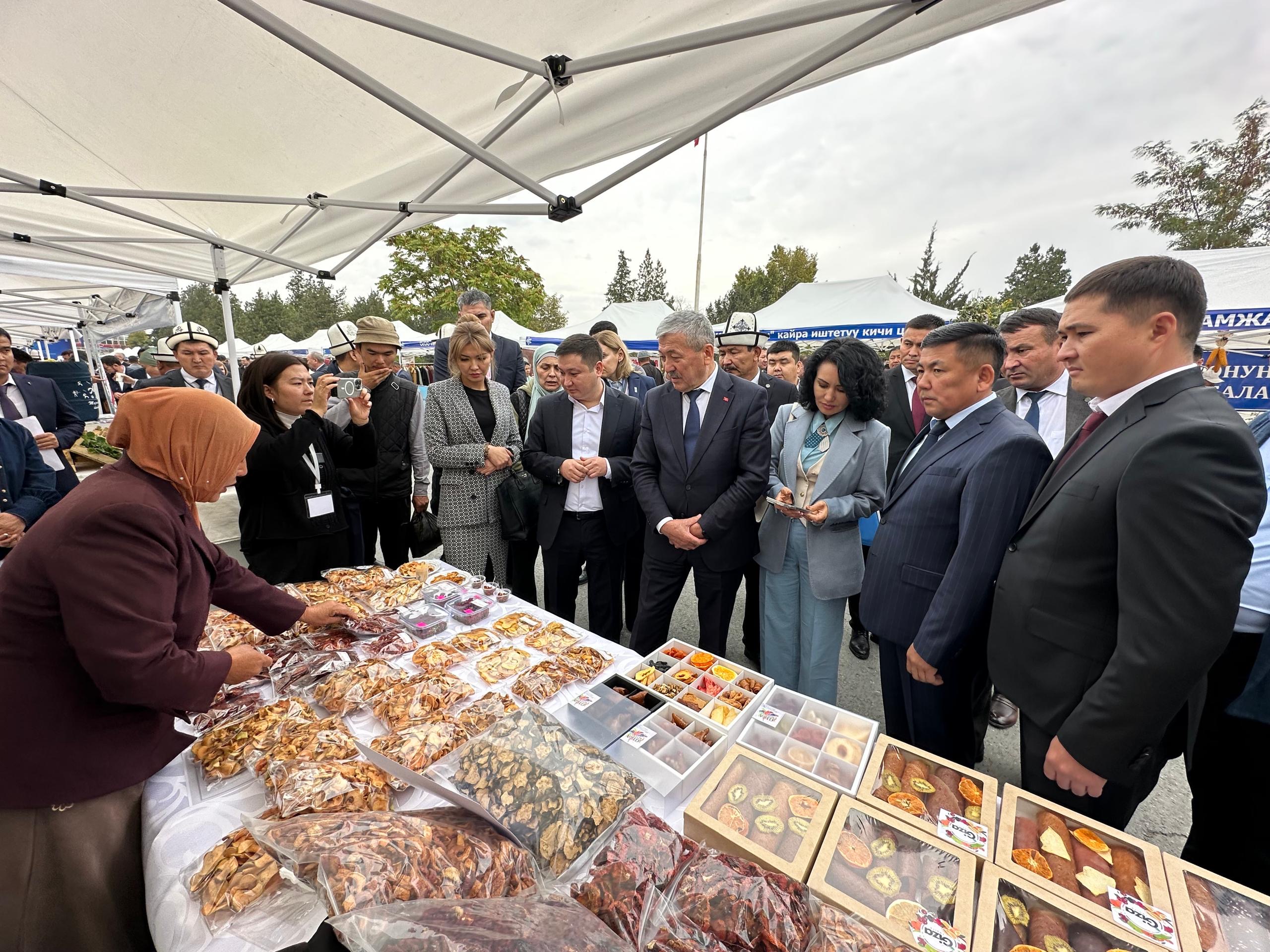 Андан ары МинКаб Төрагасынын биринчи орун басары Адылбек Касымалиев “Баткендин өнүгүүсү – өлкөнүн өнүгүүсү” форумунун алкагында жергиликтүү өндүрүүчүлөрдүн түрдүү товарлары коюлган тамак-аш көргөзмөсүнө барды. Ал аймактын экономикалык өсүшүнүн негизги кыймылдаткычтары катары жергиликтүү айыл чарбаны жана тамак-аш өнөр жайын колдоонун маанилүүлүгүн белгиледи.