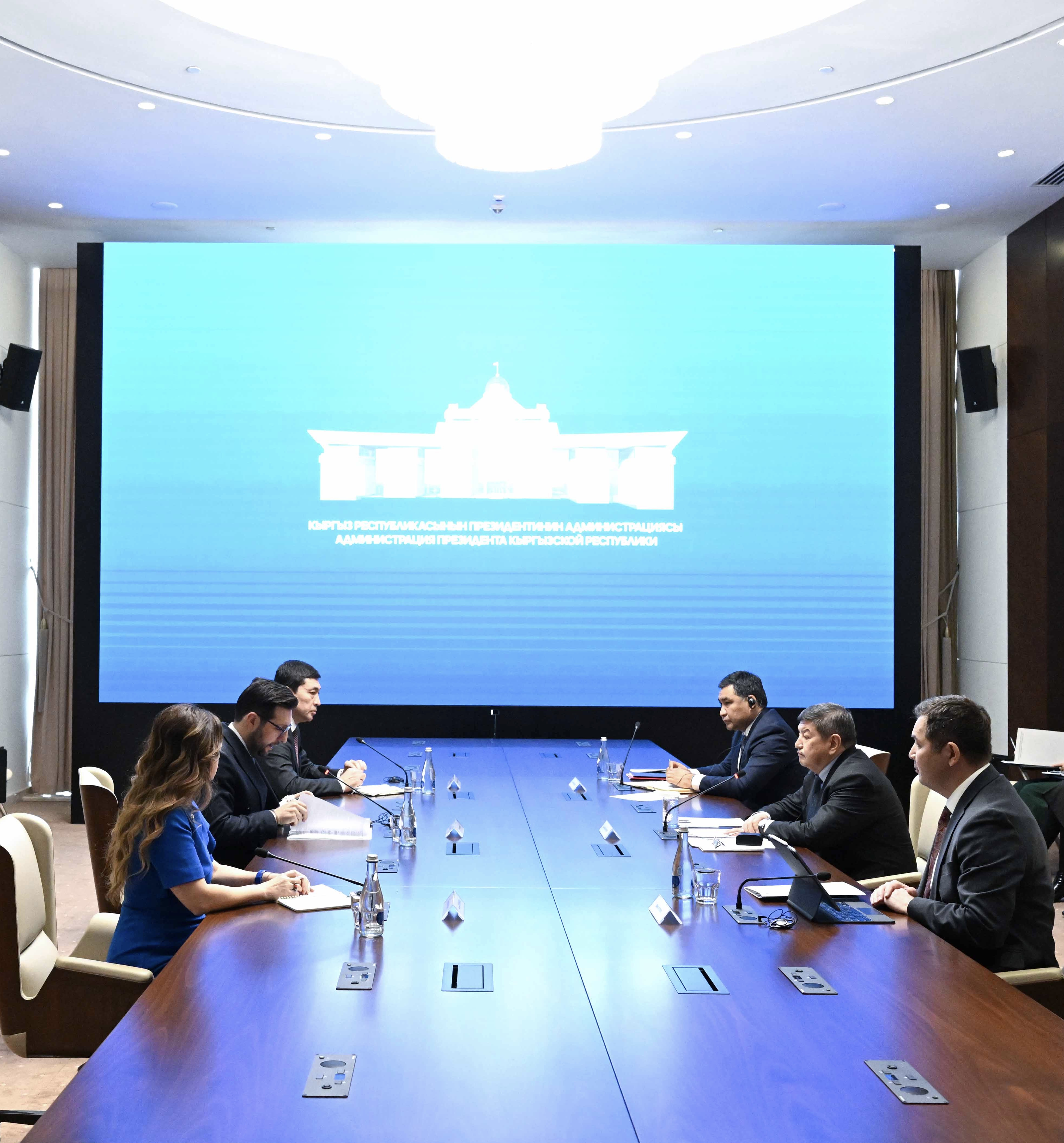 Кыргыз Республикасынын Министрлер Кабинетинин Төрагасы – Кыргыз Республикасынын Президентинин Администрациясынын Жетекчиси Акылбек Жапаров менен Европа реконструкциялоо жана өнүктүрүү банкынын (ЕРӨБ) Борбордук Азия боюнча башкаруучу директору Хусейн Озхандын жолугушуусунун жүрүшүндө экономика, тоо-кен, каржы жана инвестиция тармактарында кызматташуу боюнча сүйлөшүү жүргүзүлдү.
