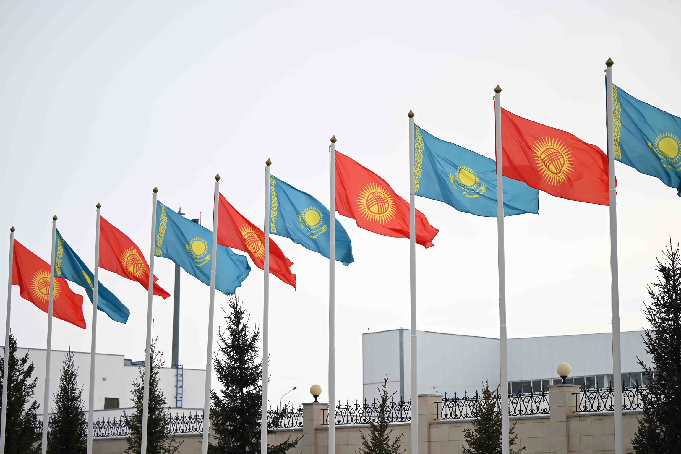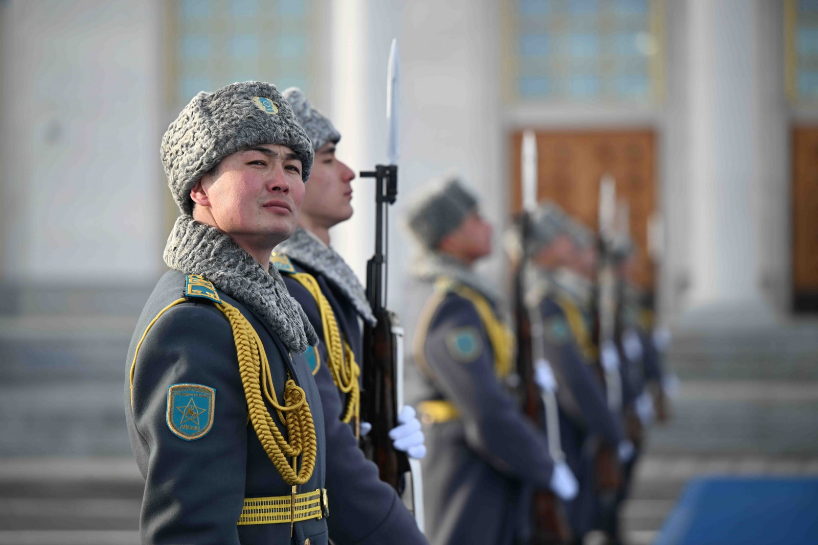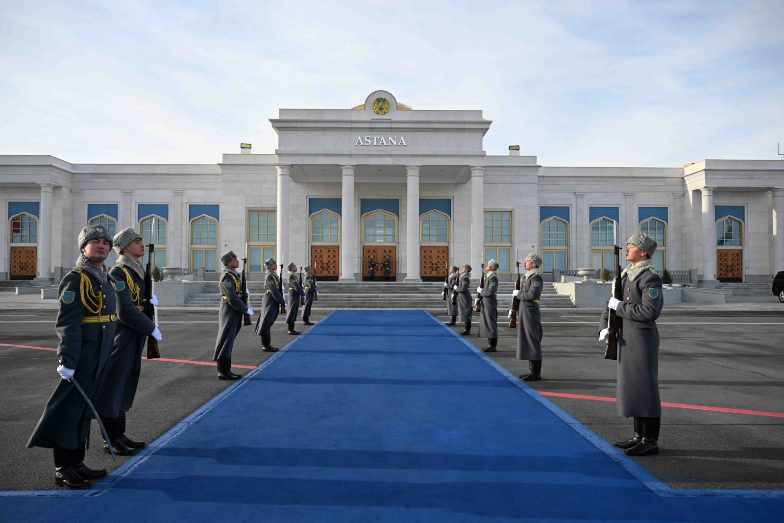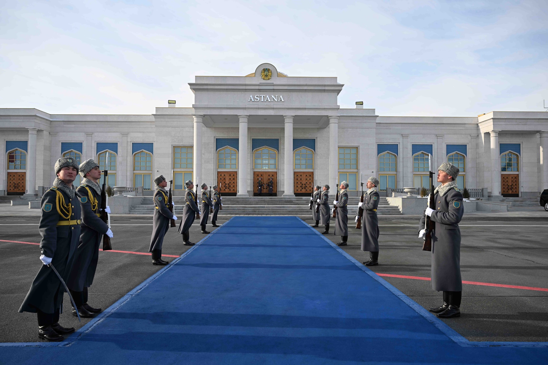 Аэропортто эки мамлекеттин желектери илинип, ошондой эле ардакдуу кароол тизилген.