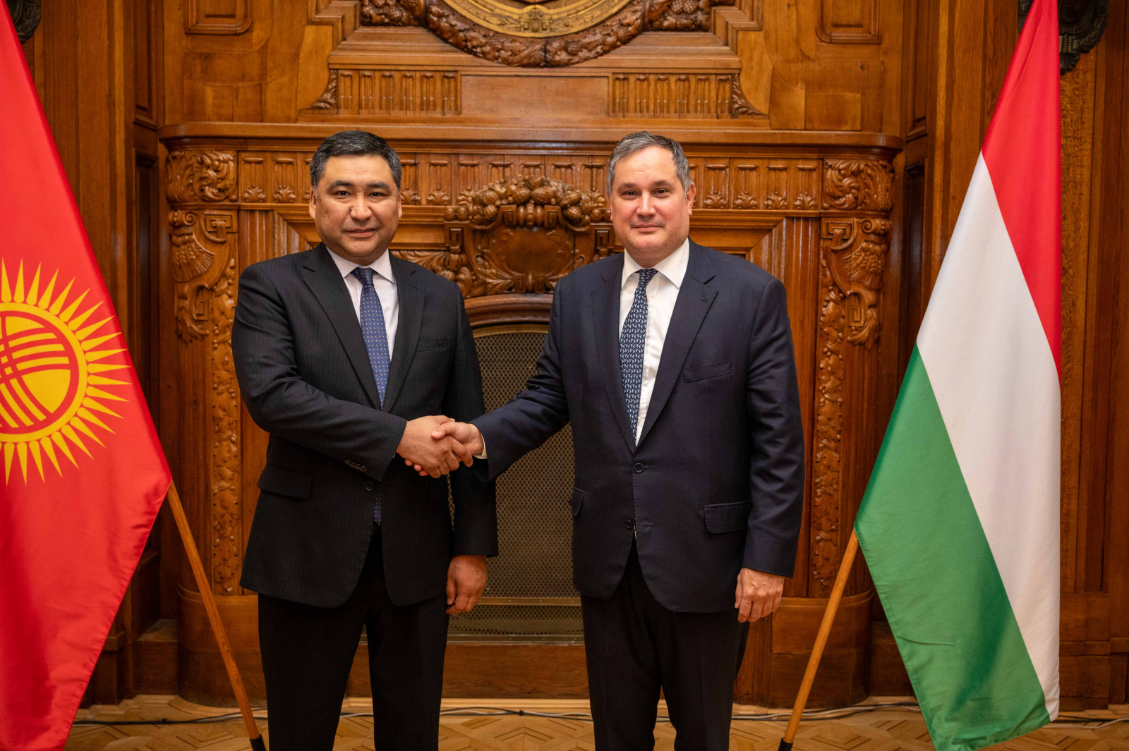 Будапешт, Венгрия, 2024-жылдын 24-февралы – Венгрияга болгон жумушчу сапарынын алкагында Кыргыз Республикасынын Министрлер Кабинетинин Төрагасынын биринчи орун басары Данияр Амангелдиев Венгриянын Улуттук экономика министри Мартон Надь менен жолугушту.