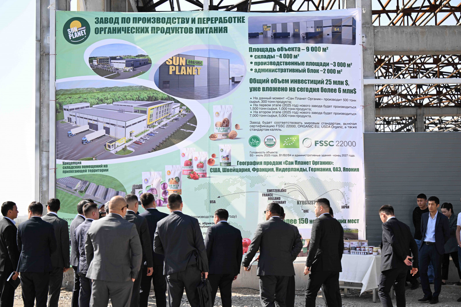 Ошондой эле МинКаб башчысы Адылбек Касымалиев “Сан Планет Интернэшнл” ЖЧКсы тарабынан курулуп жаткан жергиликтүү өндүрүштөгү мөмө-жемиш жана жашылча азыктарын кайра иштетүүчү ишкана менен таанышты. “Сан Планет Интернешнл” - компания сертификацияланган органикалык продукцияны өндүрүп, Европа биримдигинин өлкөлөрүнө, Россия Федерациясына, Кытайга жана АКШга экспорттойт. Өздүк инвестициялардын жалпы болжолдуу көлөмү кеминде 23 млн 400 миң долларын түзүп, ага 2500 м2 өндүрүштүк жайлары, 3000 м2 кампа жайлары жана1000 м2 административдик жана көмөкчү жайларды куруу иштери жүрүүдө. Өндүрүштү ишке киргизүүдө жергиликтүү тургундарды 250 жаңы жумуш орун менен камсыздоо болжолдонууда, чийки затты сатып алуу райондун 2000ден ашуун фермери тарабынан ишке ашырылаары күтүлүп жатат.