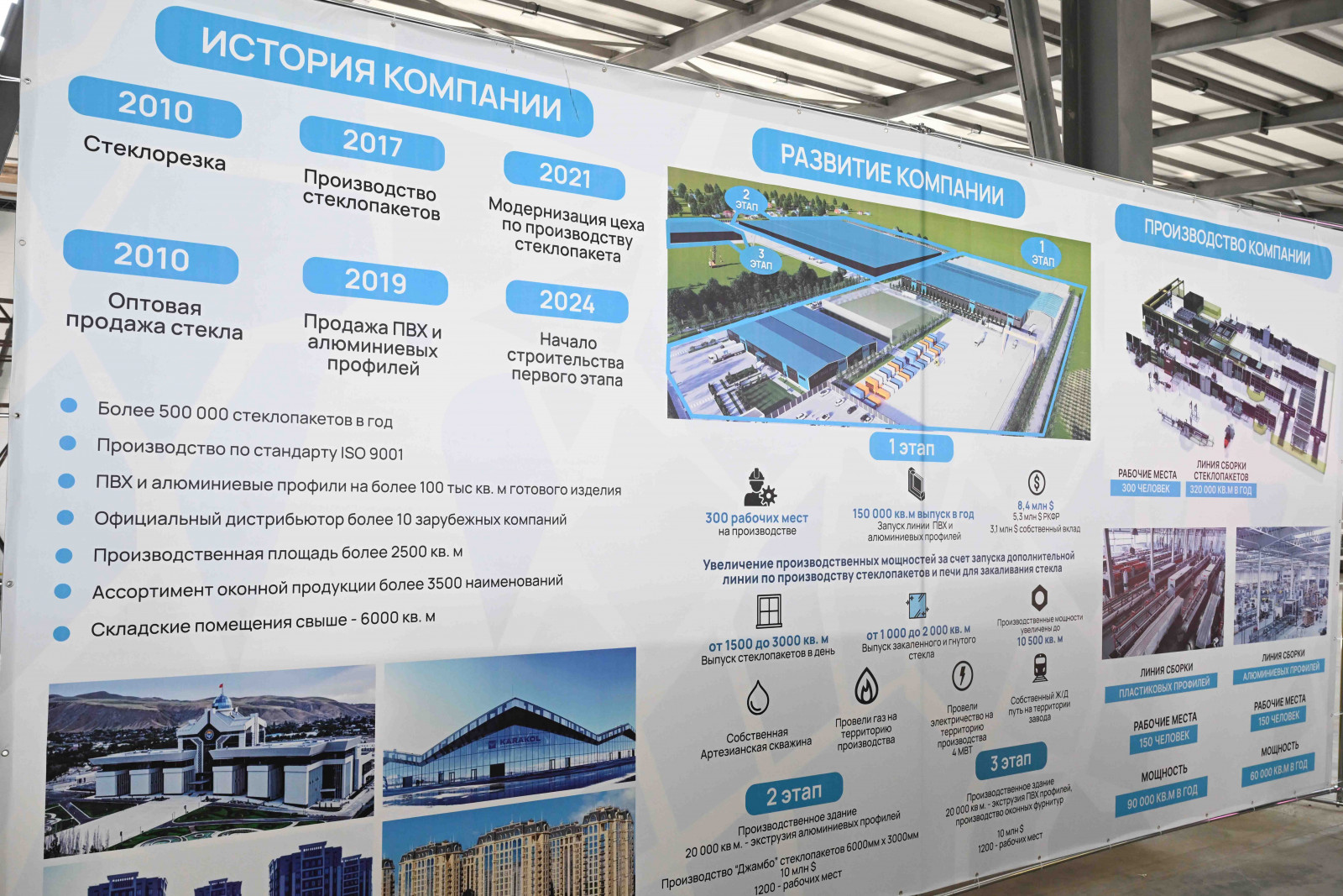 Андан ары МинКаб башчысы Адылбек Касымалиев “Глассленд Компани” ЖЧКсынын стеклопакет жабдуулардын чогултуу жана терезе өндүрүү ишканасынын ишмердүүлүгүнөн кабар алды. Ишканада учурда куруу жана жабдыктарды орнотуу иштери 95 пайыз аяктап, кошумча электр линиясын тартуу иштери жүрүп жатат.