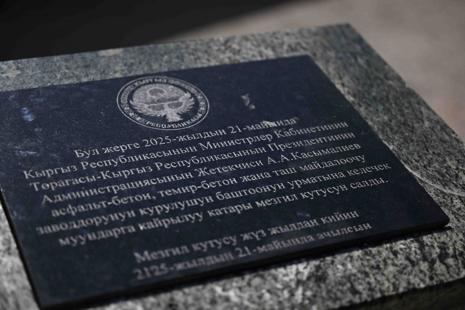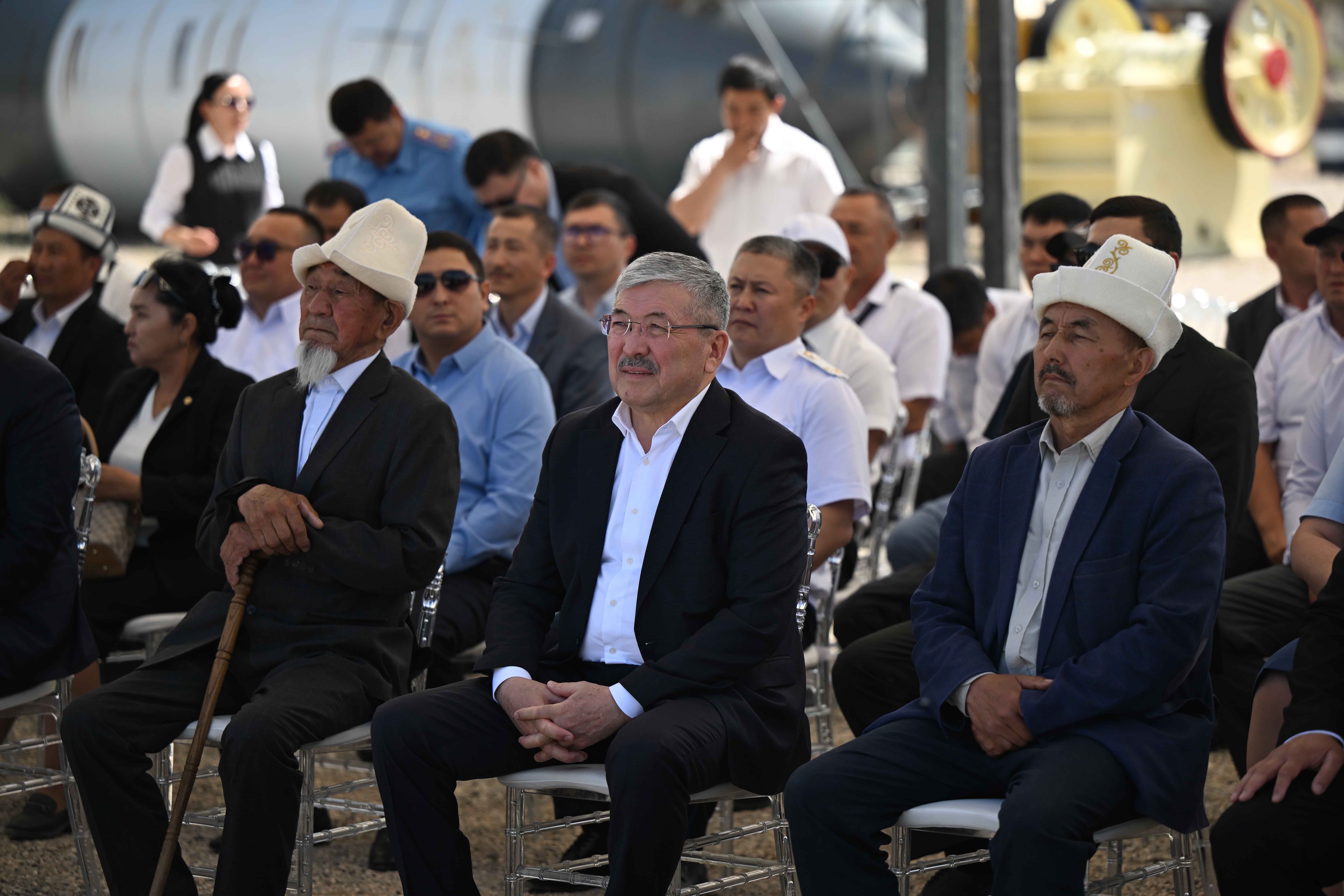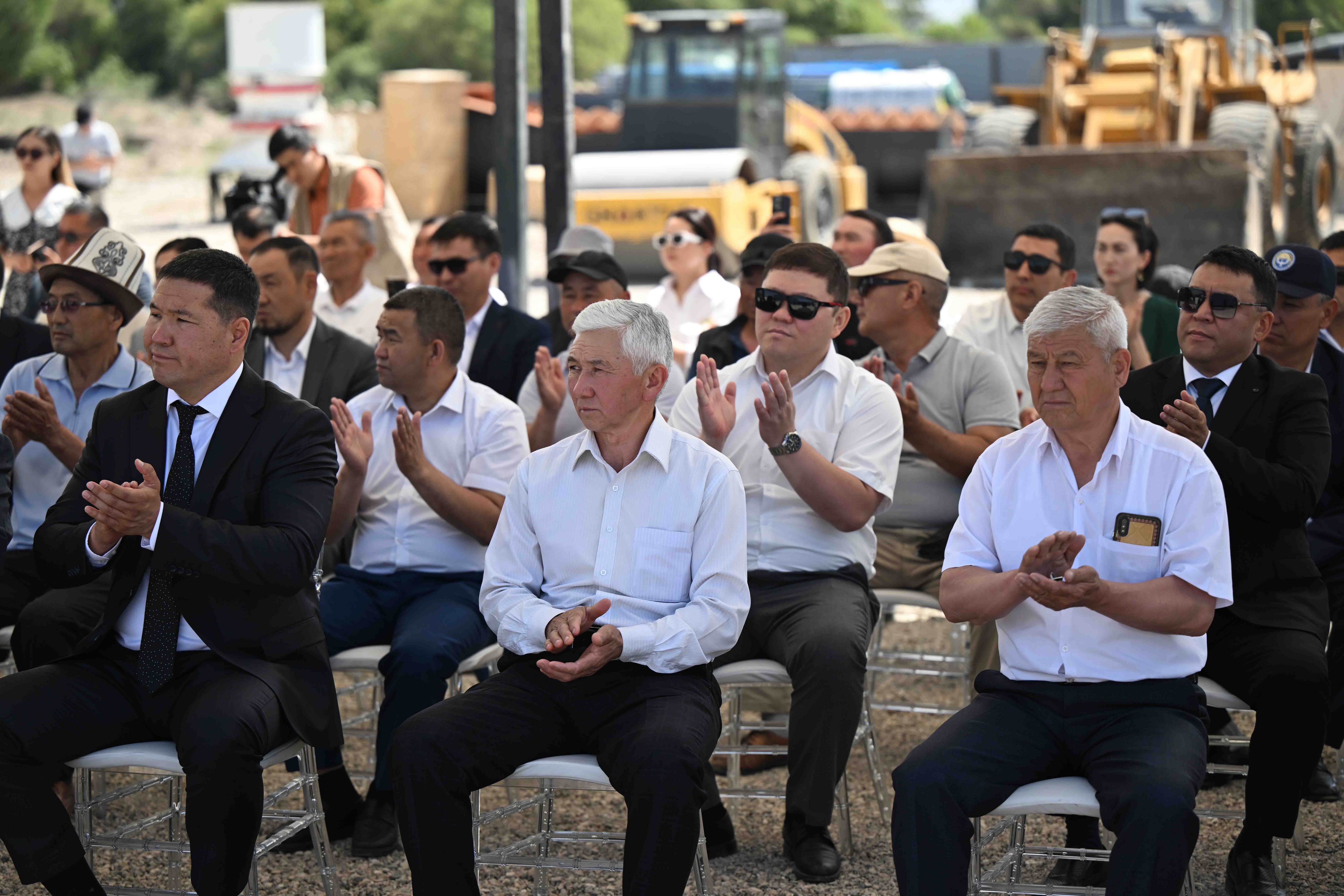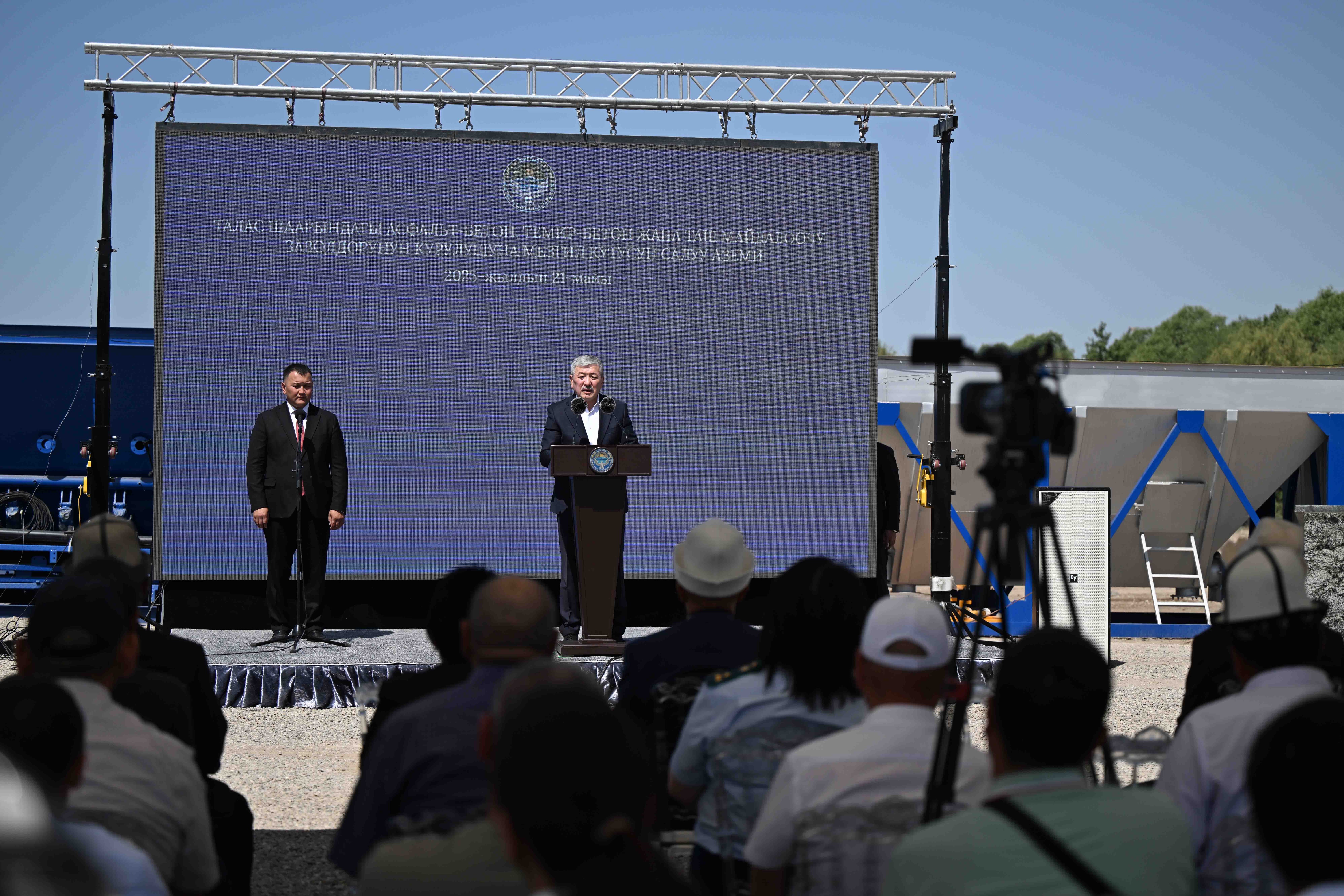 Кыргыз Республикасынын Министрлер Кабинетинин Төрагасы - Президенттин Администрациясынын Жетекчиси Адылбек Касымалиев Талас шаарында асфальт-бетон, темир-бетон жана таш майдалоочу заводдорун куруу үчүн капсула салуу аземине катышты.