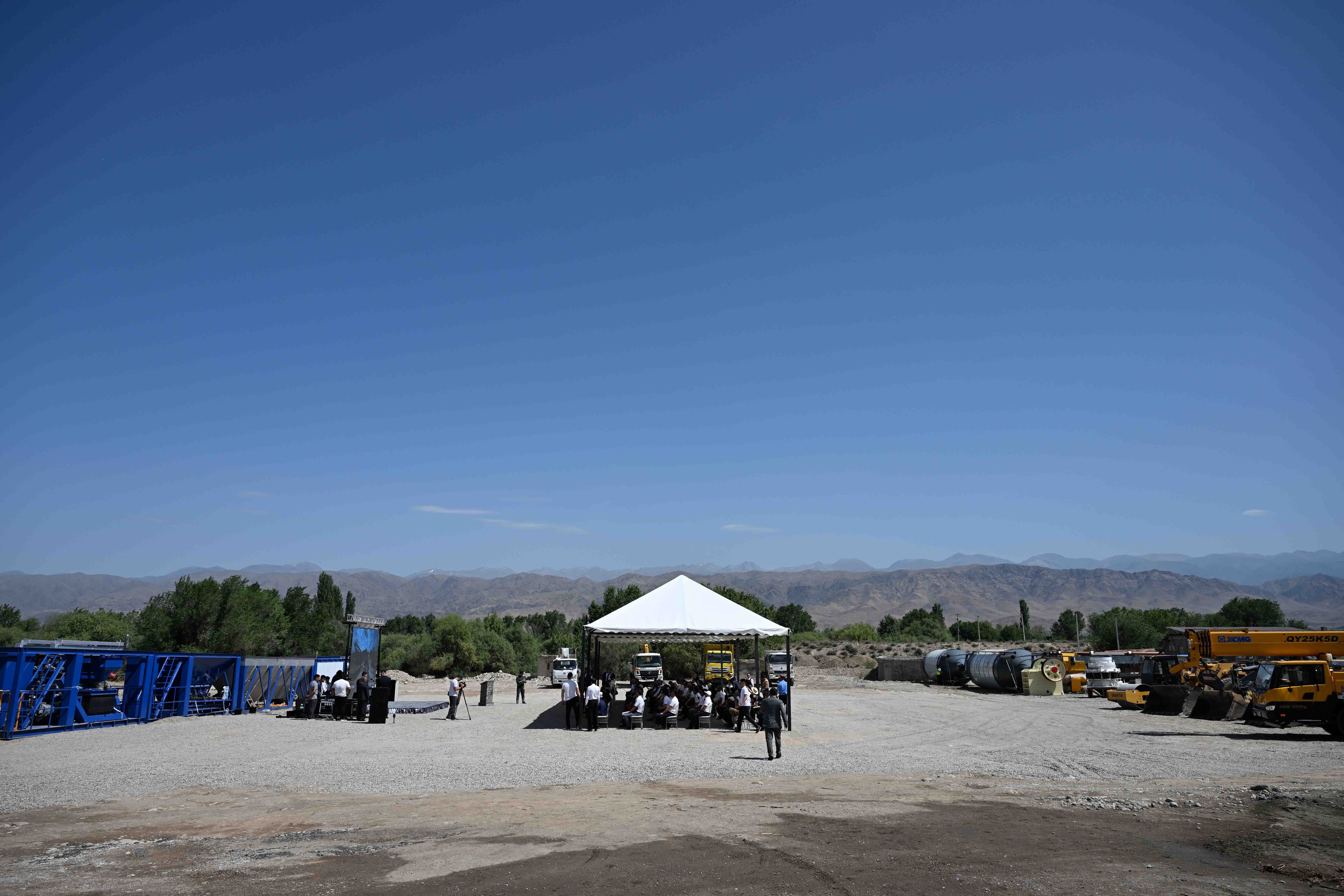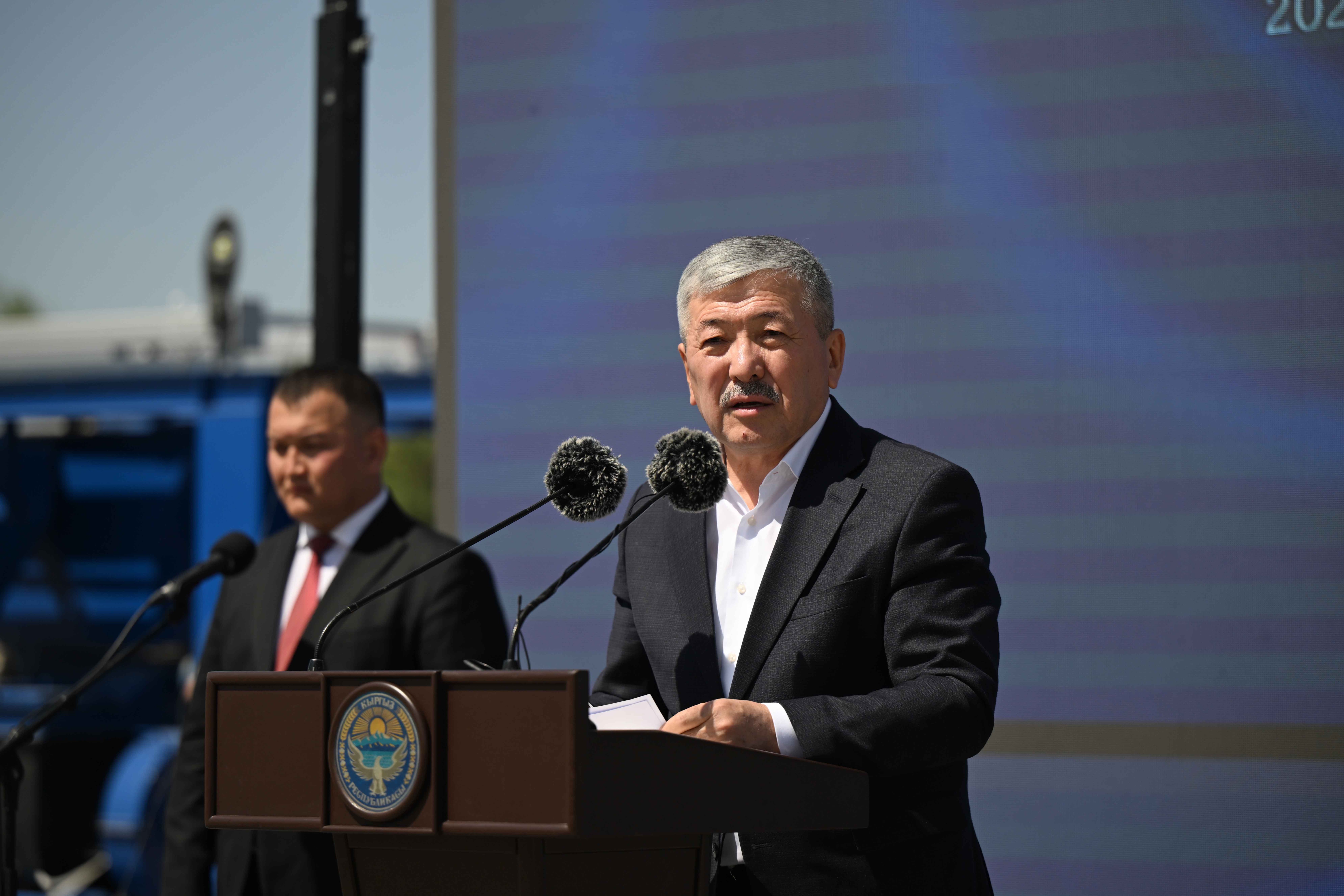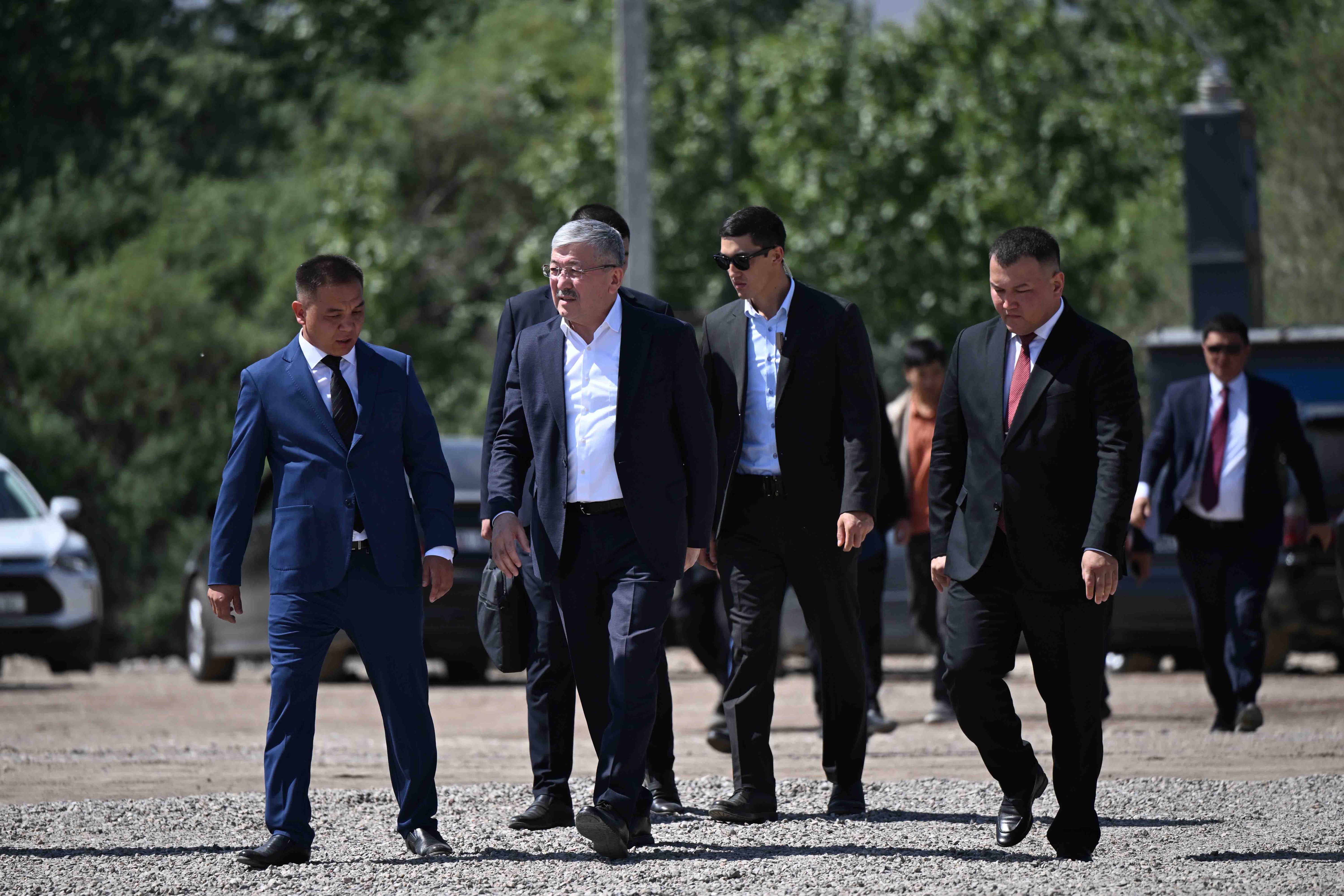 Кыргыз Республикасынын Министрлер Кабинетинин Төрагасы - Президенттин Администрациясынын Жетекчиси Адылбек Касымалиев Талас шаарында асфальт-бетон, темир-бетон жана таш майдалоочу заводдорун куруу үчүн капсула салуу аземине катышты.