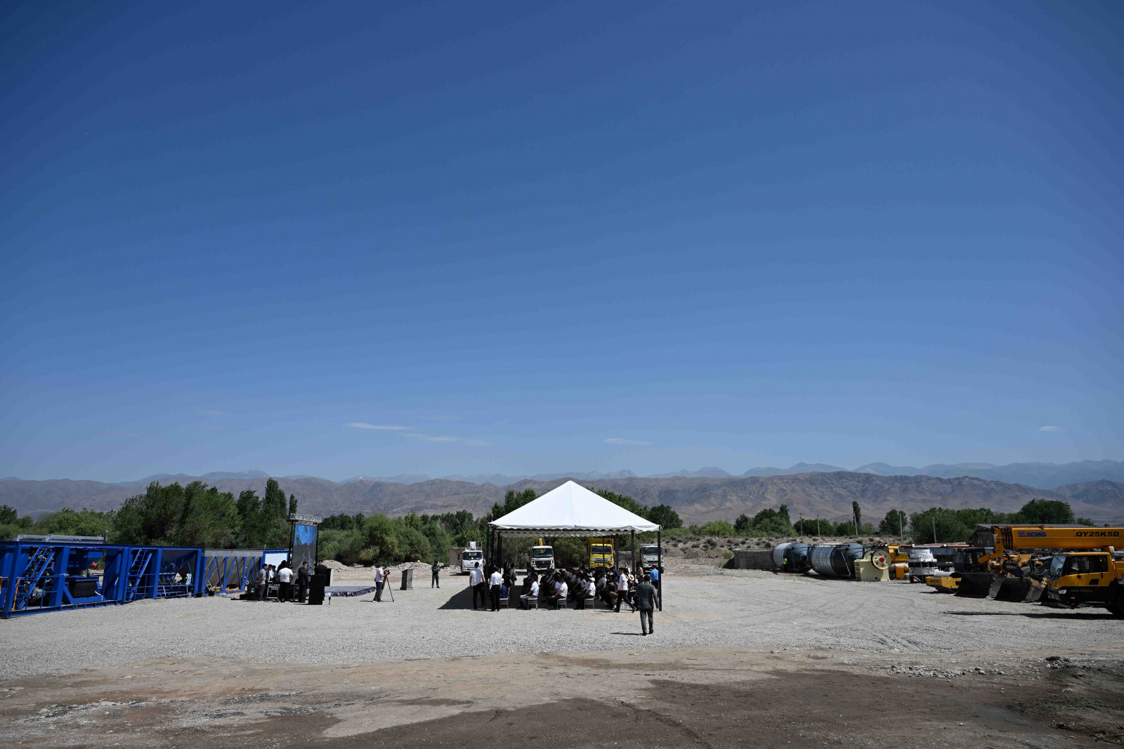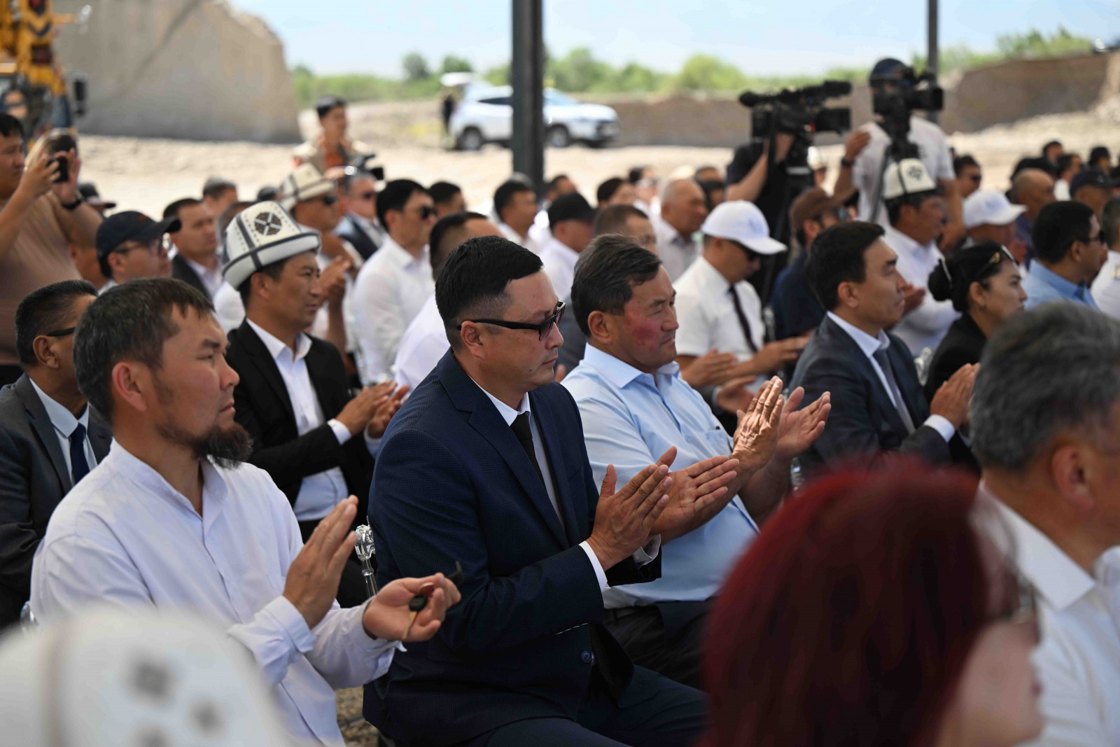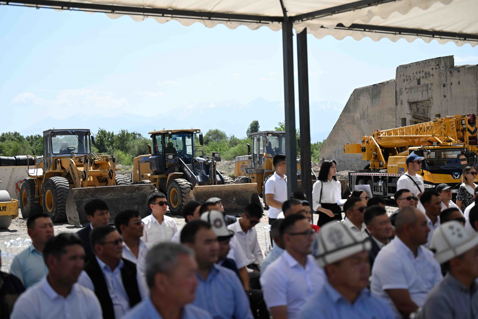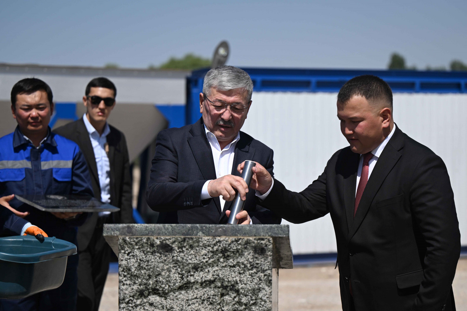 Кыргыз Республикасынын Министрлер Кабинетинин Төрагасы - Президенттин Администрациясынын Жетекчиси Адылбек Касымалиев Талас шаарында асфальт-бетон, темир-бетон жана таш майдалоочу заводдорун куруу үчүн капсула салуу аземине катышты.