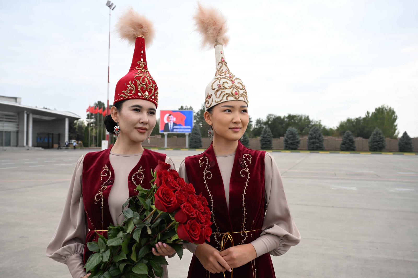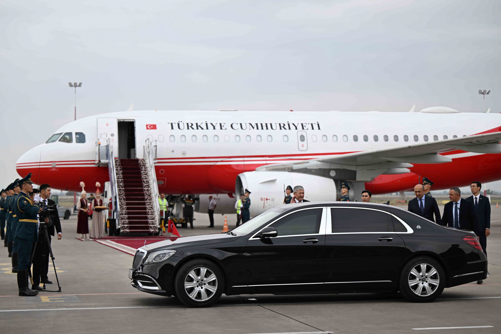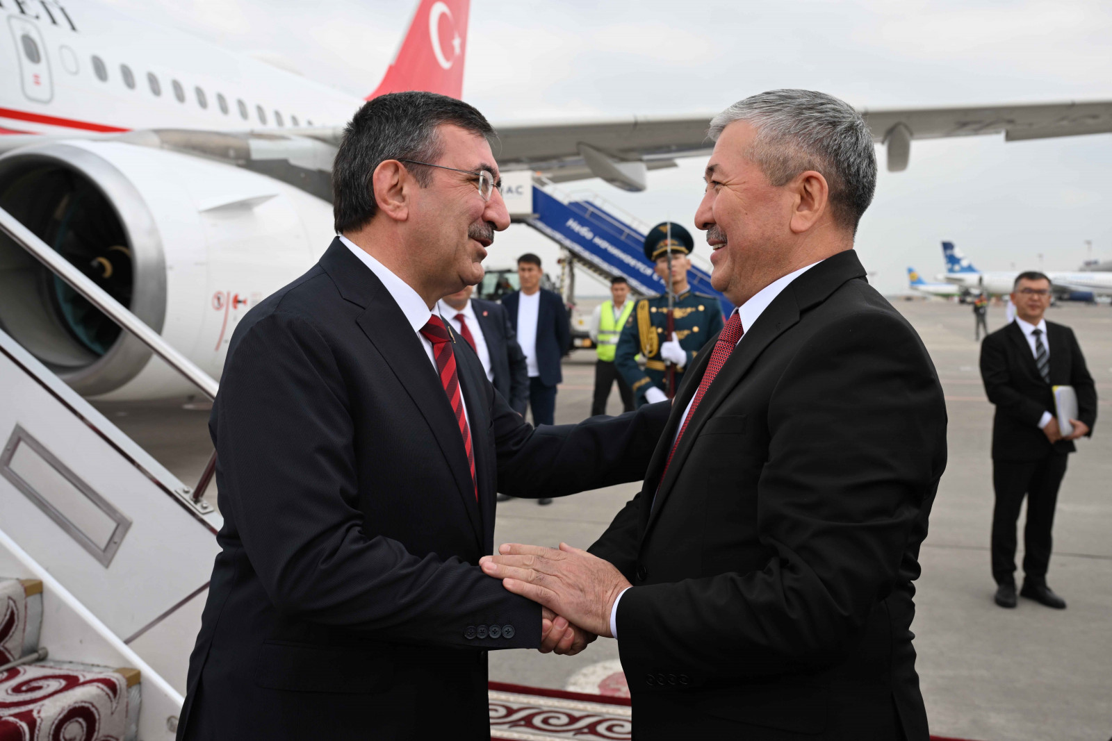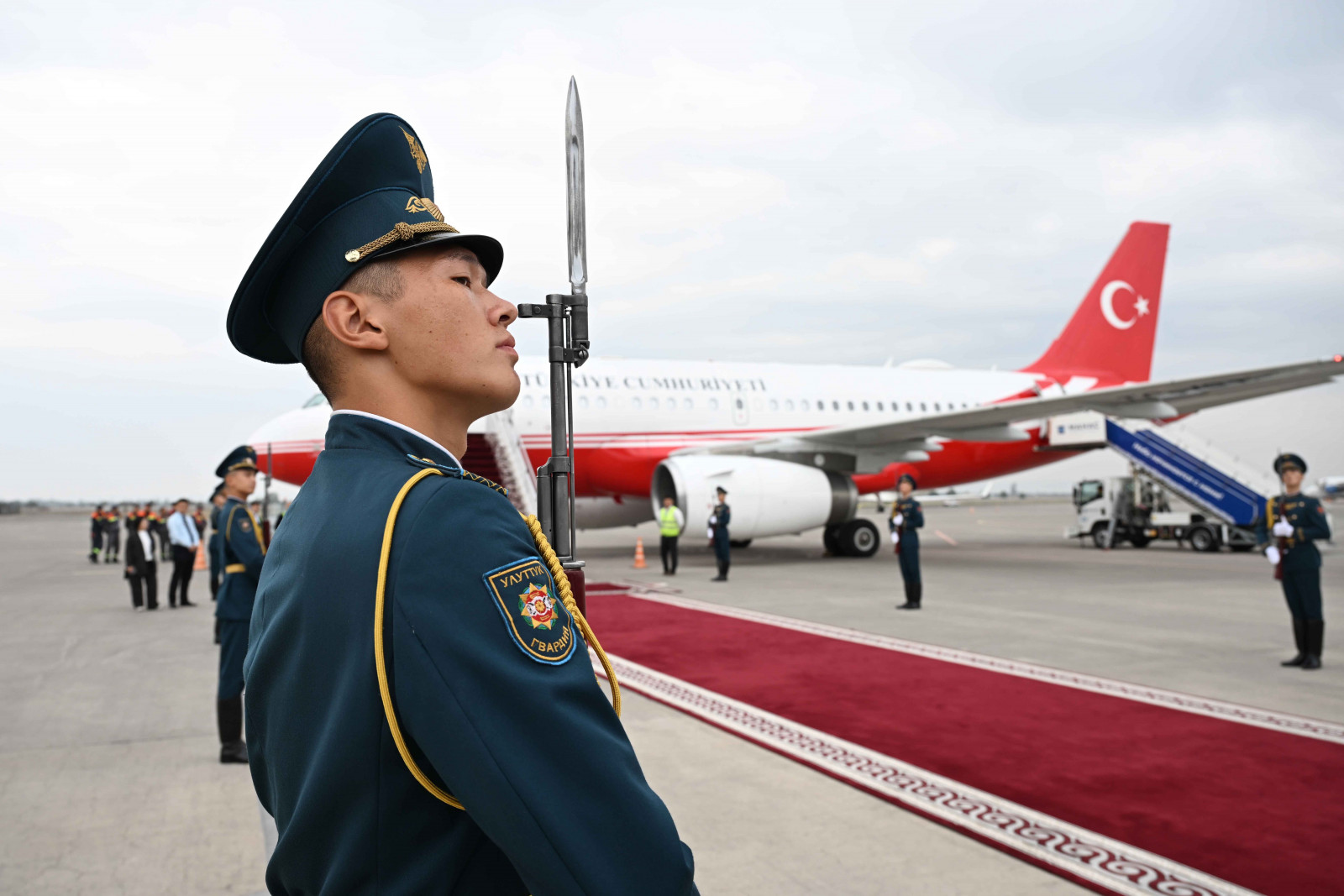 Аэропортто эки мамлекеттин туулары илинип, Ардактуу кароол ротасы тизилип, килем төшөлдү.