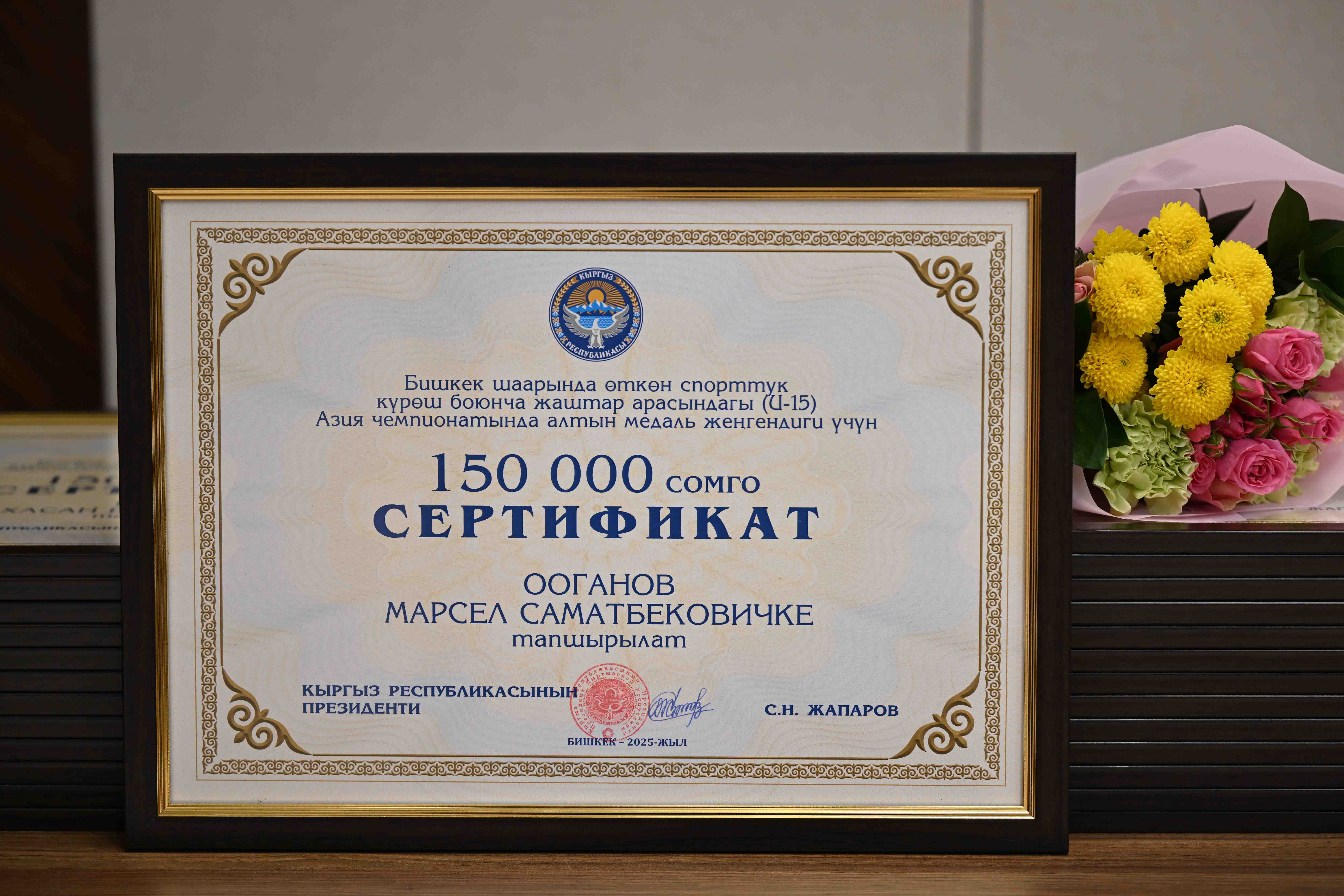 Алтын, күмүш жана коло медалдардын ээлерине 150 000, 100 000 жана 50 000 сомдук акчалай сыйлыктардын сертификаттары тапшырылды.