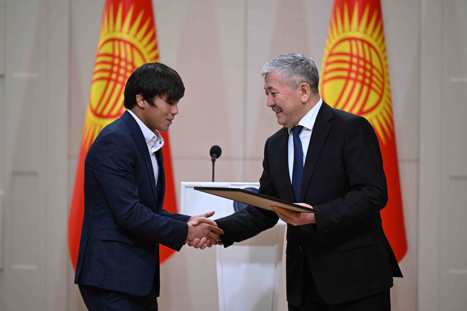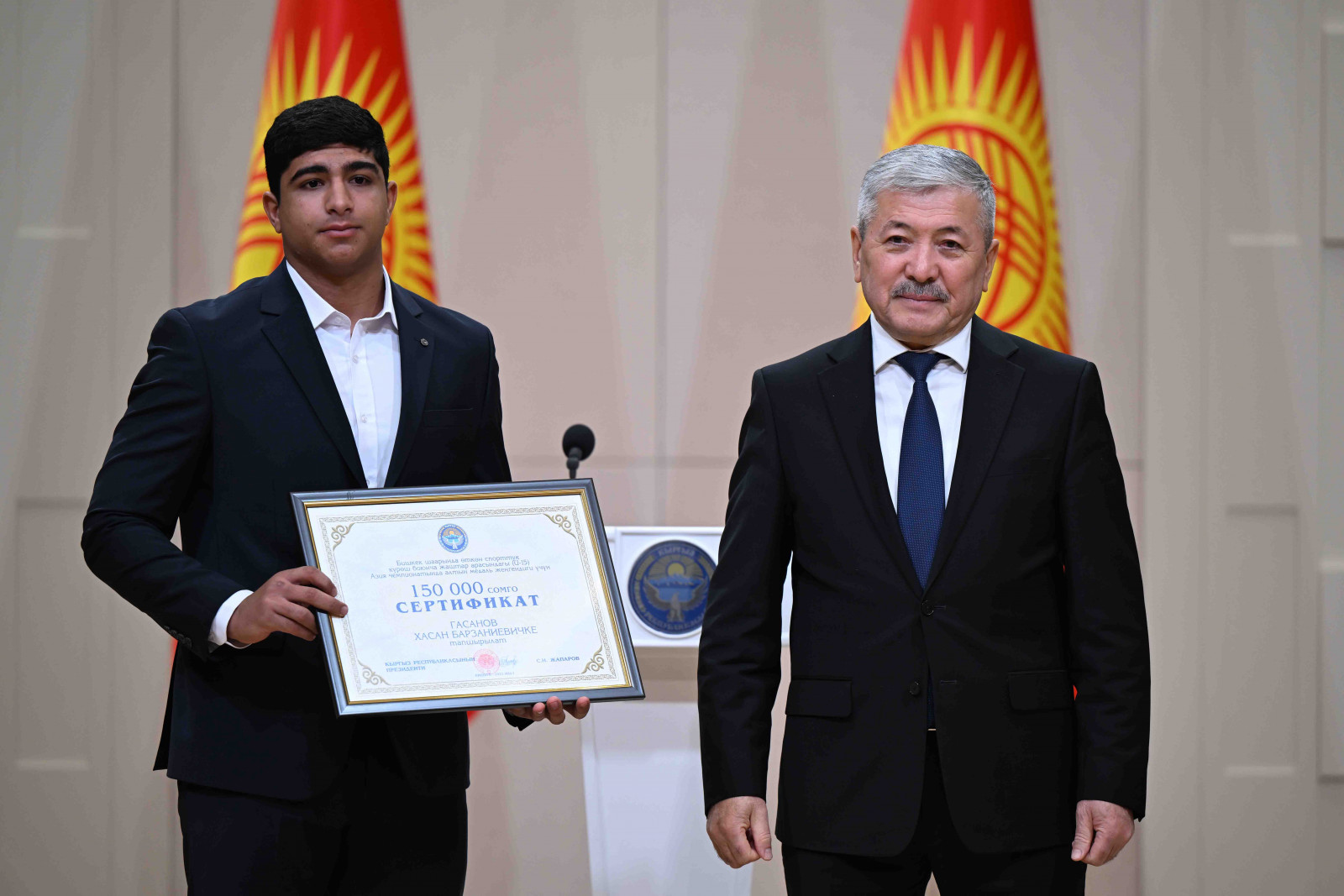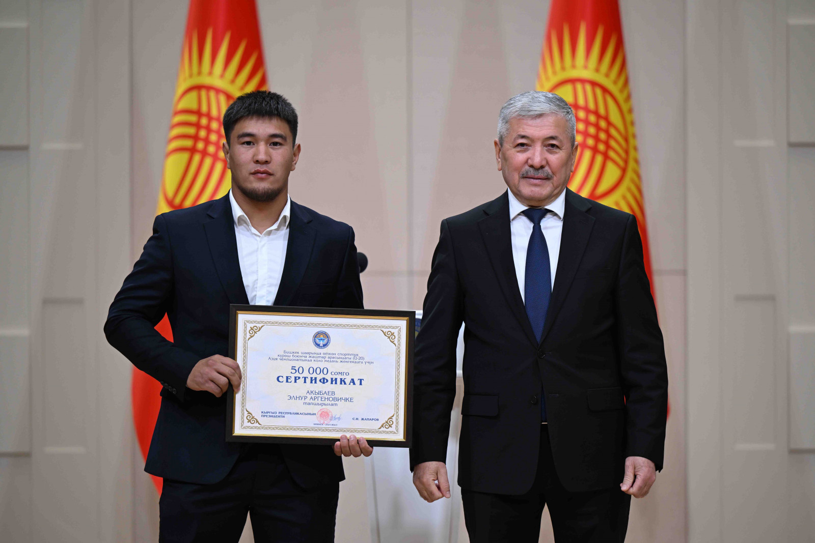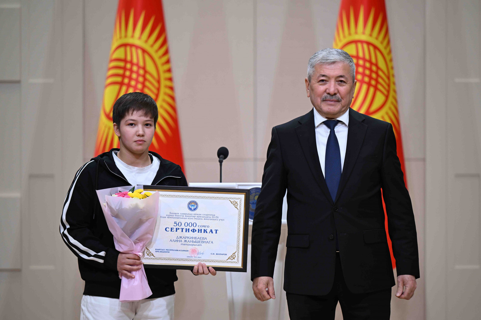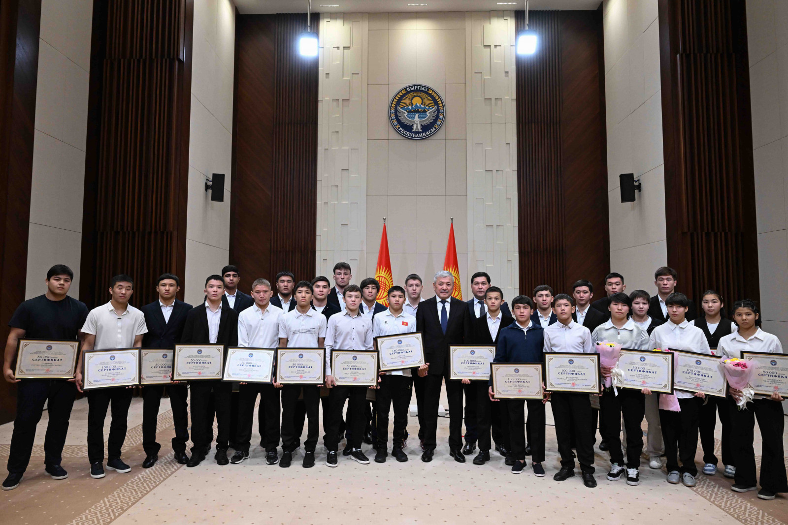 Бишкек, Ынтымак Ордо, 2025-жылдын 14-октябрь - Кыргыз Республикасынын Министрлер Кабинетинин Төрагасы - Кыргыз Республикасынын Президентинин Администрациясынын Жетекчиси Адылбек Касымалиев Кыргыз Республикасынын Президентинин атынан грек-рим, эркин жана кыз-келиндер күрөшү боюнча 15 жана 20 жашка чейинки спортчулар арасындагы Азия чемпионатынын жеңүүчүлөрүнө сертификаттарды тапшырды.