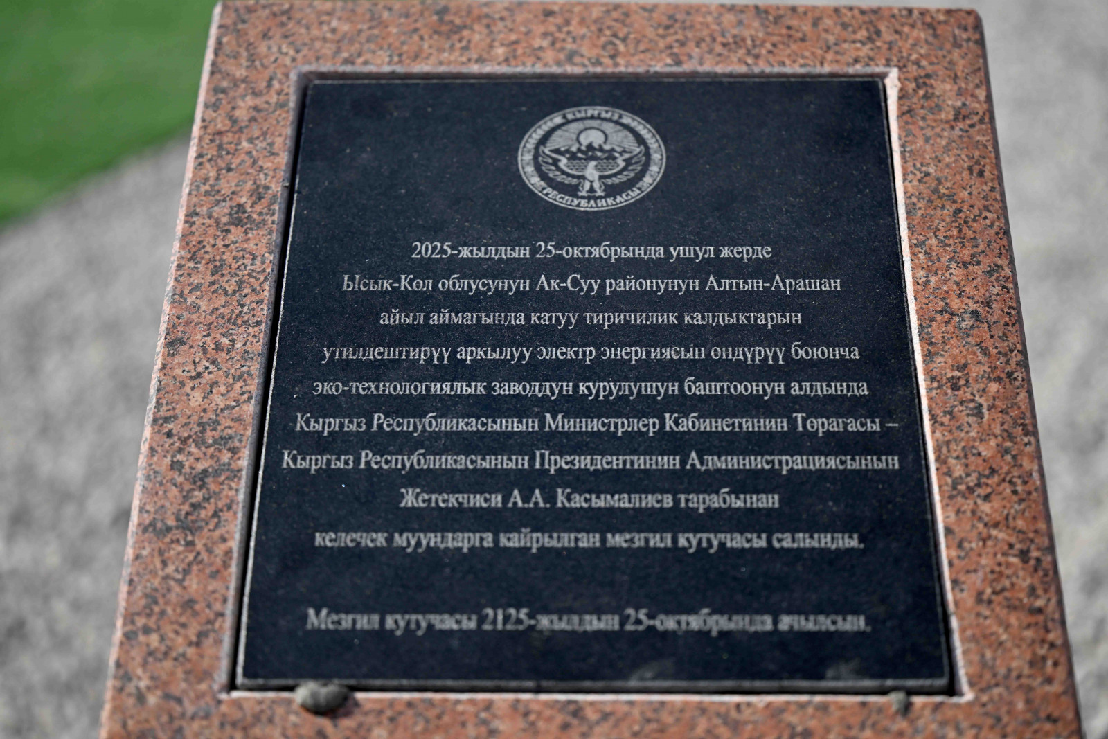 Кыргыз Республикасынын Министрлер Кабинетинин Төрагасы – Президенттин Администрациясынын Жетекчиси Адылбек Касымалиев Ысык-Көл облусуна болгон жумуш сапарынын алкагында, Каракол шаарынын таштанды калдыктарын технологиялык жол менен жок кылуучу заводдун курулушуна мезгил кутучасын салуу аземине катышты.