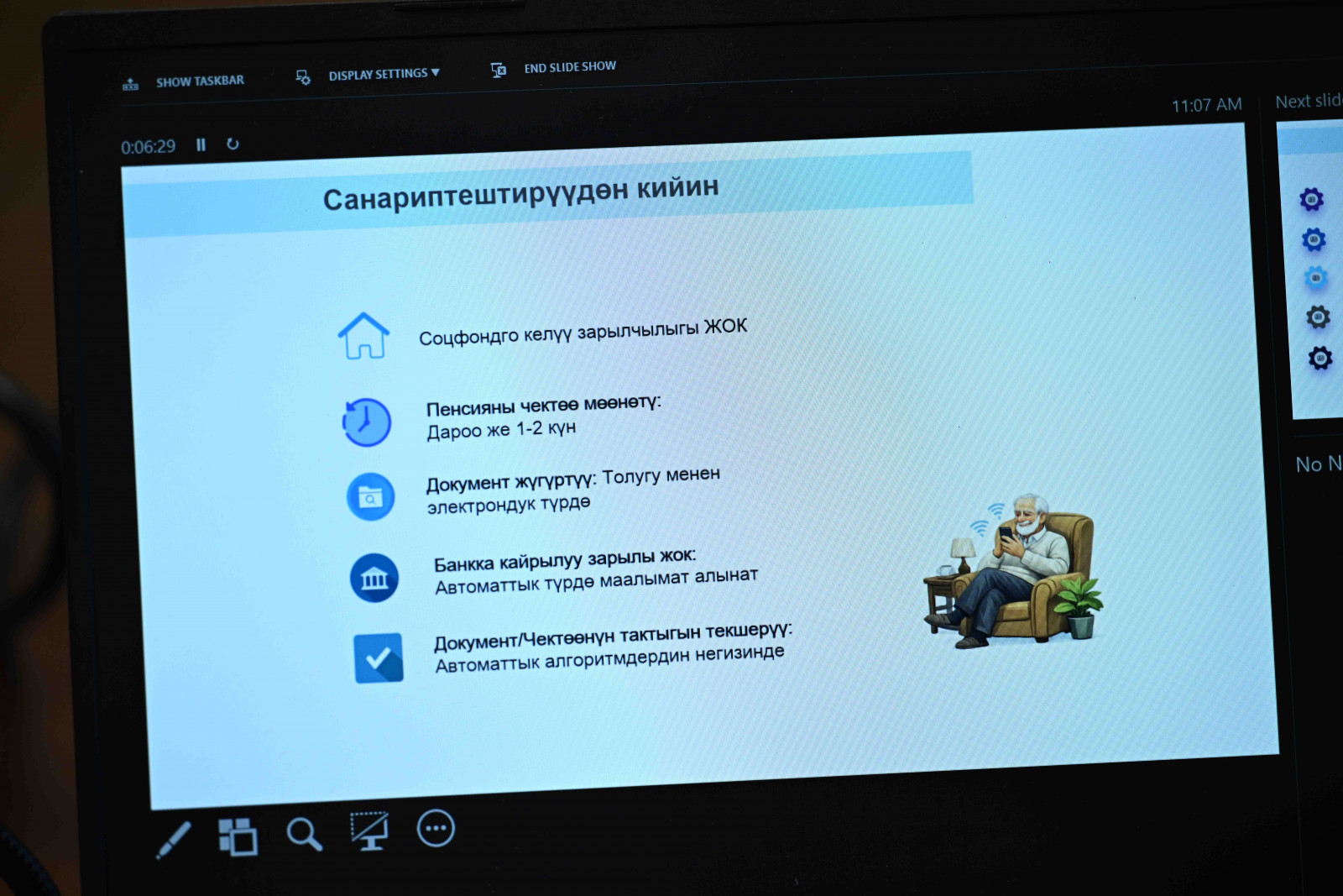 Жолугушуунун жүрүшүндө Министрлер кабинетинин башчысына өлкөнүн пенсиялык системасын реформалоонун негизги этабы болуп саналган Социалдык фонддун жаңы автоматташтырылган маалыматтык системасы тааныштырылды. Белгиленгендей, автоматташтырылган система Социалдык фонддун ишин модернизациялоого жана натыйжалуулугун жогорулатууга, калкты тейлөөнүн сапатын жакшыртууга, ошондой эле маалыматтарды иштеп чыгуу убактысын кыскартууга жана коррупциялык тобокелдиктерди жоюуга өбөлгө түзөт.